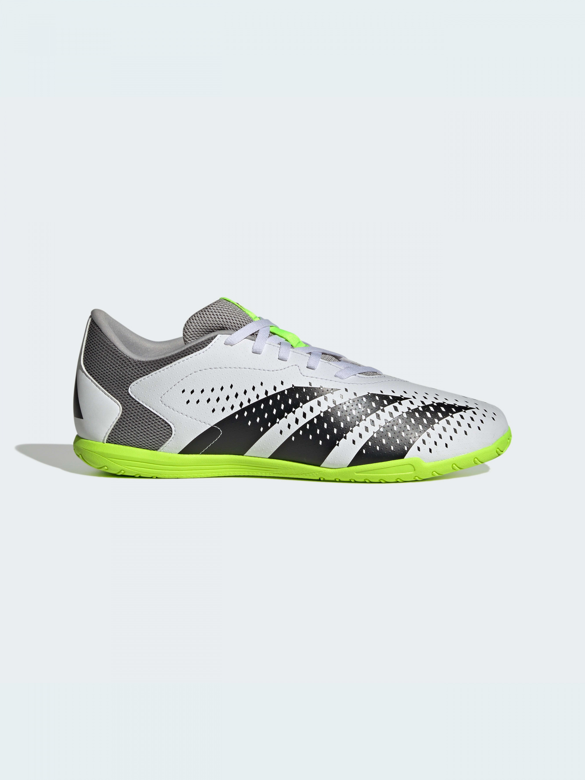 У верхній кут. У нижній кут. В усі кути. adidas Predator Accuracy створені для забивання голів, тому ти знаєш, що м'яч опиниться в сітці. Найприємніше - вибрати, як він туди потрапить. Зручний синтетичний верх цих футбольних бутс має злегка текстуроване оздоблення та сітчастий задник, щоб зберегти прохолоду під час швидких матчів. Немарка підошва розроблена для того, щоб ти міг впевнено триматися на рівній поверхні в приміщенні. Верх цієї моделі на 50% складається із перероблених матеріалів і представляє одне з наших рішень зі скорочення пластикових відходів.