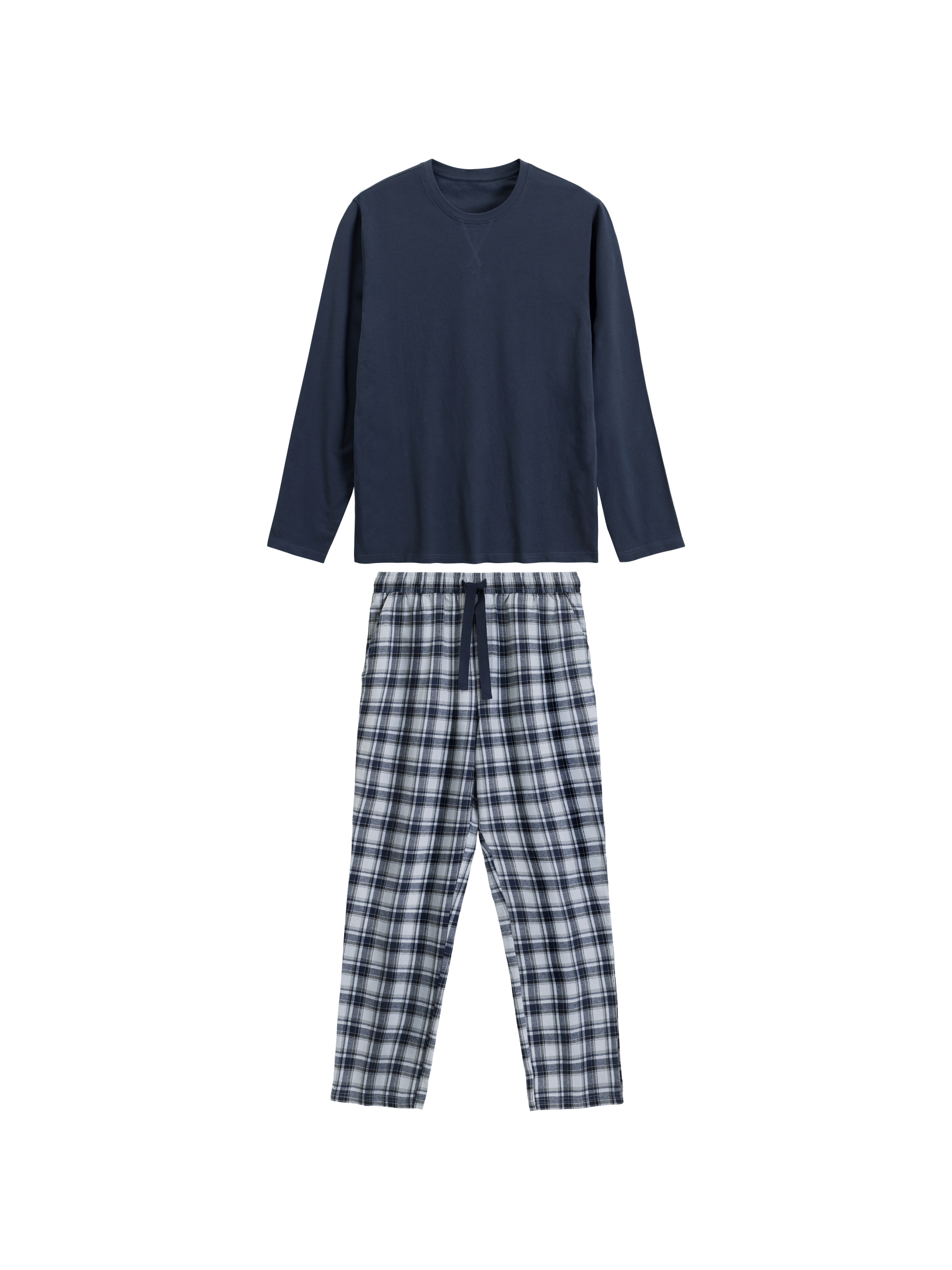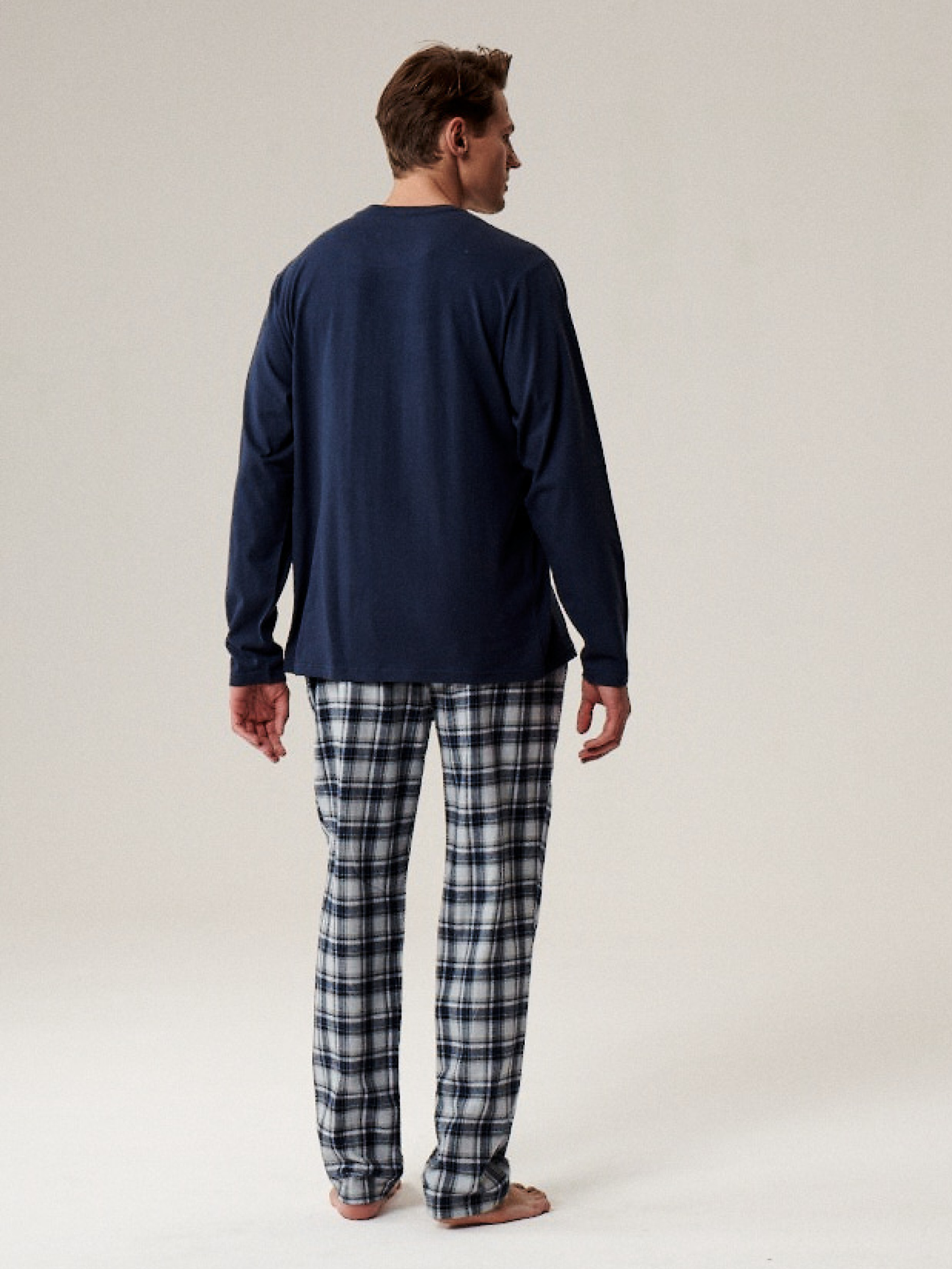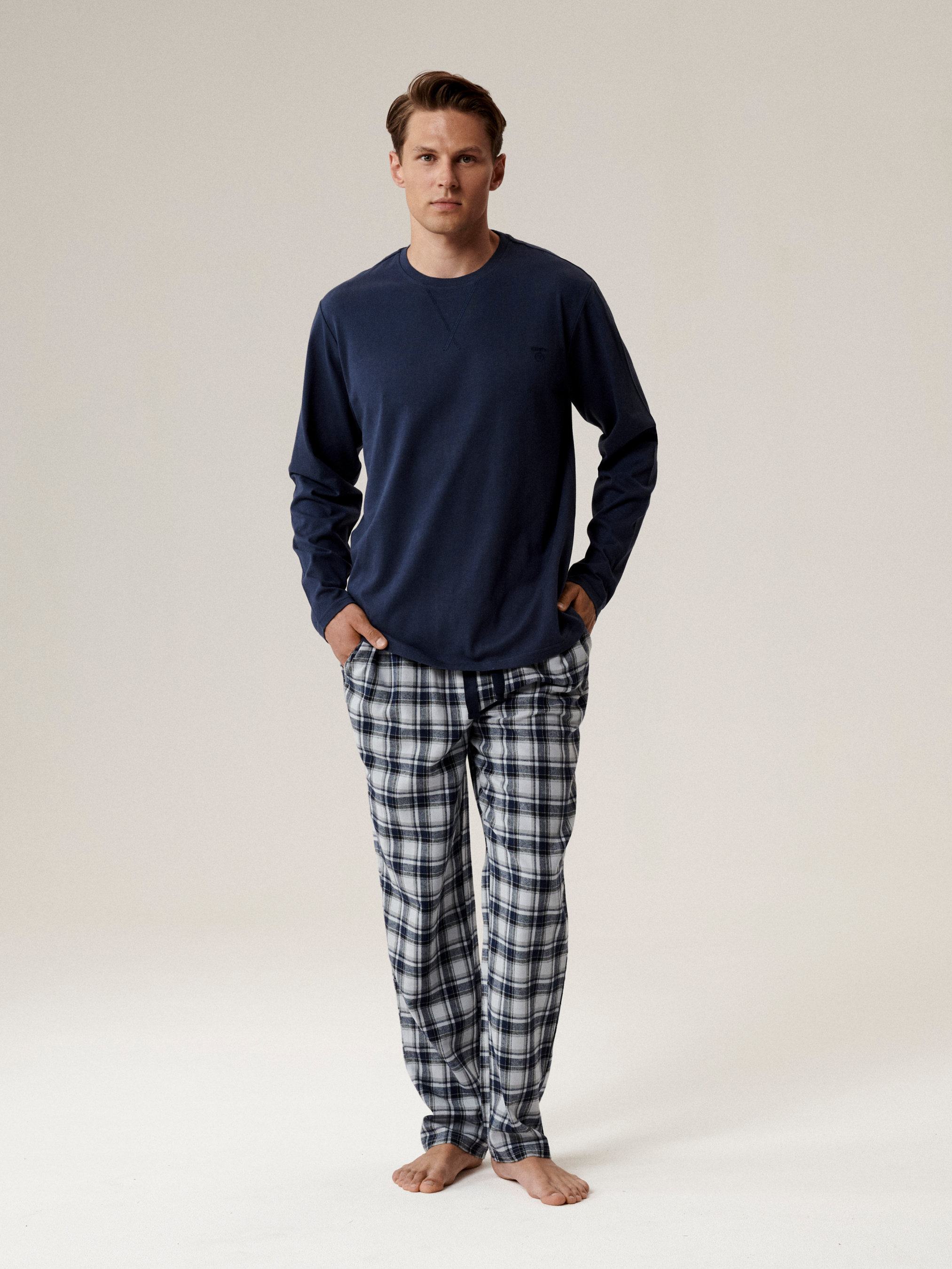 Чоловіча піжама Atlantic - комфорт та затишок для сну та домашнього відпочинку. Модель виконана зі 100% натуральної бавовни, яка м'яко прилягає до тіла, забезпечує хорошу повітропроникність та створює приємне відчуття тепла. Комплект складається з однотонного трикотажного лонгсліву прямого крою та класичних картатих фланелевих штанів. Жіночий лонгслів прямого крою забезпечує свободу рухів, а штани з м'якою резинкою по талії і зручним шнурком створюють комфортну посадку. Чоловіча піжама Atlantic ідеально підходить для затишних вечорів будинку та спокійного сну, поєднуючи практичність, стиль та натуральні матеріали.