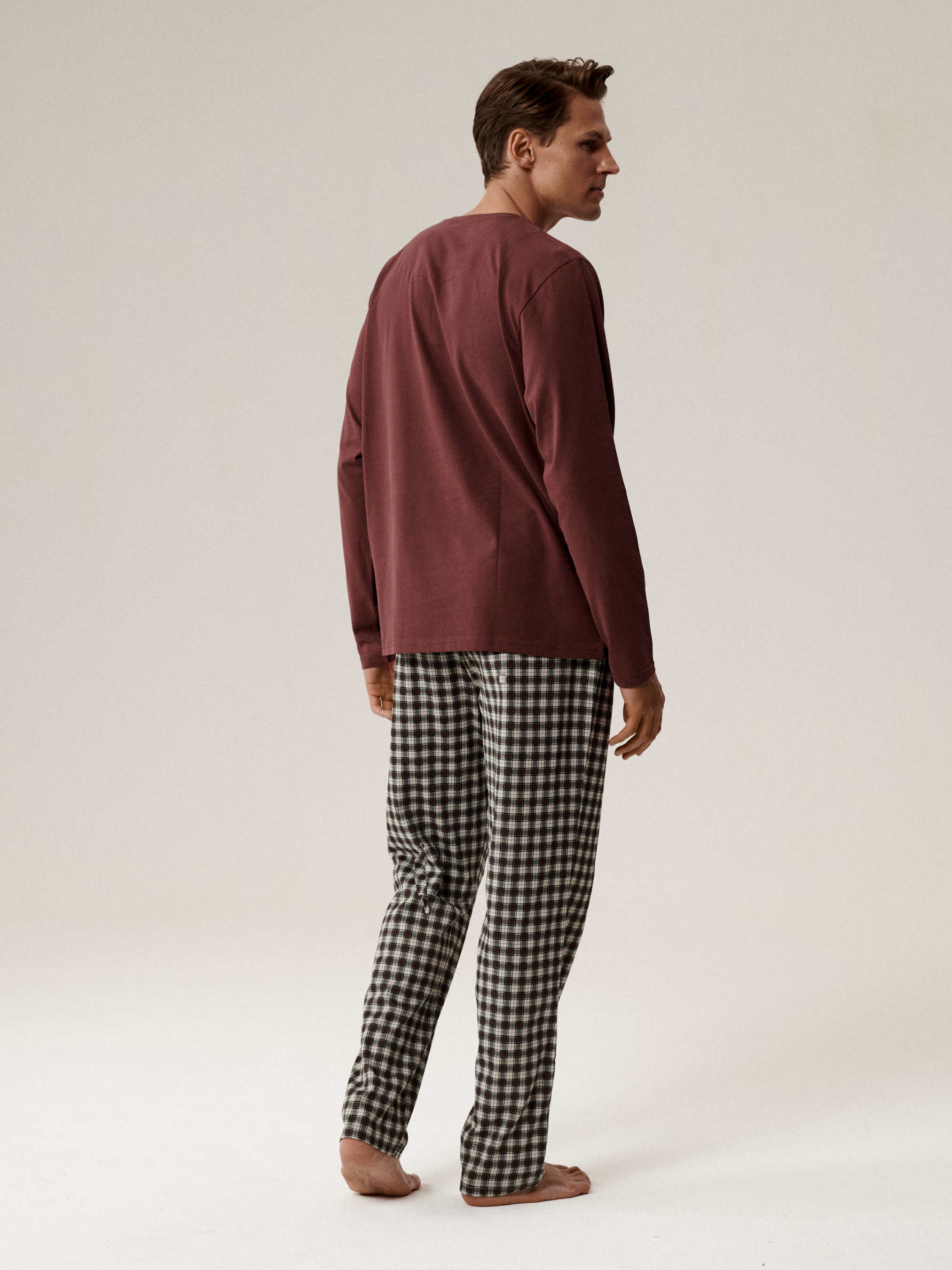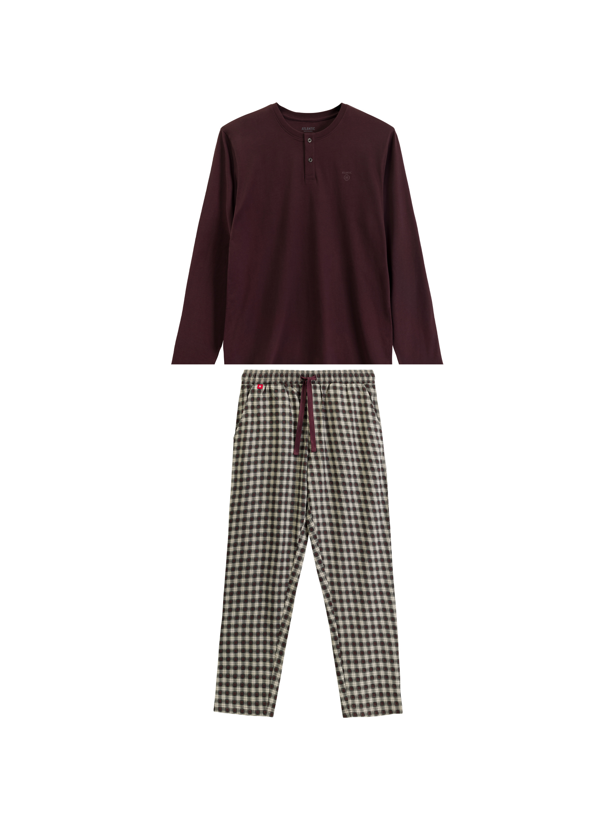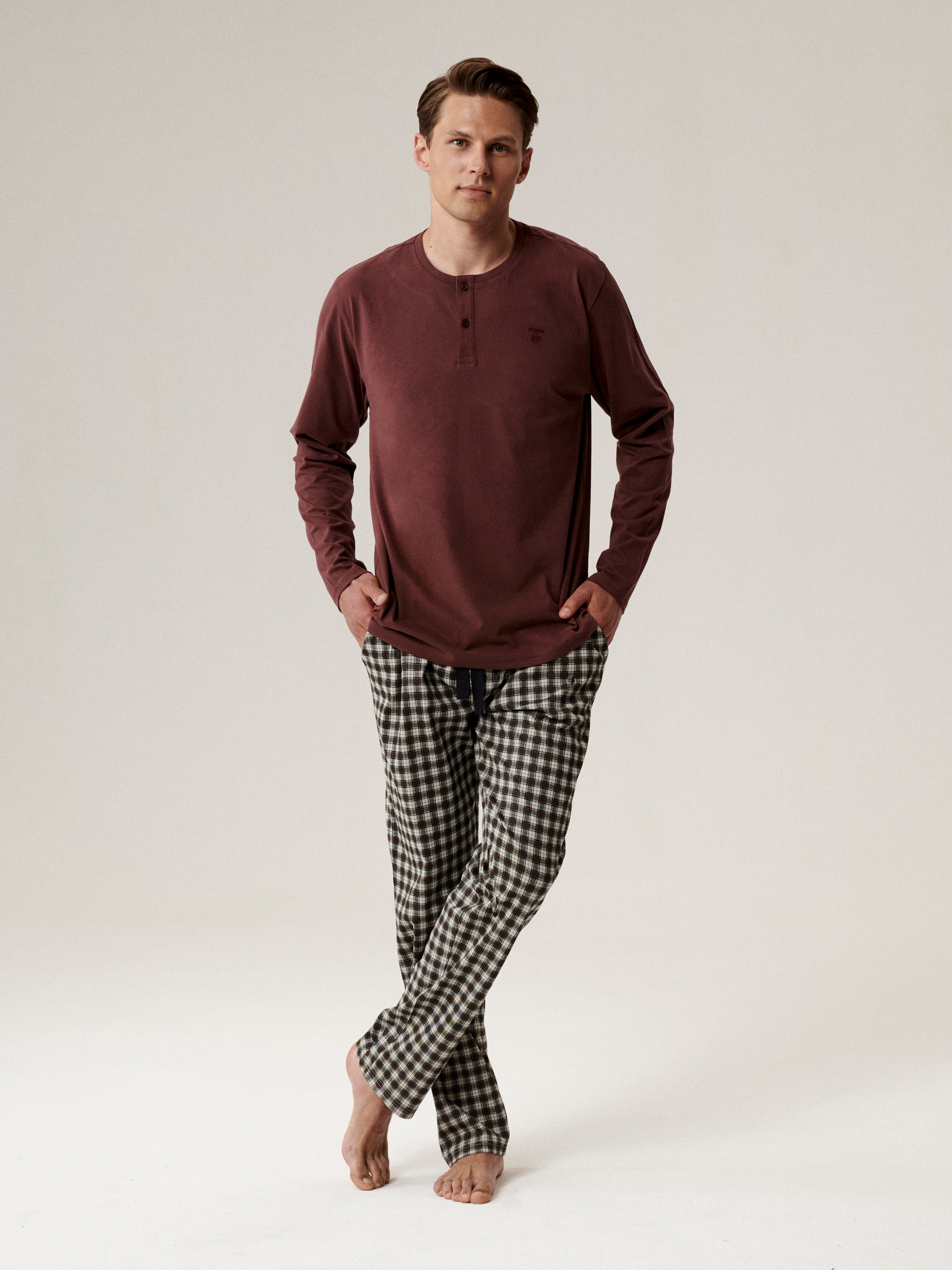 Чоловіча піжама Atlantic – поєднання комфорту, якості та лаконічного стилю. Модель виконана зі 100% натуральної бавовни, яка забезпечує приємні тактильні відчуття, вільну циркуляцію повітря та комфорт під час сну. У комплект входить бордовий лонгслів прямого крою з круглим вирізом і планкою на двох ґудзиках - мінімалістичний, але виразний елемент дизайну. Штани прямого крою виконані в клітинку сірого кольору, оснащені м'якою резинкою та шнурком для зручної посадки. Дві бічні кишені роблять модель практичною та зручною для домашнього відпочинку. Чоловіча піжама Atlantic створена для тих, хто цінує затишок, якість та продумані деталі у кожній дрібниці.