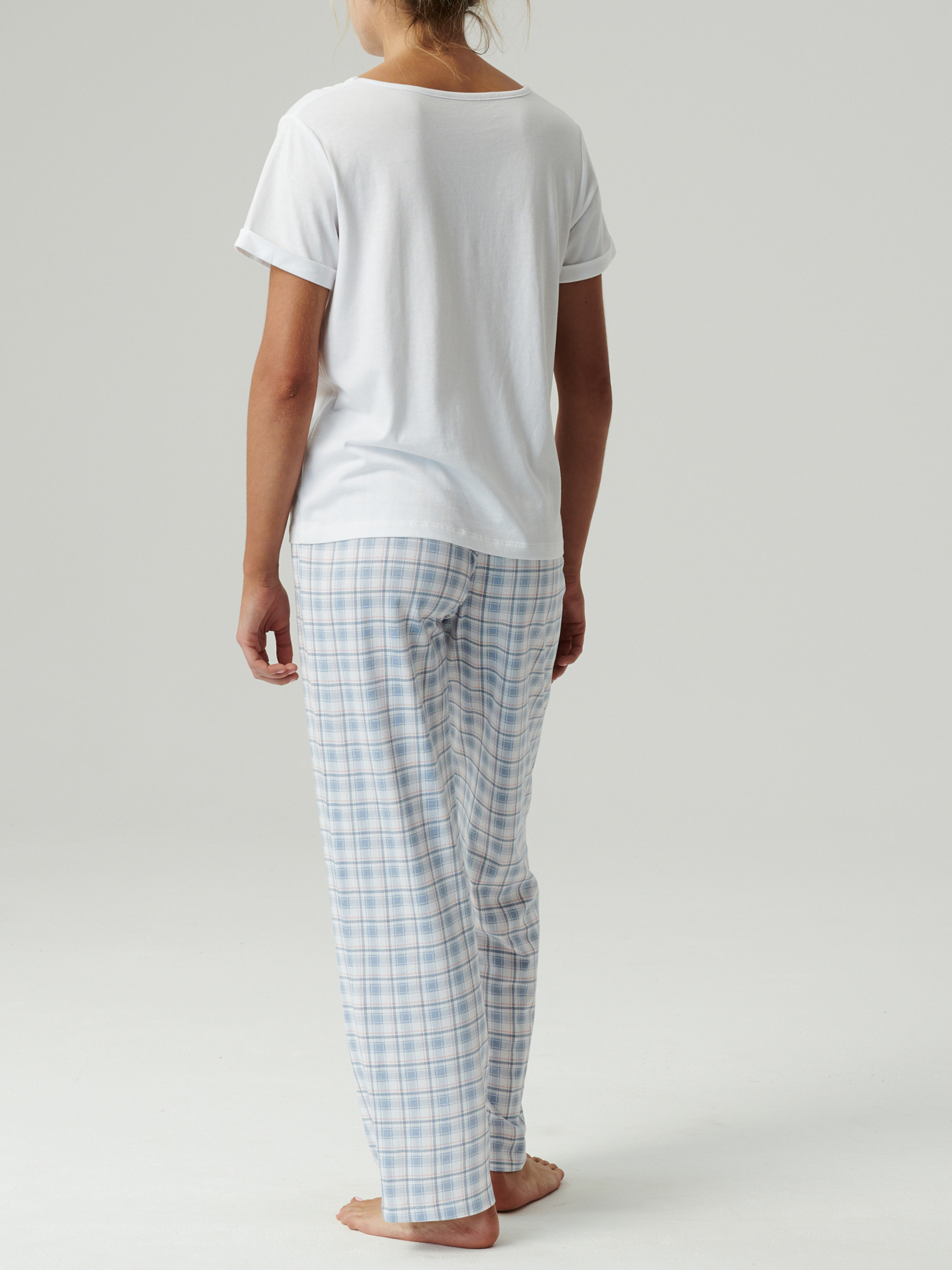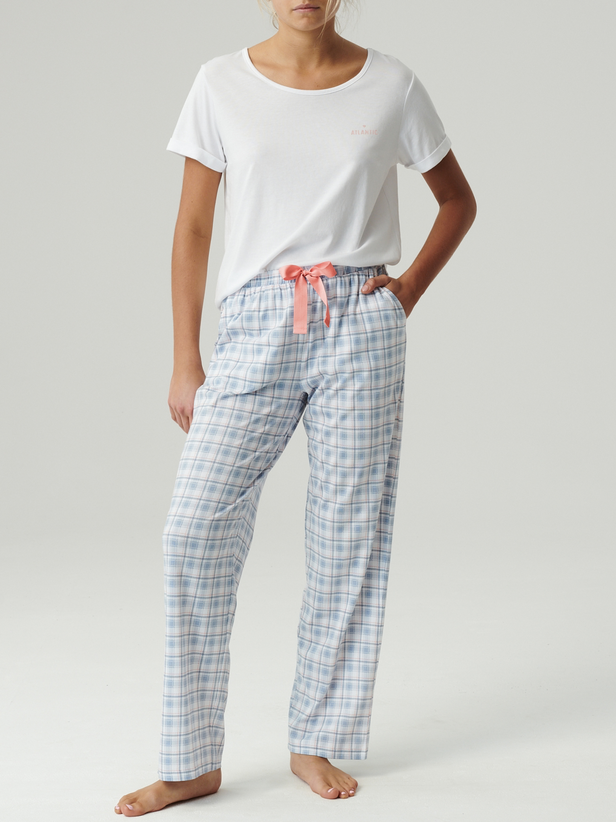 Жіночий домашній комплект – затишок та стиль на кожен день Легкий та комфортний комплект для дому, що складається з білої футболки та блакитних штанів у клітинку, стане чудовим вибором для відпочинку та сну. Футболка вільного крою – універсальна базова модель, яка дарує комфорт та свободу рухів. Штани прямого крою – зручна посадка з еластичною резинкою на поясі забезпечує комфорт протягом дня. Матеріал (50% модал, 50% бавовна) поєднує м'якість і повітропроникність натуральної бавовни з шовковистою гладкістю та зносостійкістю модалу. Тканина приємна до тіла, добре дихає і довго зберігає форму та колір. Цей комплект ідеально підійде для тих, хто цінує зручність, стиль та натуральні матеріали в домашньому гардеробі.