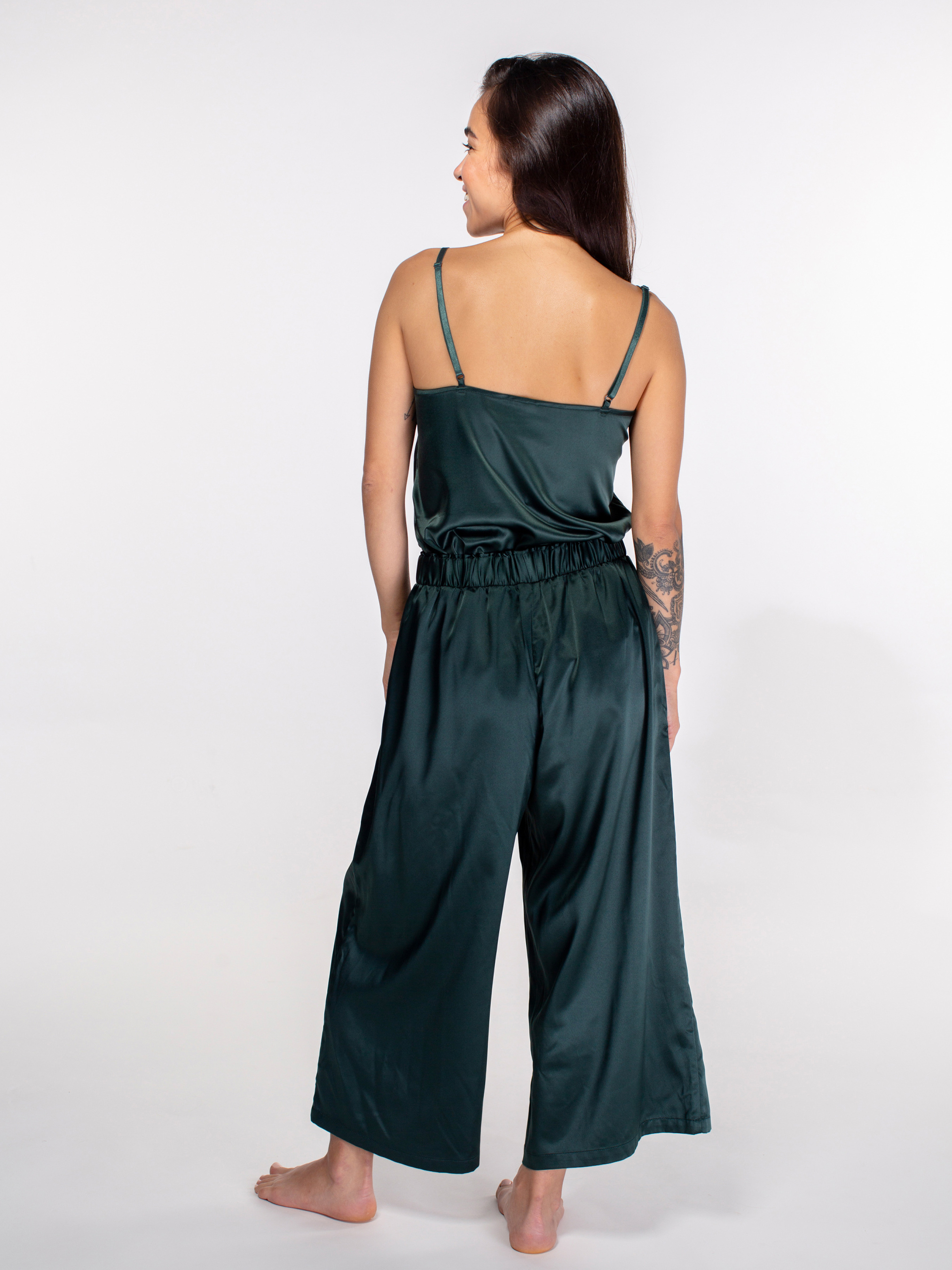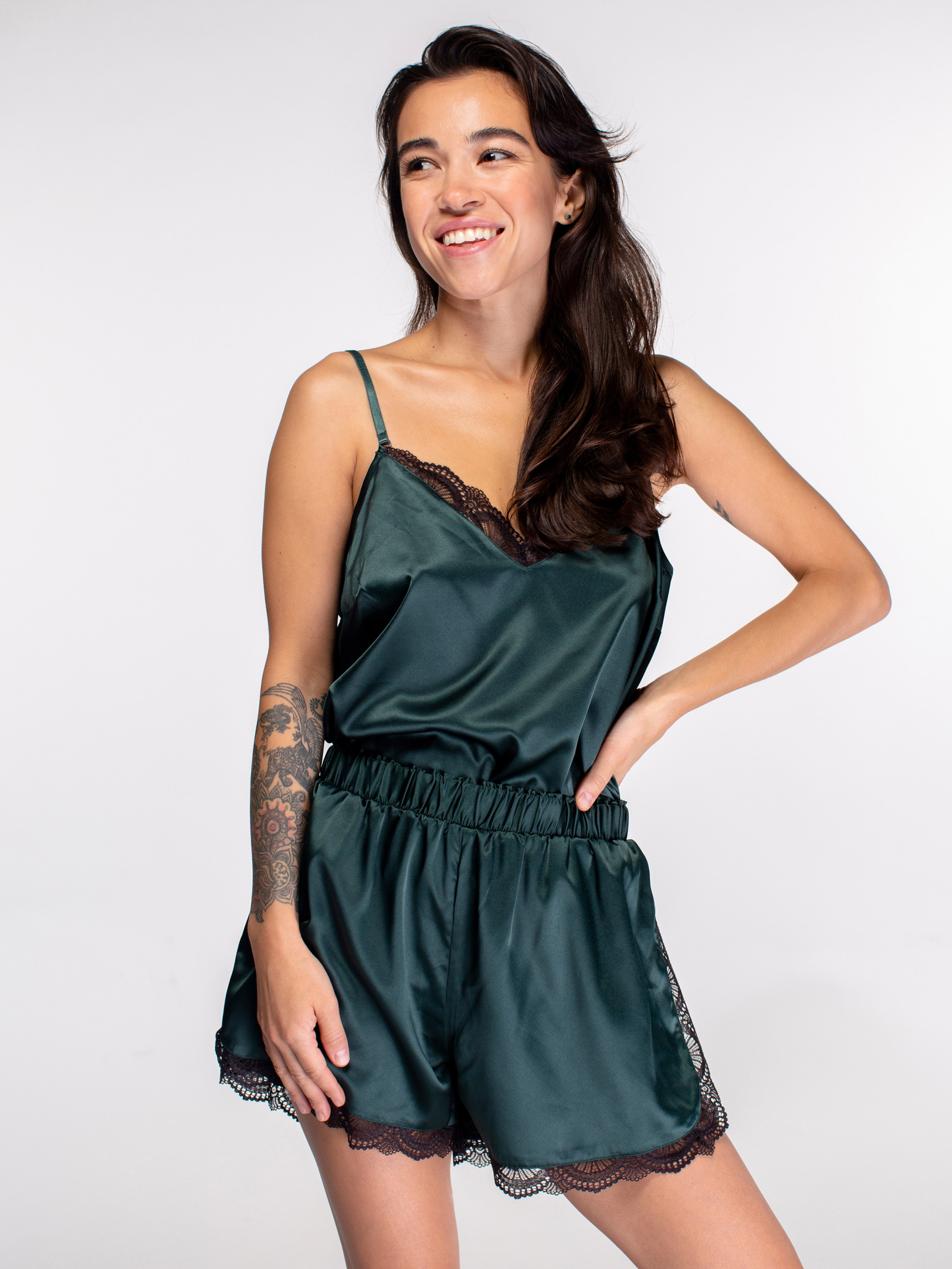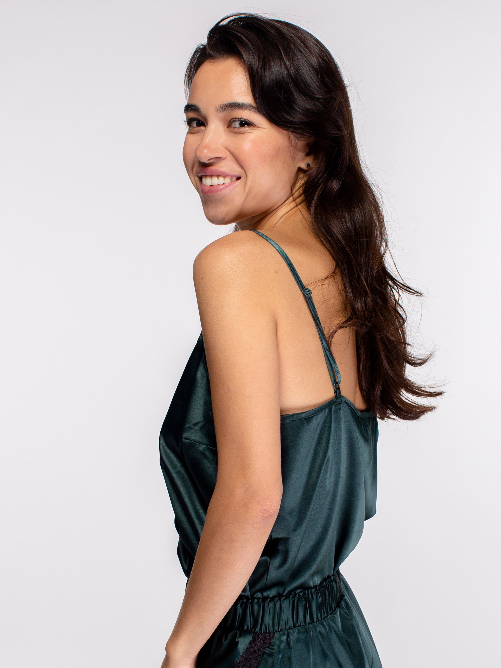 Топ на тонких регульованих бретелях із сатину стане прекрасним вибором для сну і комфортного носіння вдома, адже тканина приємна на дотик та має приємні властивості; Топ з відкритими плечима виглядає витонченим в будь-якому образі, навіть під час відпочинку вдома; Привабливий V-подібний виріз, декорований еластичним мереживом, підкреслює форму обличчя, шиї, зону декольте і плечі; Витачка на грудях виокремлює вигини, покращуючи посадку самого топа; Топ має незначне розширення до низу, і легке напівприлягання в області зони декольте, підкреслючи гнучкість форми виробу; Невеликі бічні вирізи в нижньому краї виробу не обмежують рухи та забезпечують комфортом при різних активностях.