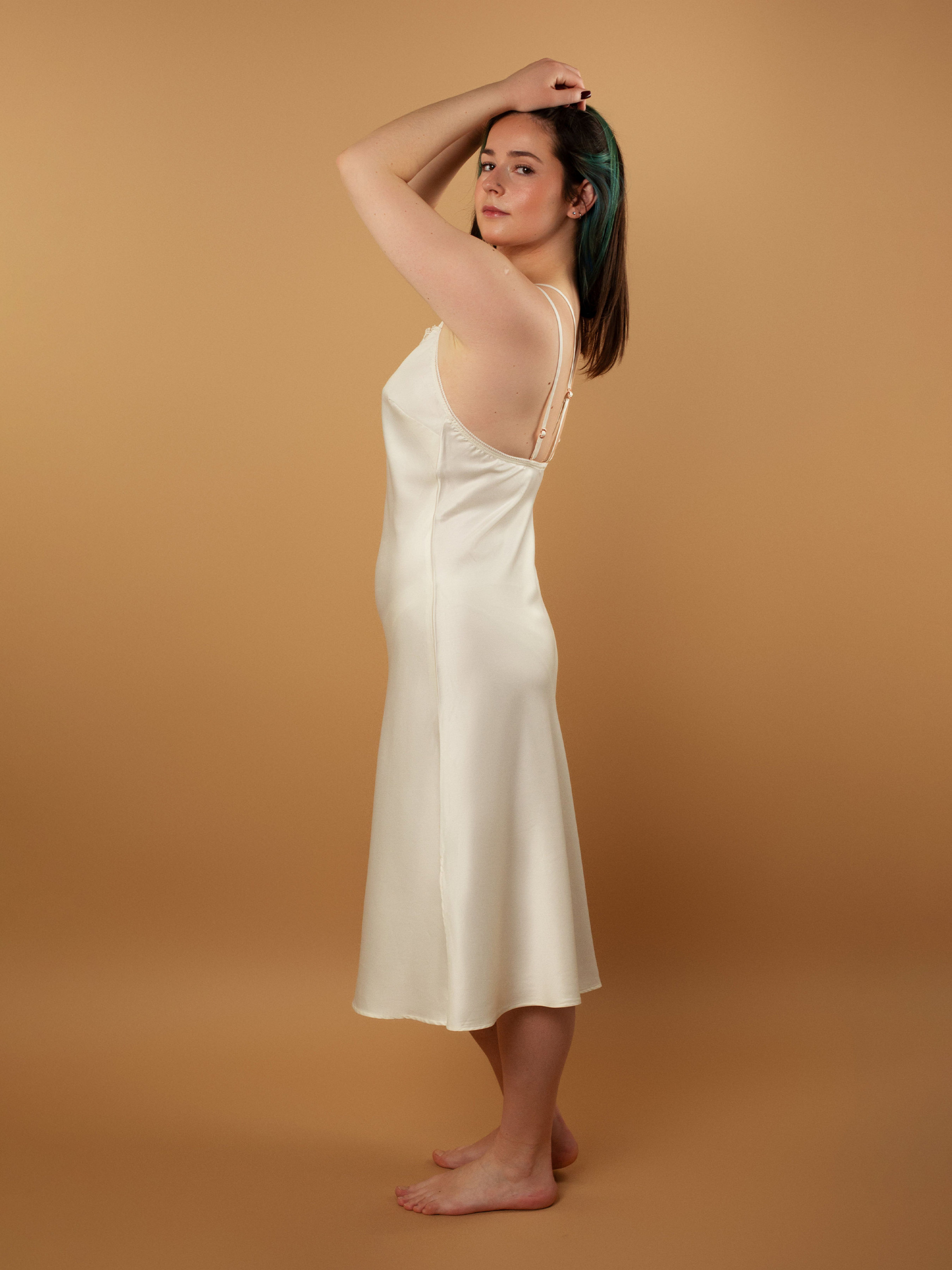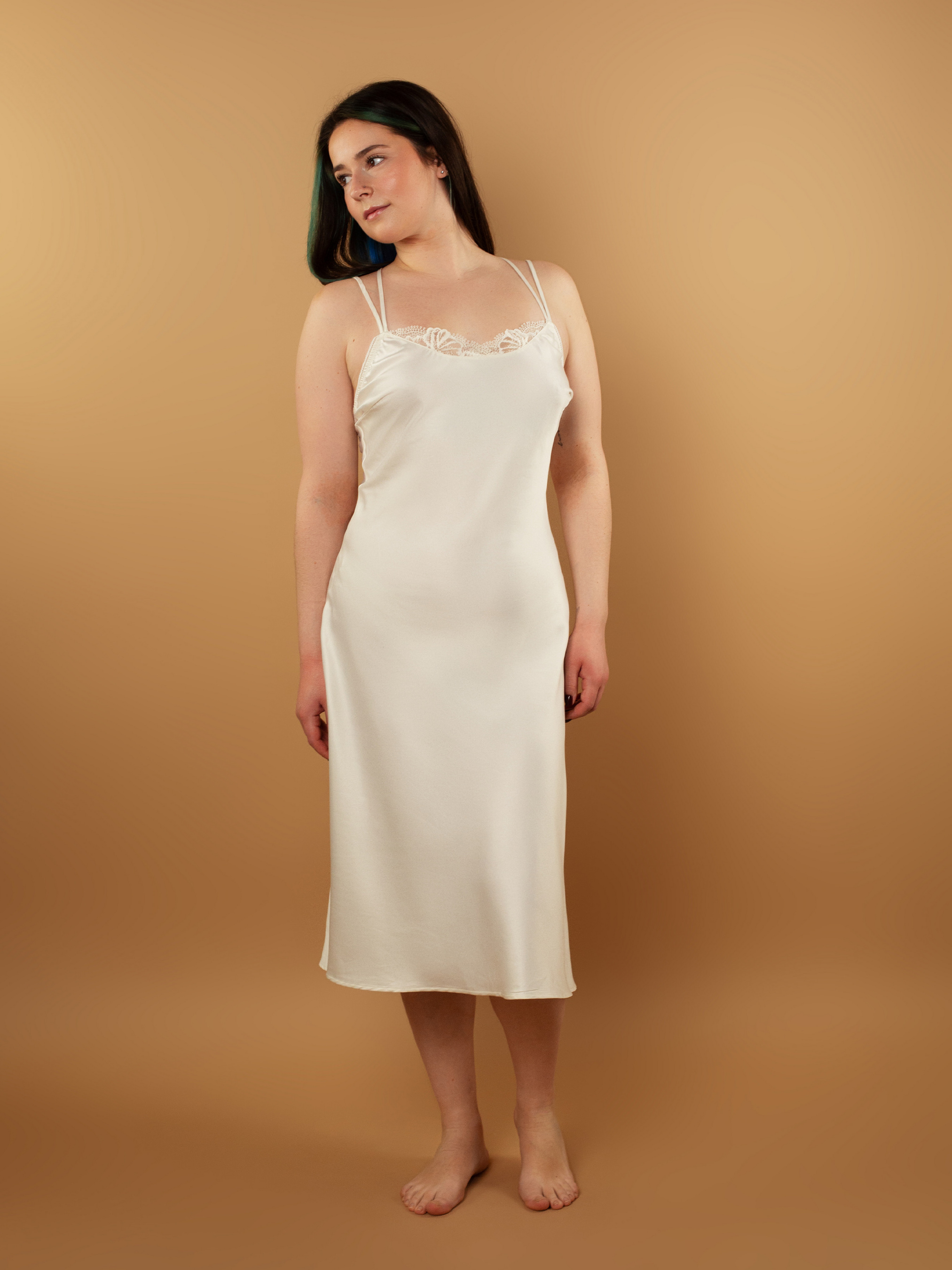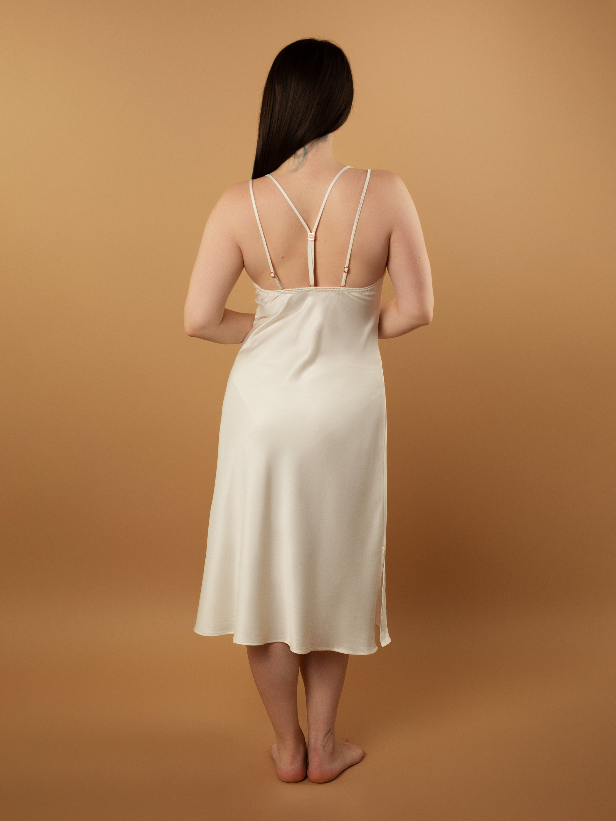 - Сорочка прямого крою із сатинового полотна в поєднанні з мереживом; - Довжина – нижче коліна; - Основне полотно – сатин, який зберігає тепло та пропускає повітря; - У зоні декольте сорочки красивий U-подібний виріз, що декорований нееластичним мереживом; - Горизонтальні виточки на грудях дозволяють сорочці краще сідати по фігурі; - Тонкі регульовані бретелі допоможуть скоригувати висоту посадки на тілі; - Особливістю моделі є розташування самих бретелей: вони подвійні, дві бретелі розташовані як зазвичай, а ще дві поєднуються на спині між собою та мають окремий регулятор; - Нижній край сорочки оброблений технологією "плаский шов", це забезпечує легку та комфортну посадку; - Знизу сорочки з обох боків є невеликі розрізи, що дозволять вільно рухатись; - Металева фурнітура брендована, кольору "рожеве золото". Склад: - Сатин: 100% поліестер; - Мереживо: 100% поліестер.