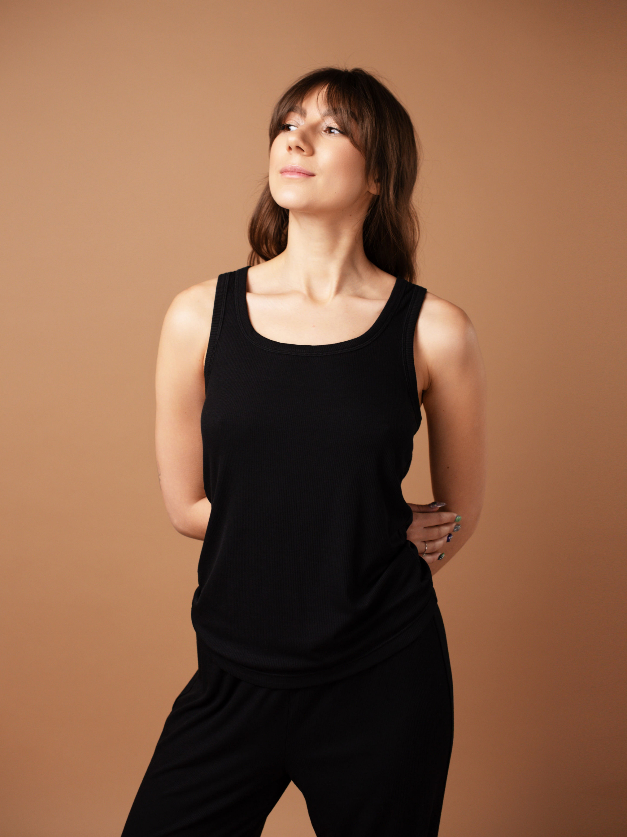 - Майка з широкими бретелями із м'якого полотна в рубчик; - Полотно – район – виготовлене з деревної целюлози бамбуку і є екологічно чистим; - За рахунок полотна вироби м’які та приємні на дотик, через його ворсистість допустима пілінгація; - Краї майки оброблені еластичною тасьмою, що викроєна із основного полотна, вона надійно зафіксує її на тілі без перетискань; - Дуже зручна у щоденному носінні, в ній можна спати, релаксувати вдома чи навіть одягати на прогулянку; - Майку можна поєднувати зі штанами та трусиками з колекції. Склад: - Тканина: 100% район (95% віскоза, 5% еластан).