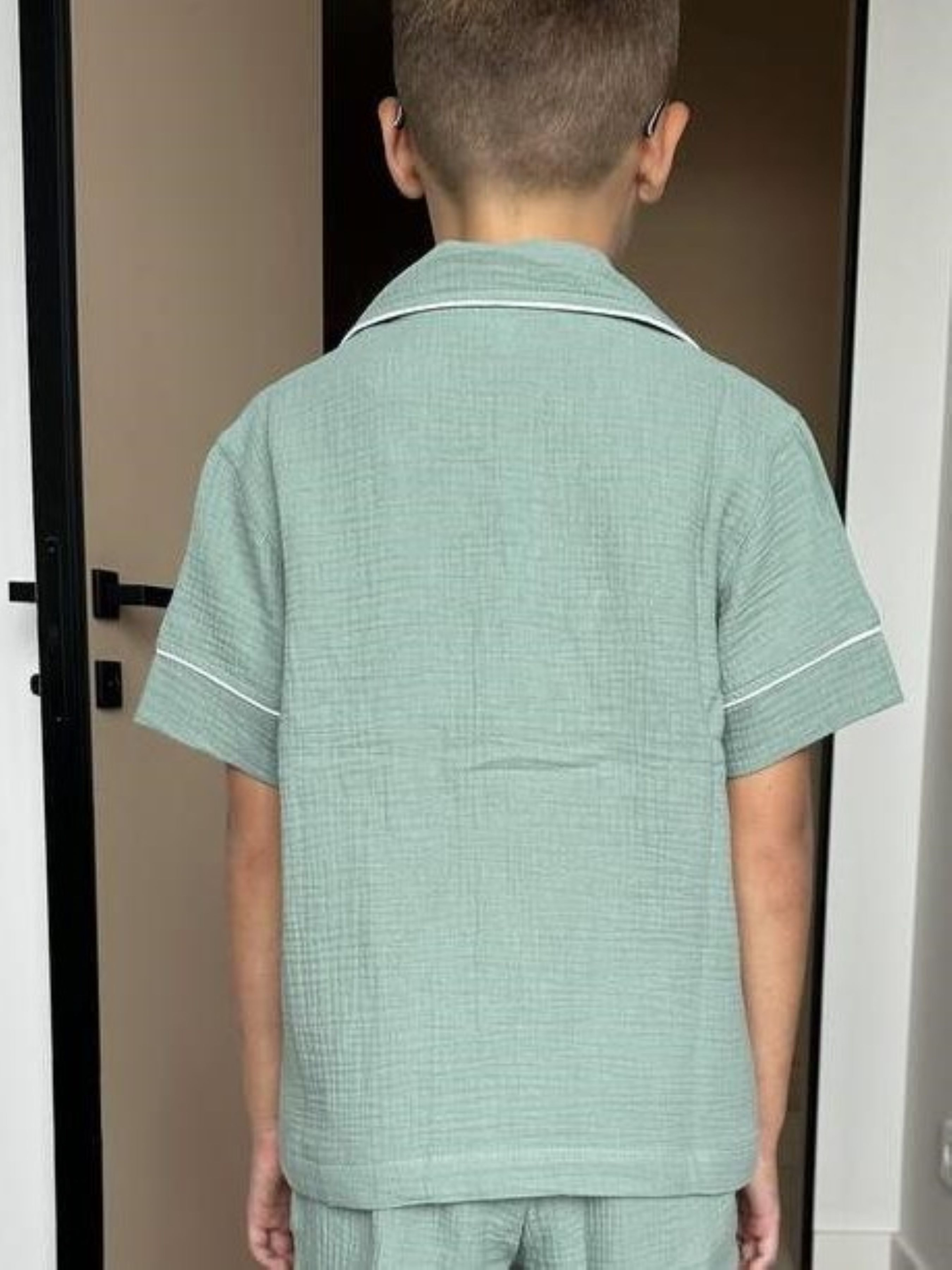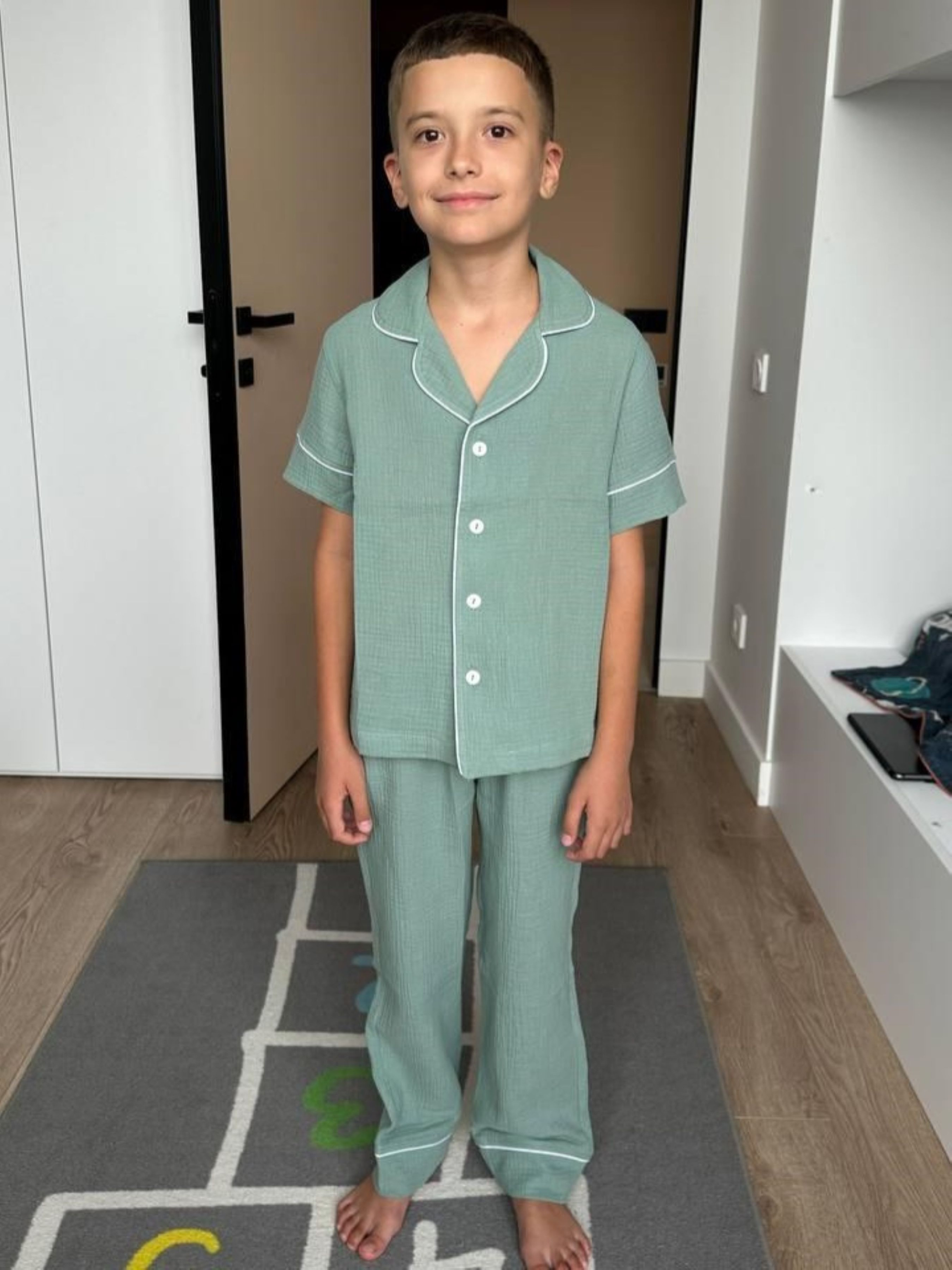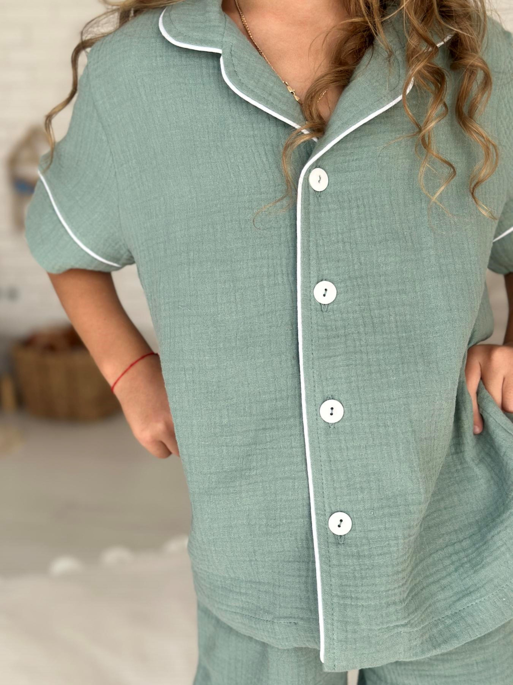Дитяча муслінова піжама VIVA — комфорт для всієї родини Піжама з серії VIVA — це м’якість і натуральність, які відчуваються в кожному дотику. Створена для дітей ростом від 116 до 146 см (приблизно від 5 до 12 років), ця піжама дарує свободу рухів та затишок під час сну й ігор. M -116-122 L - 128-134 XL -140-146 Комплект: сорочка з коротким рукавом на ґудзиках + штани з еластичною резинкою та кулискою для регулювання Колір: натуральний евкаліпт — спокійний і універсальний Тканина: двошаровий муслін з 100% бавовни — дихаючий, м’який і гіпоалергенний Особливості моделі: - Еластична резинка та кулиска на штанах для ідеальної посадки - Манжети на штанах із можливістю підвороту — піжама росте разом із дитиною - Декоративний кант додає стильний та охайний вигляд Сорочка на ґудзиках із коротким рукавом — комфортна у теплій порі або при комфортній температурі в домі Муслін — натуральний і дихаючий матеріал, що піклується про шкіру малюка Піжама VIVA — частина сімейної колекції, у якій є аналогічні моделі для дорослих. Тепер ваша родина може насолоджуватись затишком і гармонією в однакових піжамах, створюючи теплі сімейні традиції.
