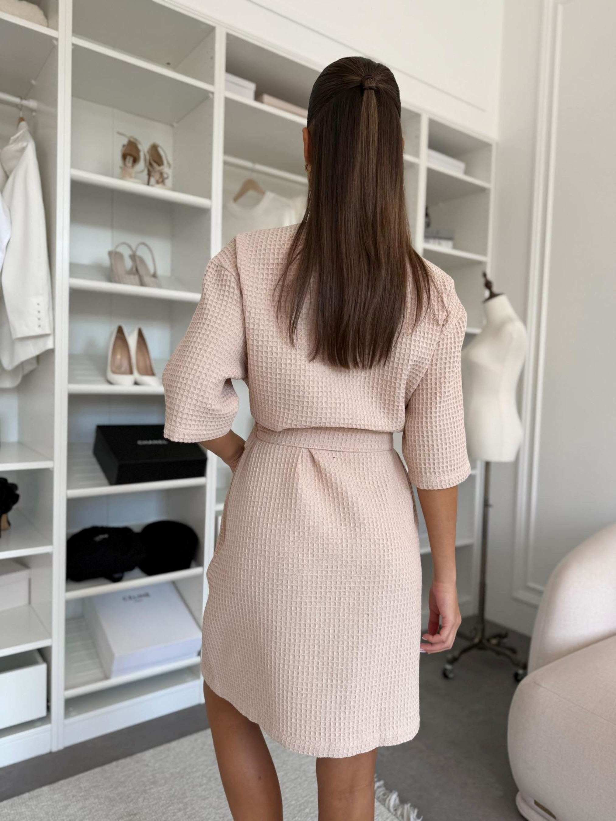 Belezza – жіночий халат-кімоно М’який текстиль, функціональні деталі та лаконічний крій створюють ідеальний баланс між красою та практичністю. Халат Belezza однаково гармонійно виглядає вдома й у спа-просторі. Він легкий, компактний, не займає багато місця у валізі чи сумці — завжди поруч тоді, коли потрібен комфорт і стиль. Це ще й безпрограшний варіант подарунка: елегантний, практичний і водночас по-справжньому особливий. Колір: ніжний відтінок теплого латте з молочною пінкою — універсальний беж, що підкреслює природну красу та дарує відчуття спокою. Фасон: халат у стилі кімоно з акцентом на легкість рухів і сучасну естетику. Тканина: 100% бавовна (Туреччина). Розміри: M, L, XL. Belezza — коли кожна мить вдома чи в подорожі перетворюється на витончену насолоду. (Зверніть увагу: тканина не декатована, після прання можливе природне ущільнення — усадка 5–6%). Рекомендації щодо догляду: - Прати у холодній воді (до 40°С), віджимання тільки на малих обертах (400). Не використовувати відбілювачі. - Природне сушіння. Рекомендується трохи розтягнути виріб під час сушіння. Прасувати при високих температурах до 200°С (режим «бавовна») з паром. Після прання вафельні клітини збираються, але після висихання та прасування вони розходяться.