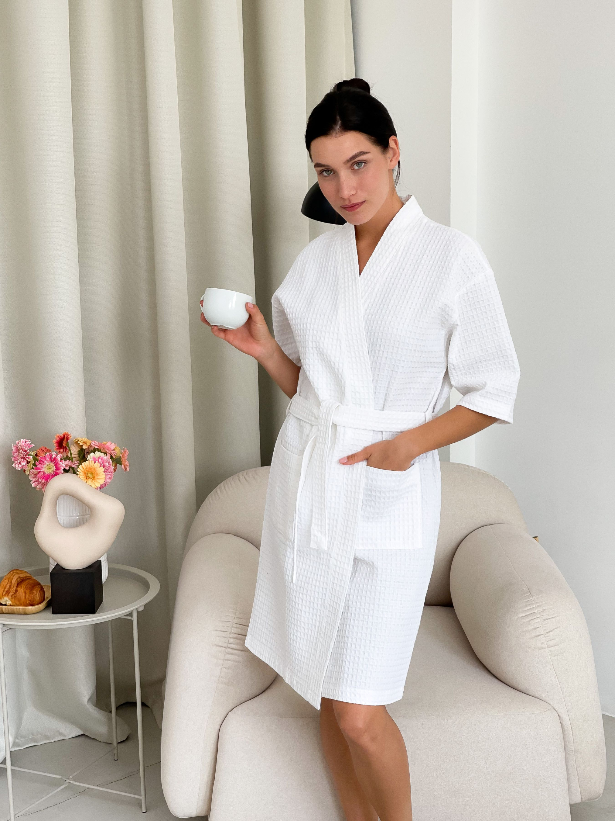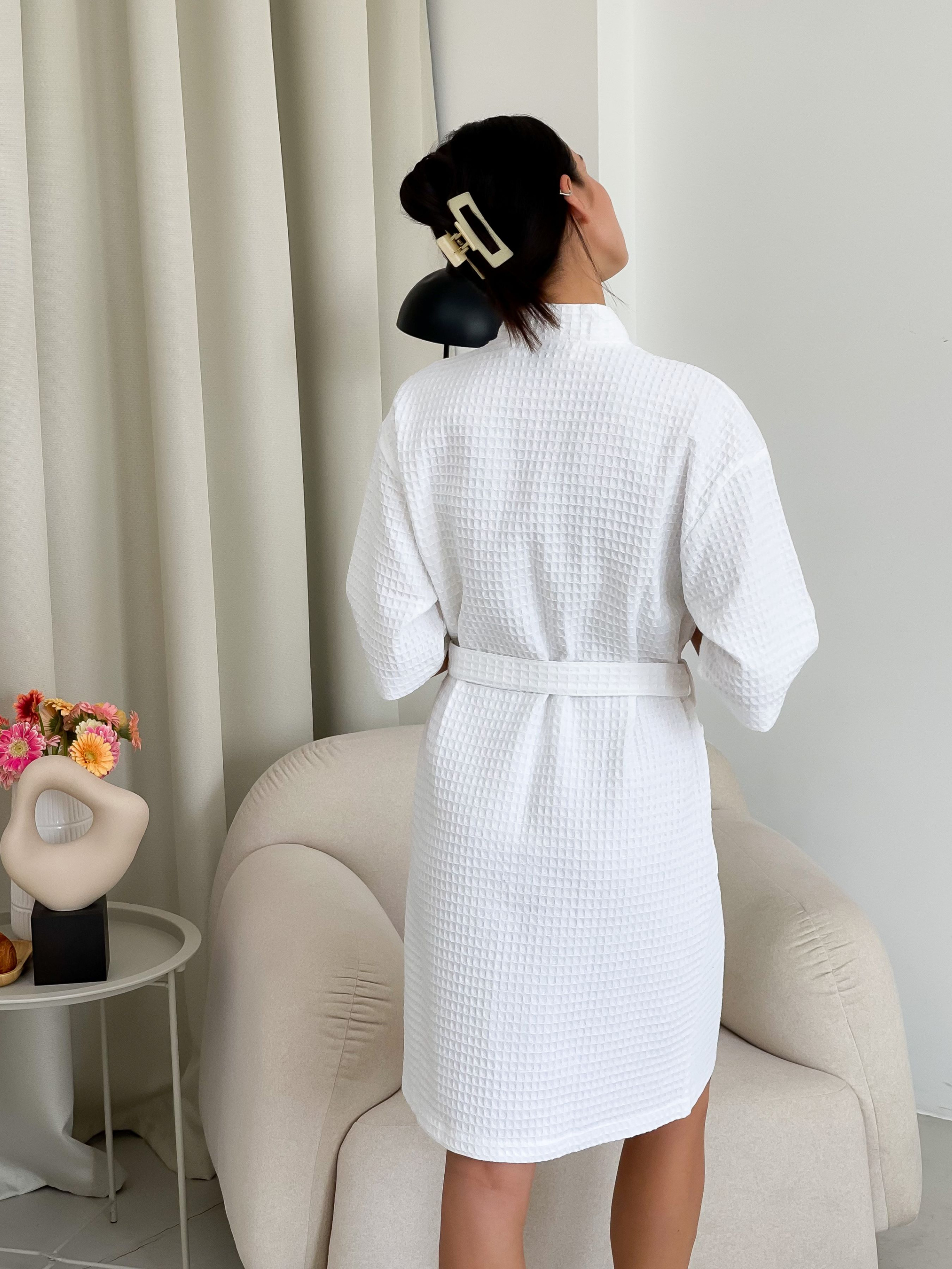 Хочете зручний та красивий халат? Це халат кімоно! Він зручний і не сковує рухів. Бавовна вмить вбирає вологу і швидко сохне, тому вафельна тканина добре обсушує тіло і зберігає тепло. Це найбільш гігроскопічний та гігієнічний одяг. Довжина халату 98 см. Тканина: 100% бавовна, Туреччина. Щільність: 220 г/м2. Колір: білий Рекомендації щодо догляду: 1. Прати в холодній воді (при температурі не вище 40°С), віджимання тільки на малих обертах 400. Не використовувати відбілювачі. 2. Природне сушіння. Рекомендується трохи розтягнути виріб під час сушіння. 3. Гладити при високих температурах до 200 ° С (режим бавовни) з парою. Після прання вафельні клітини збираються, але після висихання та прасування вони розходяться.