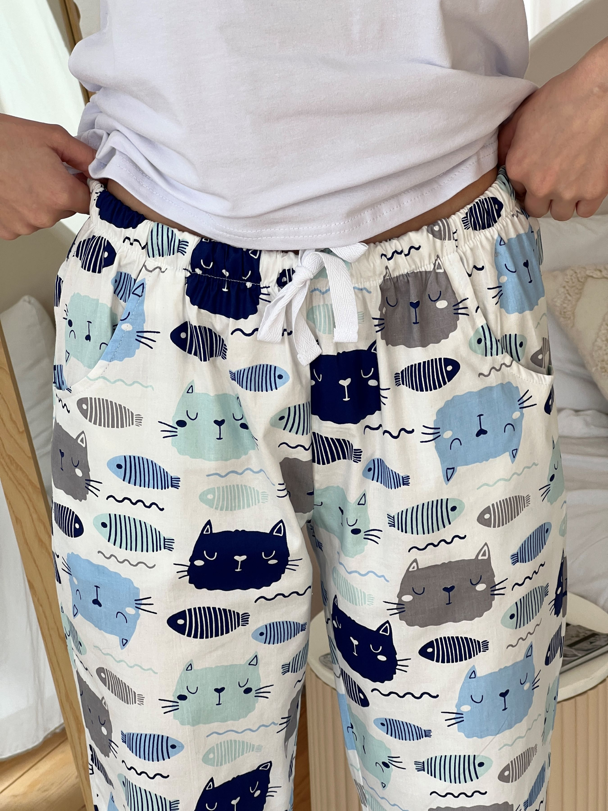 Піжамні штани із забавним принтом додадуть яскравості домашньому образу. У них можна комфортно проводити час вдома або піти спати. Натуральна тканина сатин дуже приємний на дотик, дуже ніжний, м'який, майже як шовк. Штани йдуть із кишенями, талія середньої посадки. Пояс на резинці з регульованою куліскою. Тканина: сатин 100% бавовна Щільність: 120 г/м2 Колір: молочний (котики/рибки) Футболка - 100% бавовна Кольори: білий, Розміри: s, m, l
