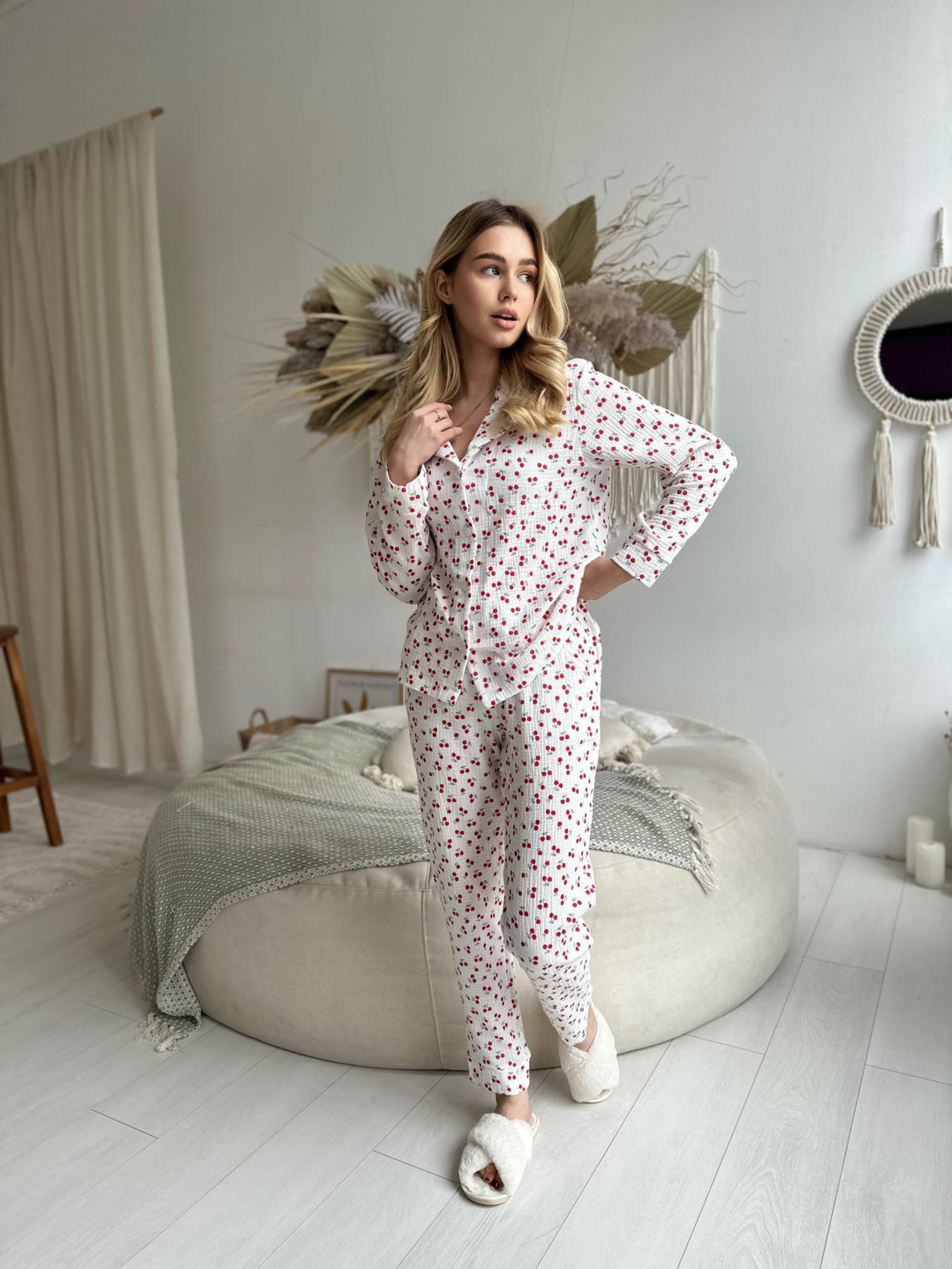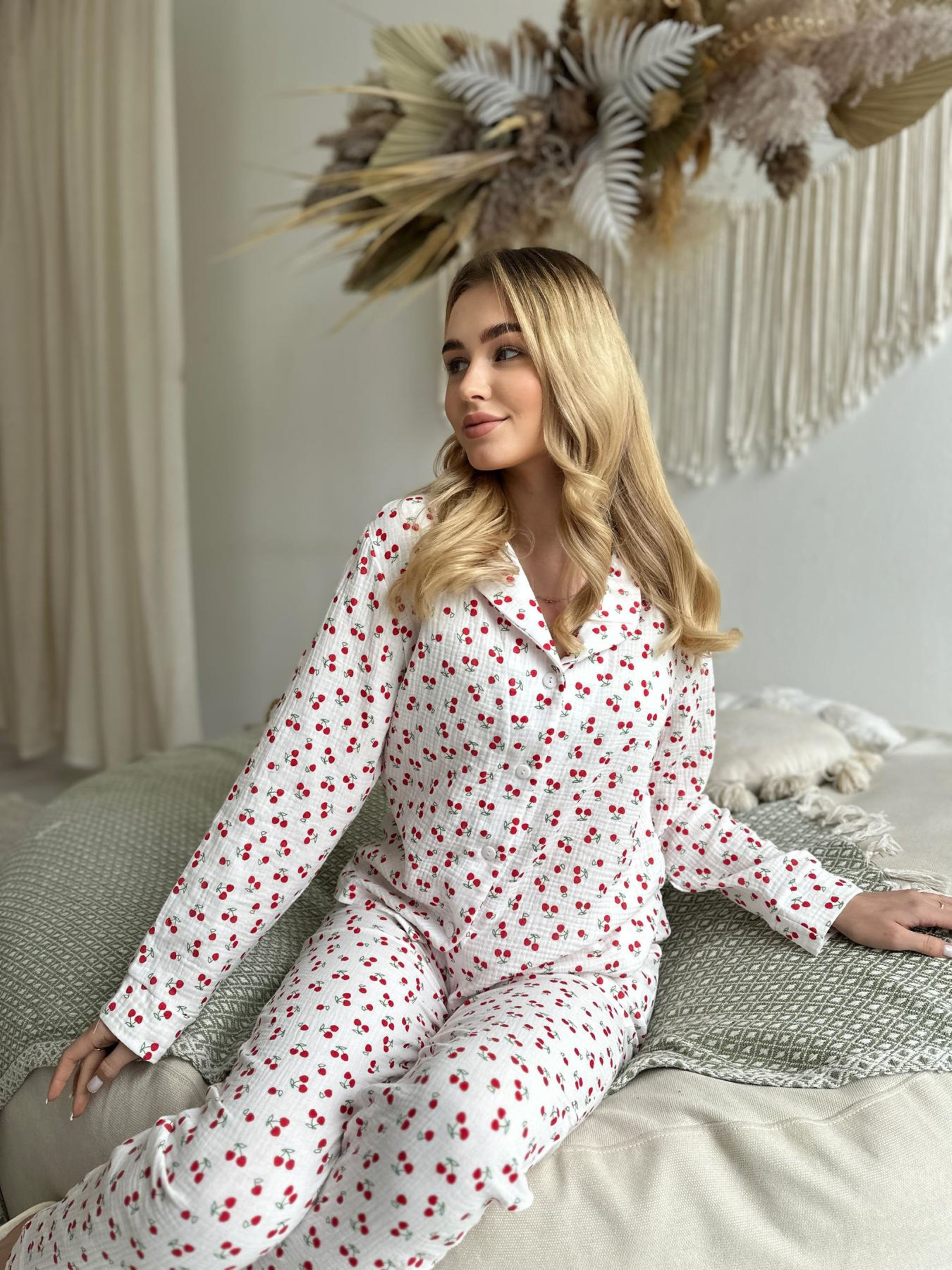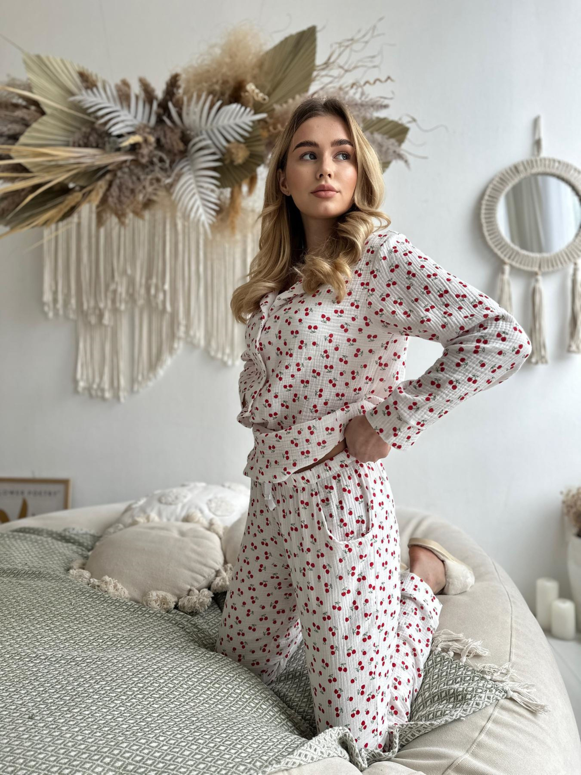 Зручна та легка піжама з мусліну. Муслін - це натуральна тканина з найнижнішої бавовни. Тканина легка та комфортна. Комплект складається: сорочка +штани. Тканина: 100% бавовна, Корея Щільність: 125 г/м2 Розміри: S, М, L Колір: Вишеньки на білому Виріб виготовлено в Україні