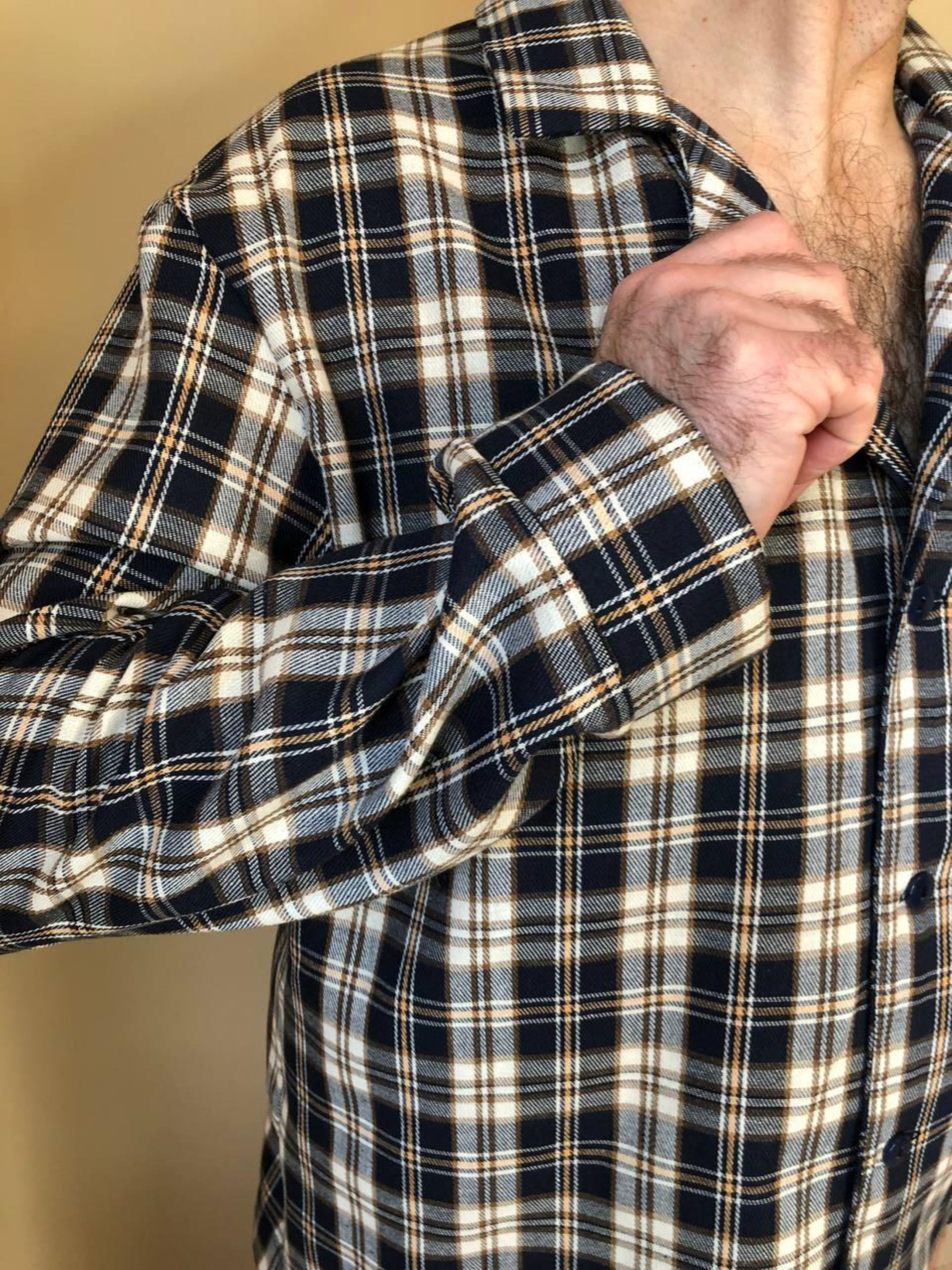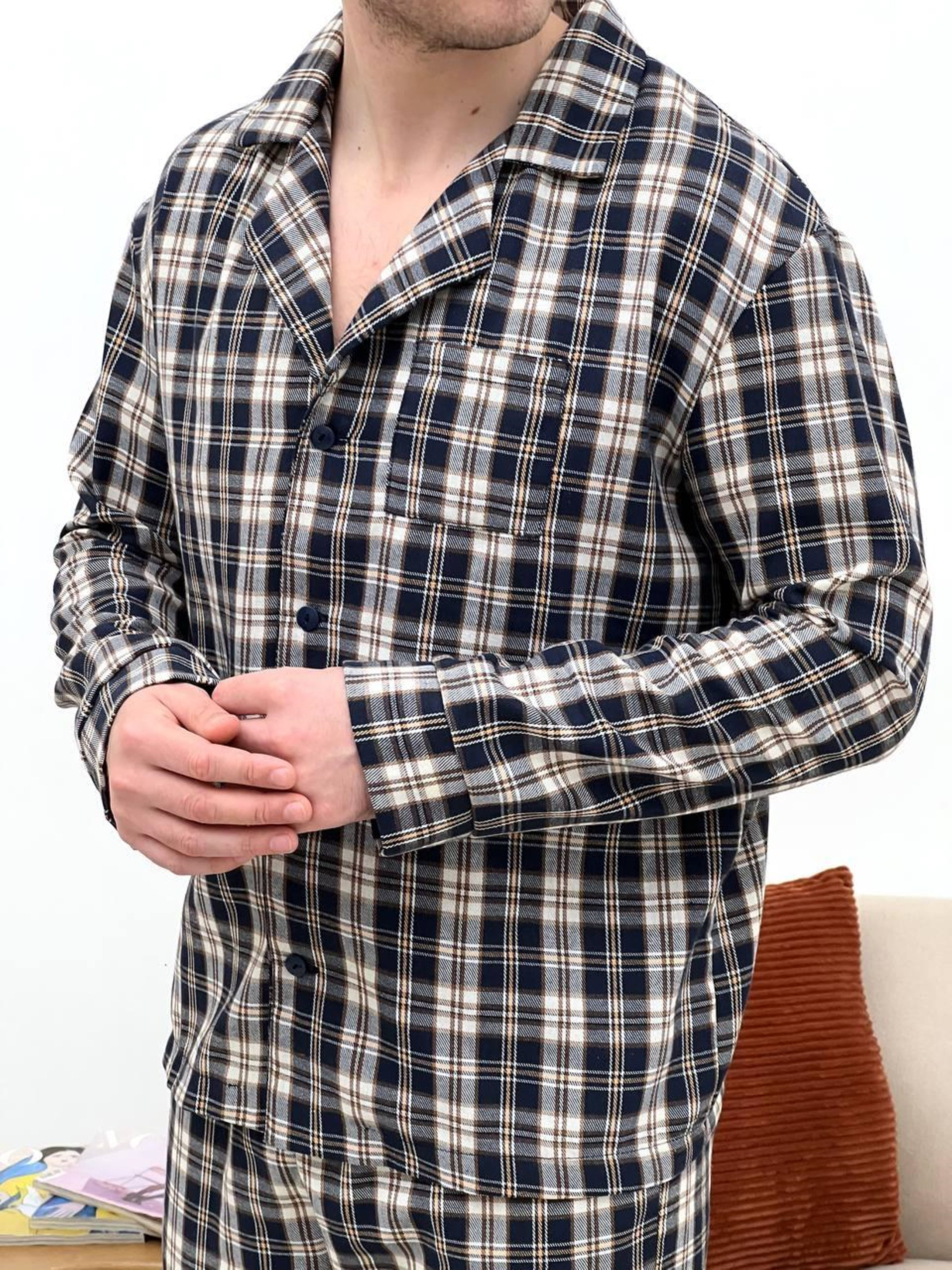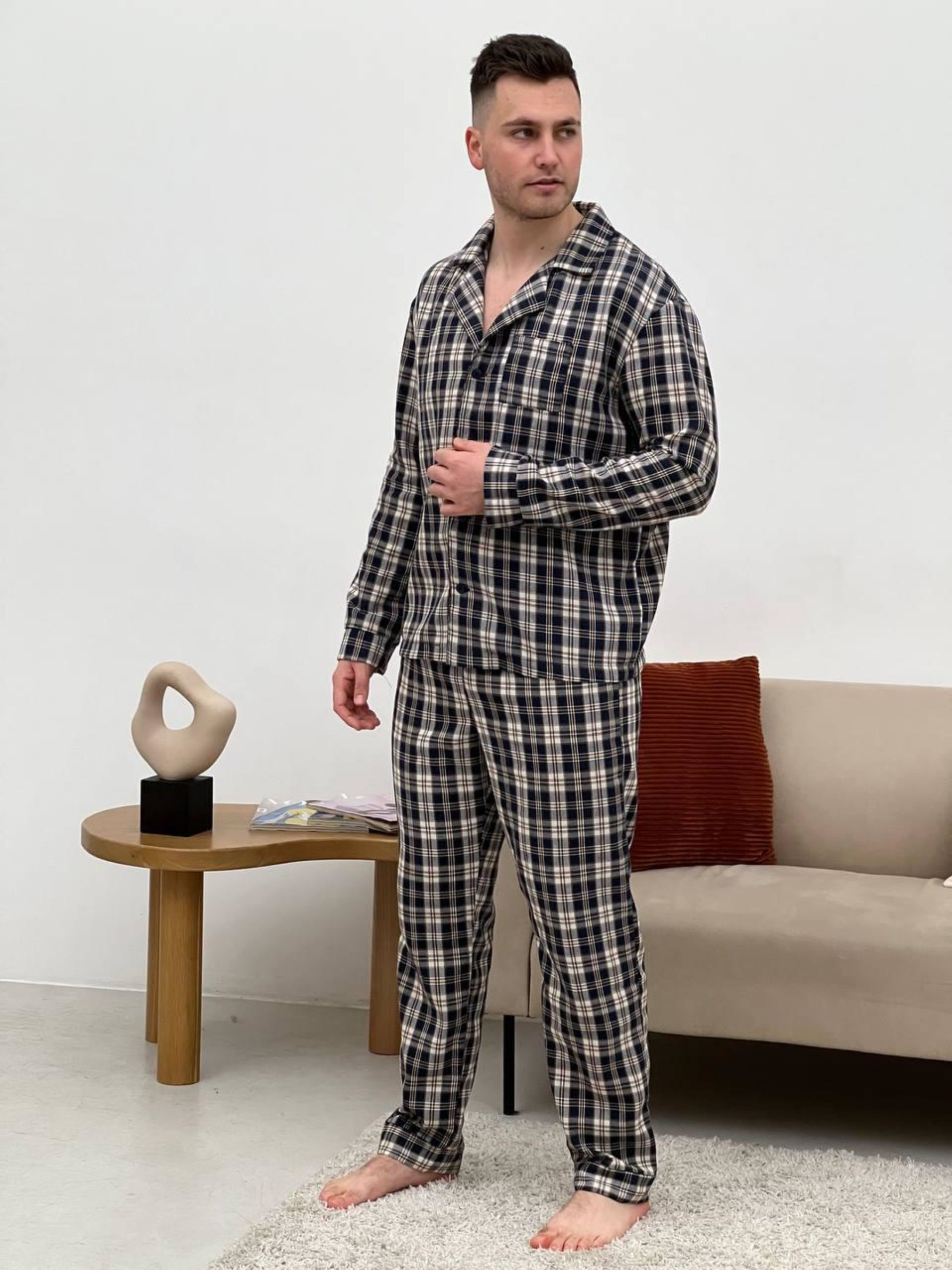Комфортний чоловічий домашній комплект піжамні штани+сорочка. Штани з кишенями. Пояс на резинці з регульованою куліскою. Чоловічий піжамний комплект - це не тільки одяг для сну, але і зручний теплий одяг для дому. Колір: клітина темно-синя/кремова Тканина фланель: Бавовна 70%, поліестер 30%, Туреччина Щільність: 160 г/м2 Ефект: легкий начіс, односторонній внутрішній Розмір: M; L; XL; 2ХL Фланель: Особливості тканини: перевагою фланелі є її м'якість та теплові якості; мінусом - пілінгування, згодом можуть з'являтися Піллі (катишки). Рекомендована температура при пранні 30 градусів