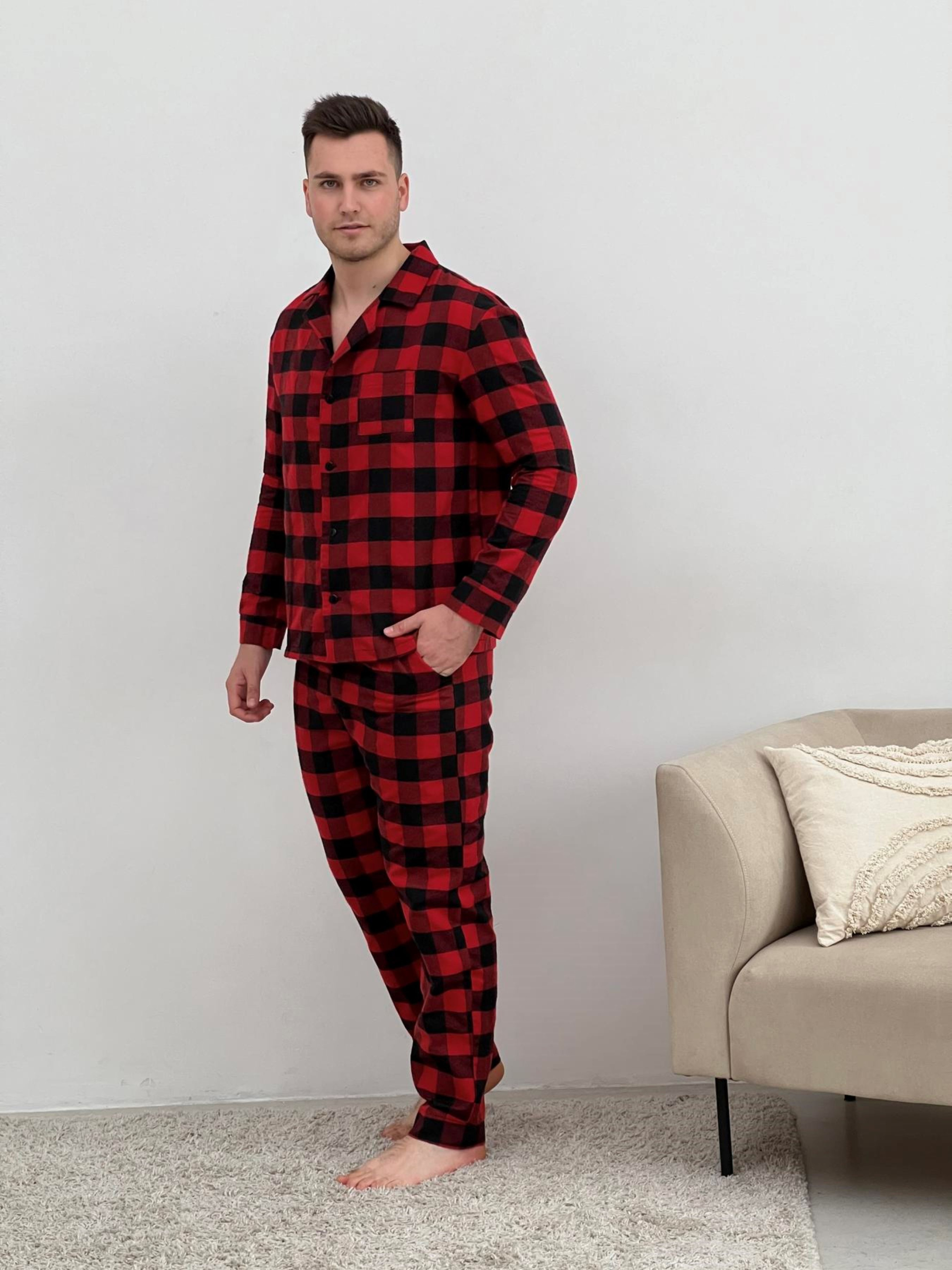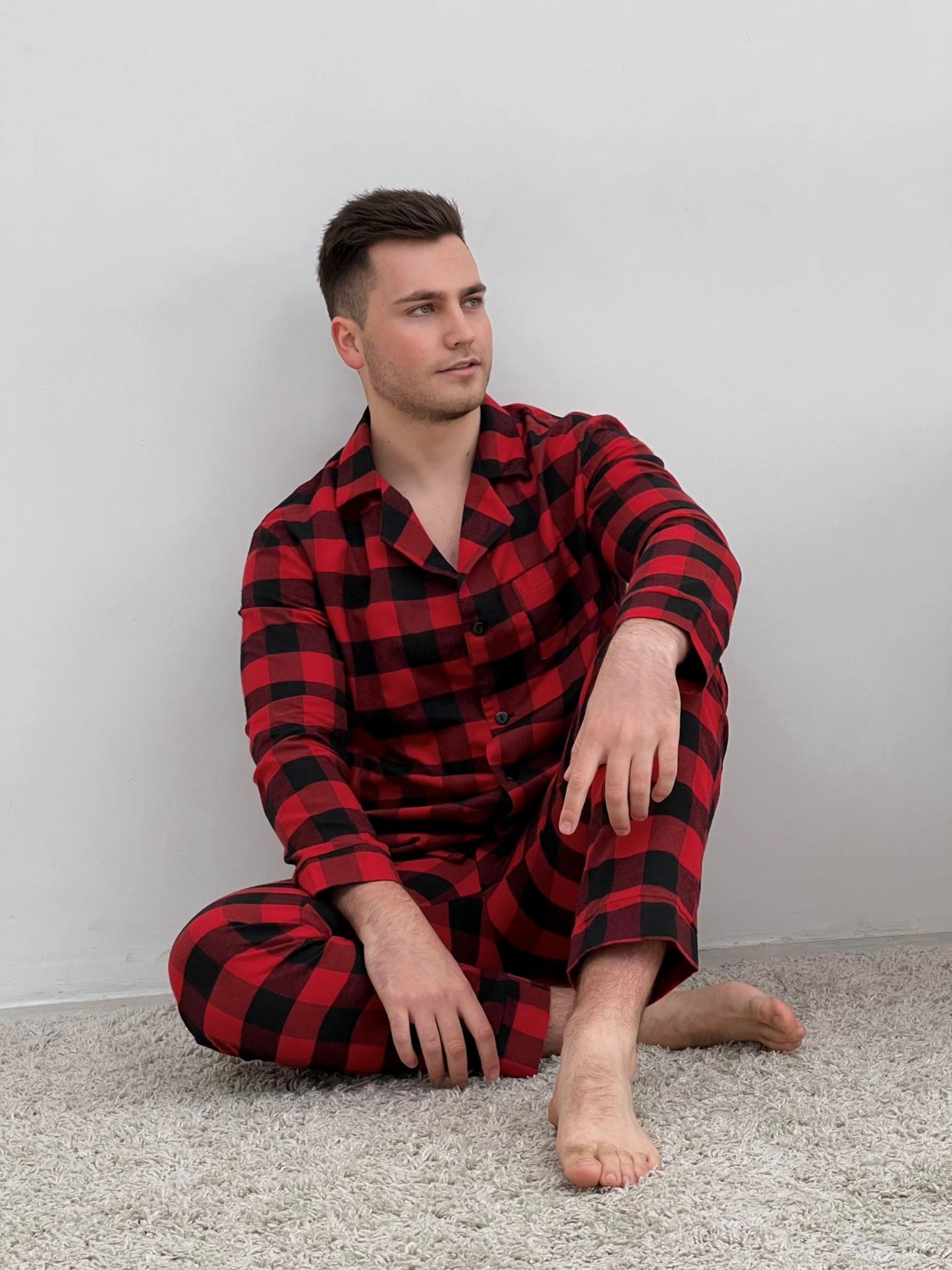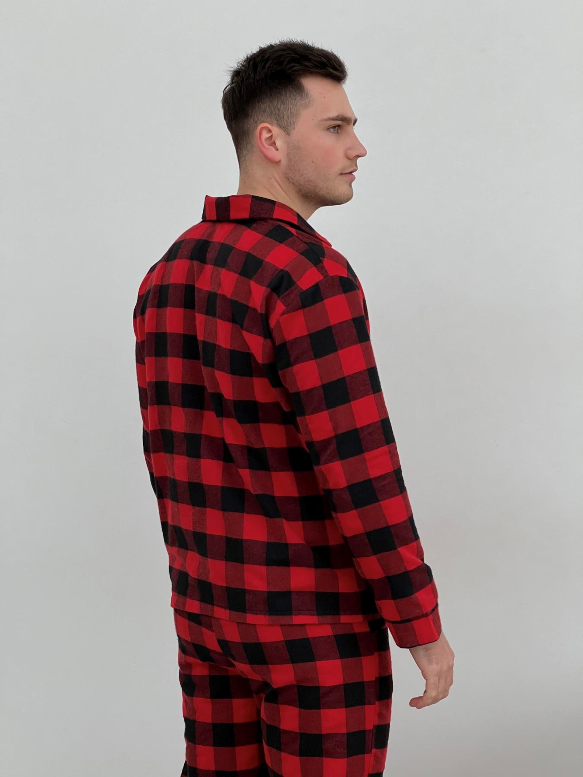 Комфортний чоловічий домашній комплект піжамні штани+сорочка. Штани з кишенями. Пояс на резинці з регульованою куліскою. Чоловічий піжамний комплект - це не тільки одяг для сну, але і зручний теплий одяг для дому. Колір: клітина червоно/чорна Тканина фланель: Бавовна 70%, поліестер 30%, Туреччина Щільність: 160 г/м2 Ефект: легкий начіс, двосторонній Фланель: Особливості тканини: перевагою фланелі є її м'якість та теплові якості; мінусом - пілінгування, згодом можуть з'являтися Піллі (катишки). Рекомендована температура при пранні 30 градусів