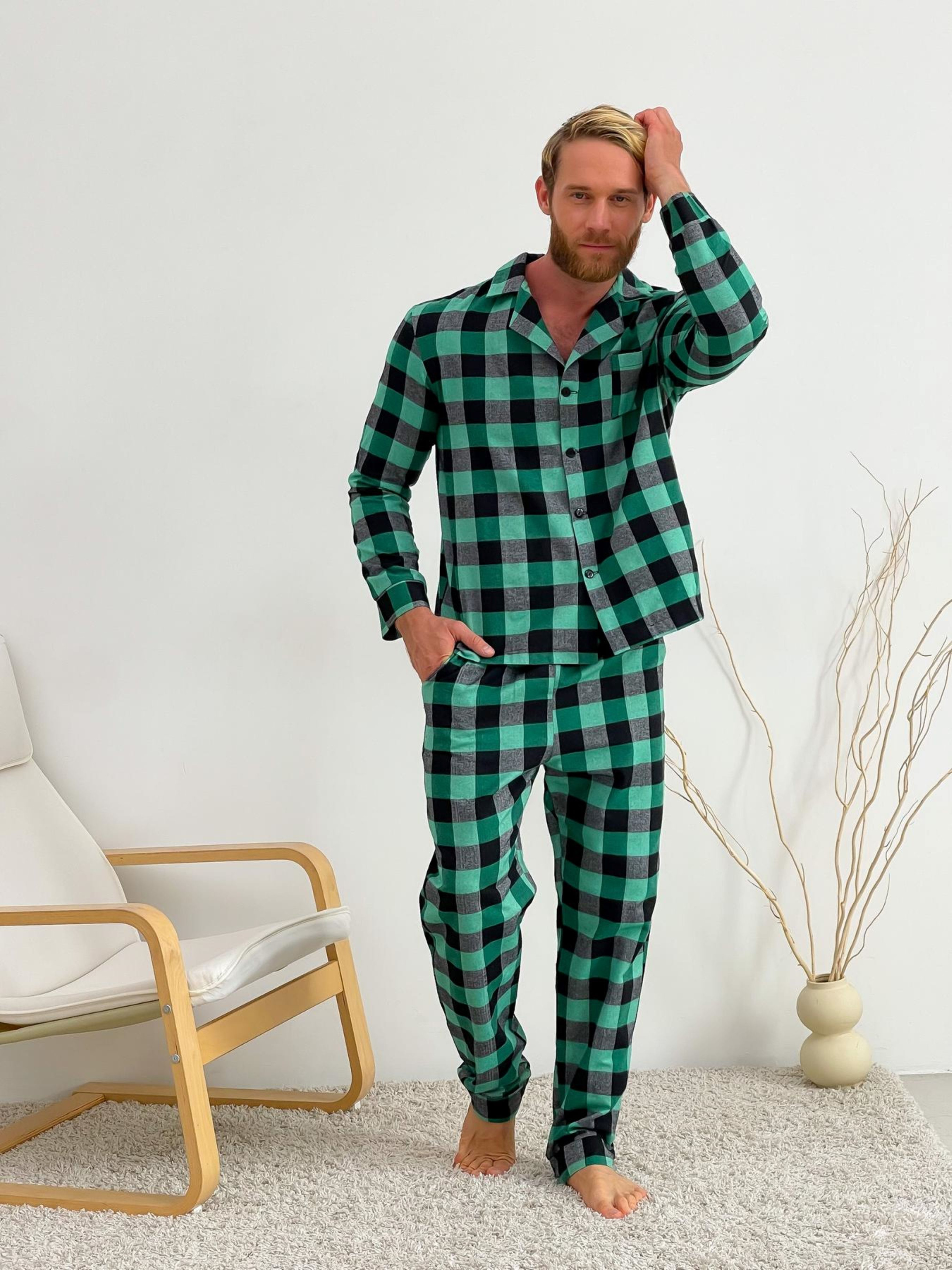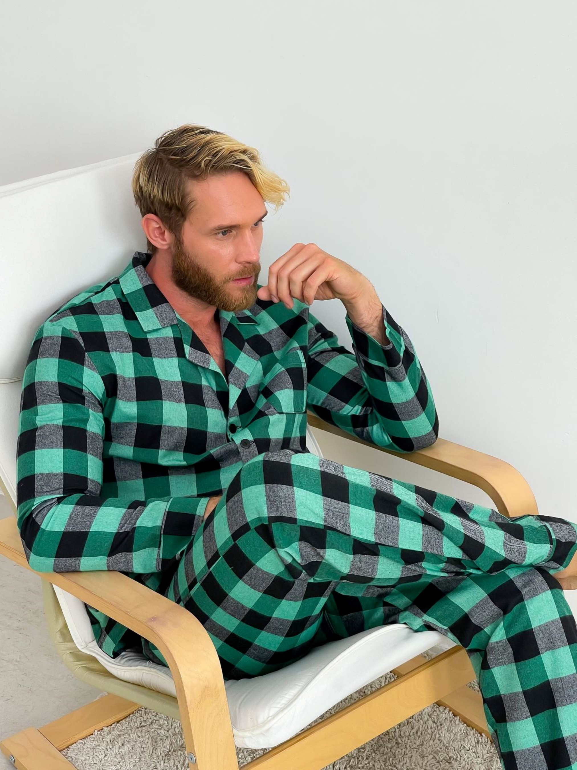 Домашній комплект COSY із фланелі (штани+сорочка) у клітинку зелено/чорну. Комфортний і стильний домашній комплект для чоловіків, що включає брюки і сорочку. Штани оснащені кишенями та поясом на резинці з регульованою куліскою. Цей комплект створений не тільки для зручного сну, а й як теплий одяг для дому, надаючи вам почуття затишку. Характеристики: Тип: Домашній комплект (штани+сорочка) Колір: Клітина зелена/чорна Тканина: Фланель (70% бавовна, 30% поліестер), Туреччина. Щільність: 155 г/м² Ефект: Легке начісування, двостороннє. Особливості: Комфорт для сну та будинку: Легкі та зручні, ці піжамні штани та сорочка стануть вашим невід'ємним елементом для дому та відпочинку. Практичний дизайн: Зручні кишені та регульований пояс надають практичності та функціональності. Тепла фланель: Виготовлені з фланелі (бавовна та поліестер), що забезпечують тепло та комфорт у холодну пору року. Рекомендації щодо догляду: Прати в холодній воді (при температурі не вище 40°C): Для збереження кольору та якості тканини. Віджимайте на малих обертах (400). Не використовувати відбілювачі. Сушити природним шляхом у розправленому вигляді: Рекомендується злегка розтягнути виріб під час сушіння для збереження форми. Прасувати при середній температурі до 150°C: Для підтримання чистоти та оформлення комплекту.