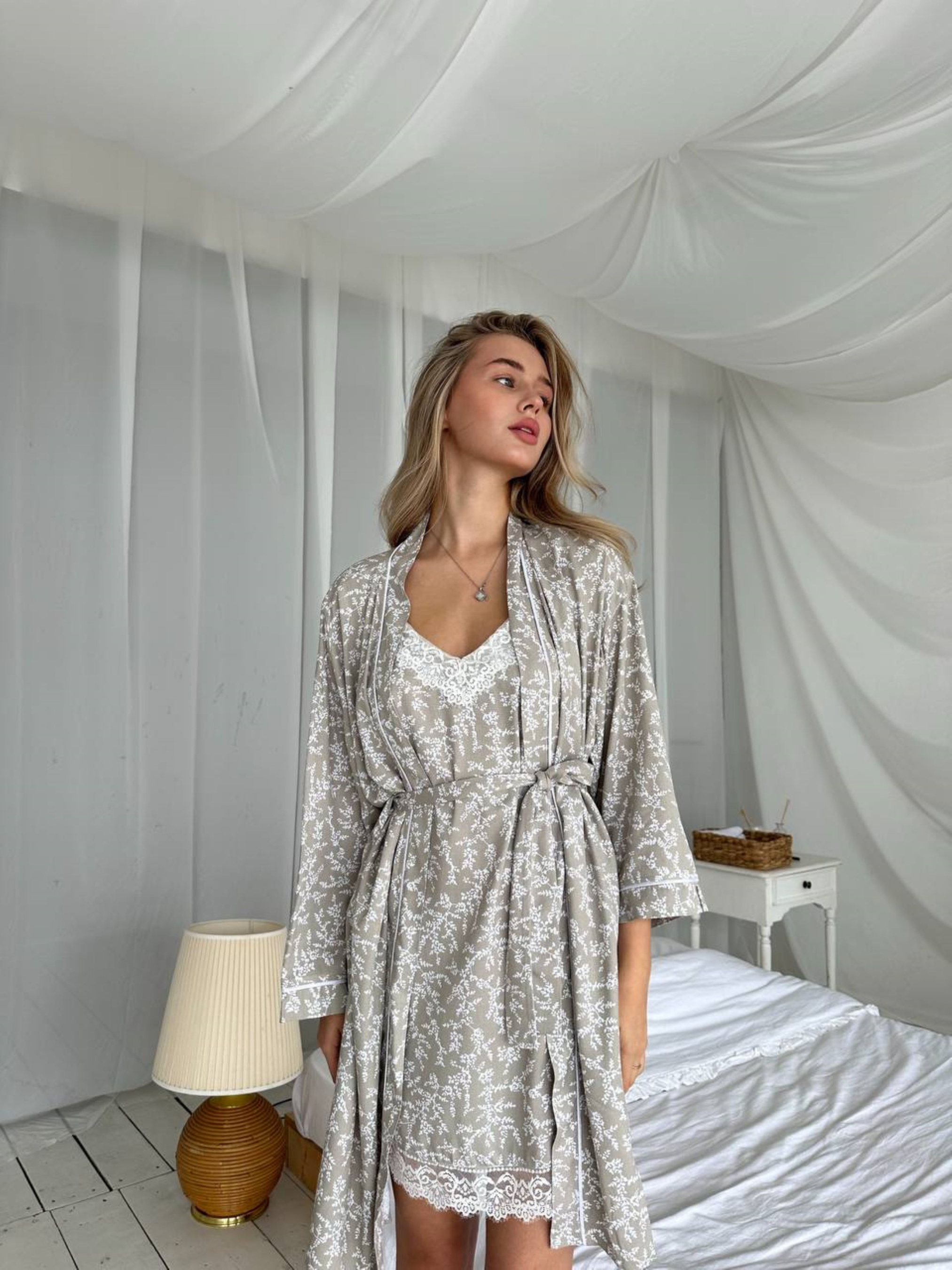 Жіночий набір COSY зі штапелю Ніжність S халат + сорочка, грейдж Зустрічай наш чарівний комплект "Ніжність" — для тих, хто любить комфорт і витончену елегантність. Це поєднання зручного халата і ніжної сорочки, яка дарує відчуття легкості та розслабленості. Сорочка оздоблена делікатним мереживом, що додає особливого шарму, підкреслюючи твою красу з тонким відтінком романтики. Халат із м’якої тканини огортає ніжністю, ідеально підходить для ранкових моментів з чашкою кави або вечірнього релаксу після важкого дня. Тканина: 100% віскоза Колір : грейдж Щільність: 134 г/кв.м. Розміри: s, m, l. Рекомендації щодо догляду: Прати в машині, вибираючи «ручний режим»/«делікатний режим». Прати у холодній воді. Засоби для прання краще вибирати рідкі. Не можна сушити штапель за допомогою сушильної машини. Прасувати у вологому стані при температурному режимі праски (до 110 градусів) з вивороту тканини через тонку м'яку тканину