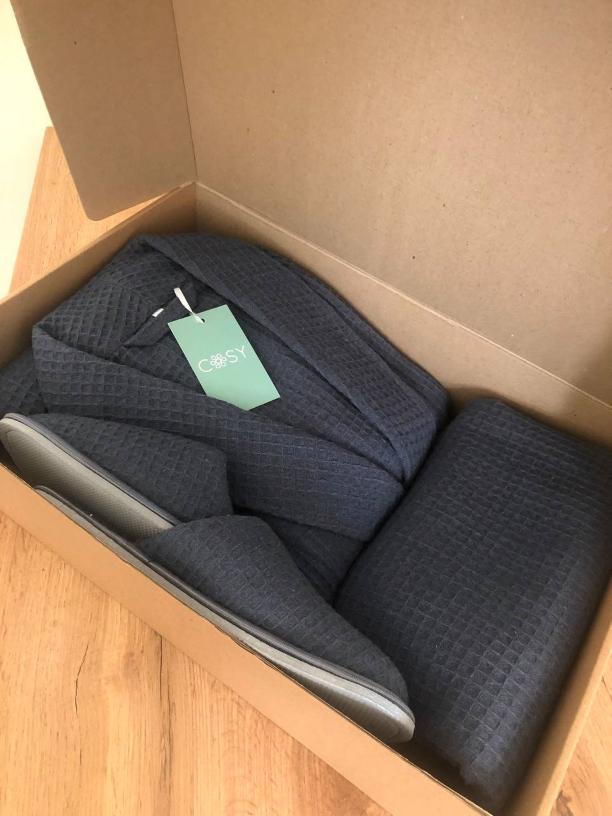 Подарунковий набір для чоловіка: халат +капці+рушник у коробці. Елегантний чоловічий халат «Сапфір» із шалевим коміром виконаний із високоякісної вафельної тканини. Вафельні халати дуже актуальні взимку. Матеріал дозволяє шкірі "дихати" і не викликає дискомфорту. Плечі трохи приспущені Колір: темно-синій Тканина: 100% бавовна, Туреччина Щільність: 220 г/м2 (тканина не декатована, після прання дає усадку 5-6%) Капці з вафельної тканини: Капці 44 на розмір 42-43 ( на стопу 28 см ), на розмір L, XL Капці 42 на розмір 40-41 ( на стопу 27 см ), на розмір S, M Капці 47 на розмір 44-45 ( на стопу 29-30 см ), довжина підошви 32 см, на розмір ХХL Рушник: Вафельні рушники COSY чудово вбирають вологу і надають комфорт після душу або ванни. Рушник банний 70*140 виготовлений зі 100% бавовни і має щільність 225 г/м². Доступно у кольорі Сапфір (темно-синій). Рекомендації щодо догляду: 1. Прати у холодній воді (при температурі не вище 40°С), віджимання тільки на малих обертах 400. Не використовувати відбілювачі. 2. Природне сушіння. Рекомендується трохи розтягнути Виріб під час сушіння. 3. Прасувати при високих температурах до 200°С (режим бавовна) з паром. Після прання вафельні клітини збираються, але після висихання та прасування вони розходяться.