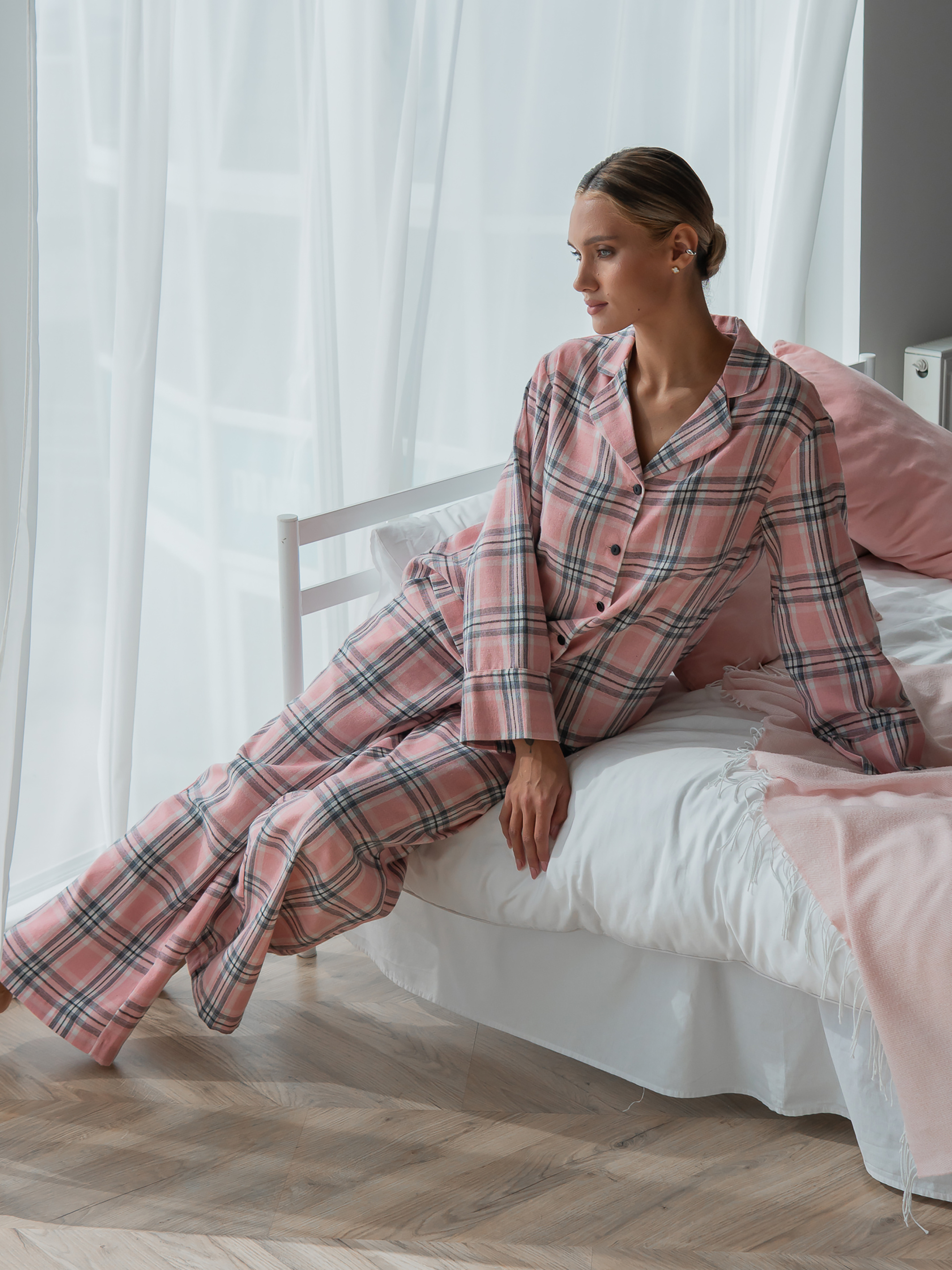 Теплий піжамний костюм з фланелі у рожеву клітку. Комплект складається з сорочки з довгими рукавами і прямих брюк. Сорочка вільного крою з відкладним коміром, на білих ґудзиках, з манжетами на рукавах. Брюки з кишенями по боках, з еластичним поясом на резинці. Завдяки високій якості матеріалу, піжама не дає усадку, практична і дуже проста в догляді. ! Особливість пошиття: закриті м'які шви, які не тільки виглядають акуратно й бездоганно, а й забезпечують комфортний дотик тканини до тіла, не дозволяють виробу деформуватися. Розмір XS/S. Груди: 88 - 112 см. Талія 68 см. Стегна: 86 - 104 см. Розмір M/L. Груди: 112 - 120 см. Талія 74 см. Стегна: 104 - 114 см. Розмір XL/XXL. Груди: 120 - 130 см. Талія 80 см. Стегна: 114 - 124 см. Довжина рукава 62 - 67 см. Довжина брюк 106 см. Параметри моделі на фото: Зріст 175 см Груди 90 см Талія 63 см Стегна 93 см Примітка стосовно догляду: ручне або машинне прання при температурі води до 30°C при мінімальній швидкості віджиму. Виріб не вибілювати. Не сушити у сушильній машині. Сушити на горизонтальній поверхні в розправленому стані в тіні. Прасувати при помірній температурі зі споду. Не використовувати хімчистку.