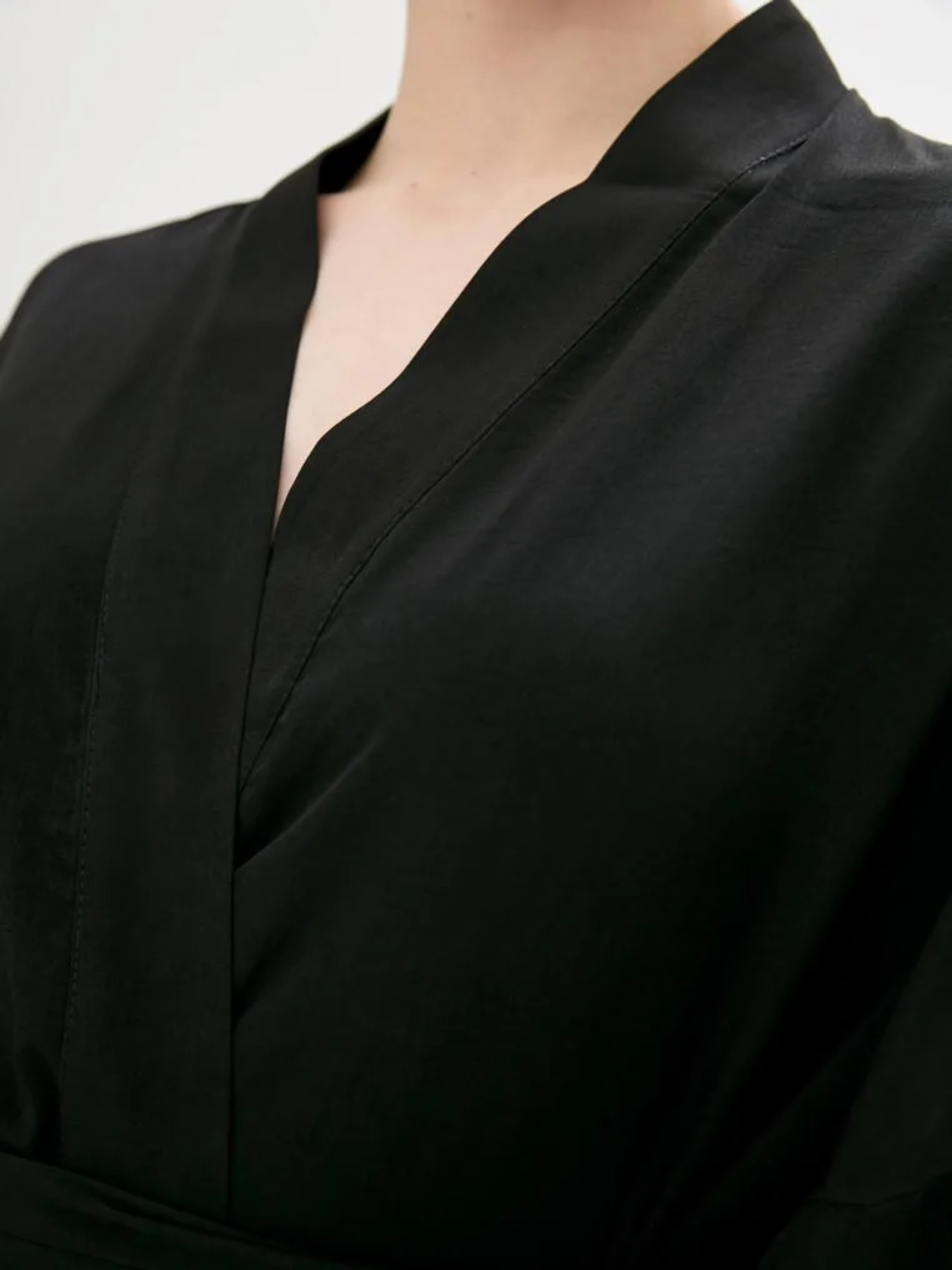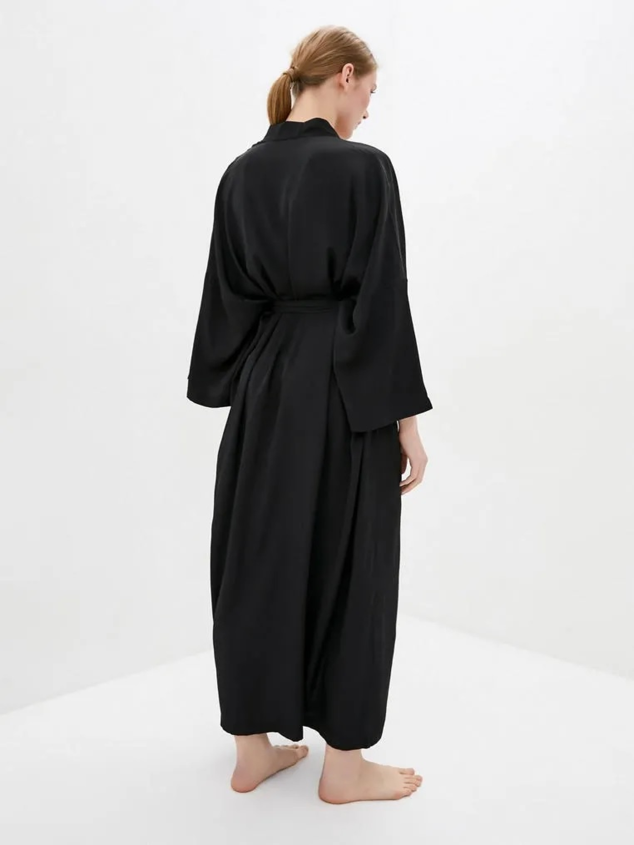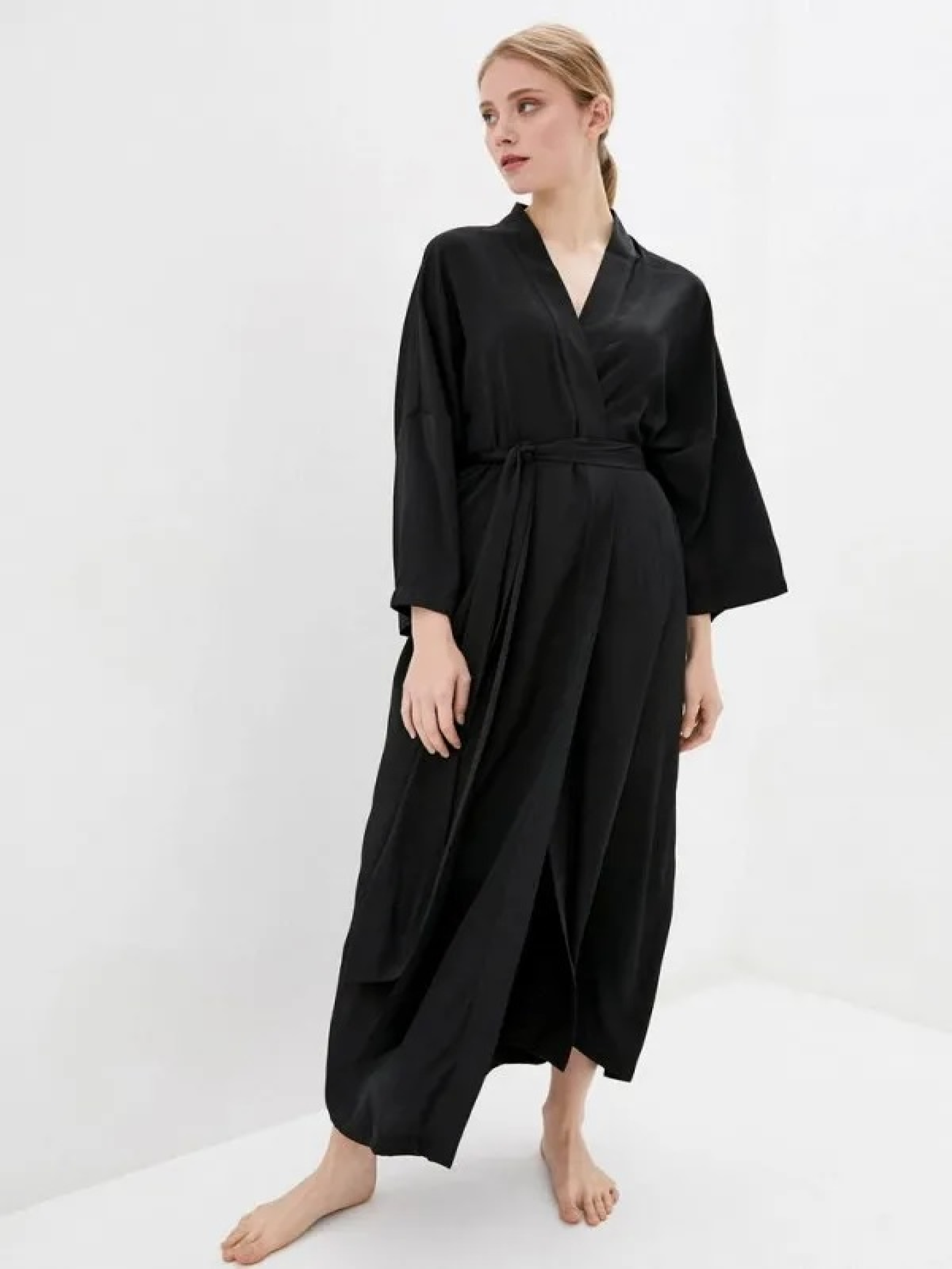 Довгий халат - кімоно з довгими рукавами чорного кольору. Халат на запах, з широким довгим поясом. Розмір халата регулюється глибиною запаху. Повітряна і комфортна, приємна до тіла тканина. Завдяки високій якості матеріалу, виріб не дає саджання, практичний і простий у догляді. Склад: 50% шовк, 50% бавовни Розмір ONE SIZE (універсальний). Параметри моделі на фото: Зріст 170 см Обхват грудей 86 см Обхват стегон 90 см Примітка по догляду: рекомендується прати в холодній воді вручну. Після прання річ не потрібно вичавлювати, просто прополоскати і повісити сушитися на вішалку. Сохне дуже швидко. Гладити праскою при середній температурі з виснажливого боку. І запам'ятайте, не можна збризкувати шовк водою - можуть залишитися розводи!