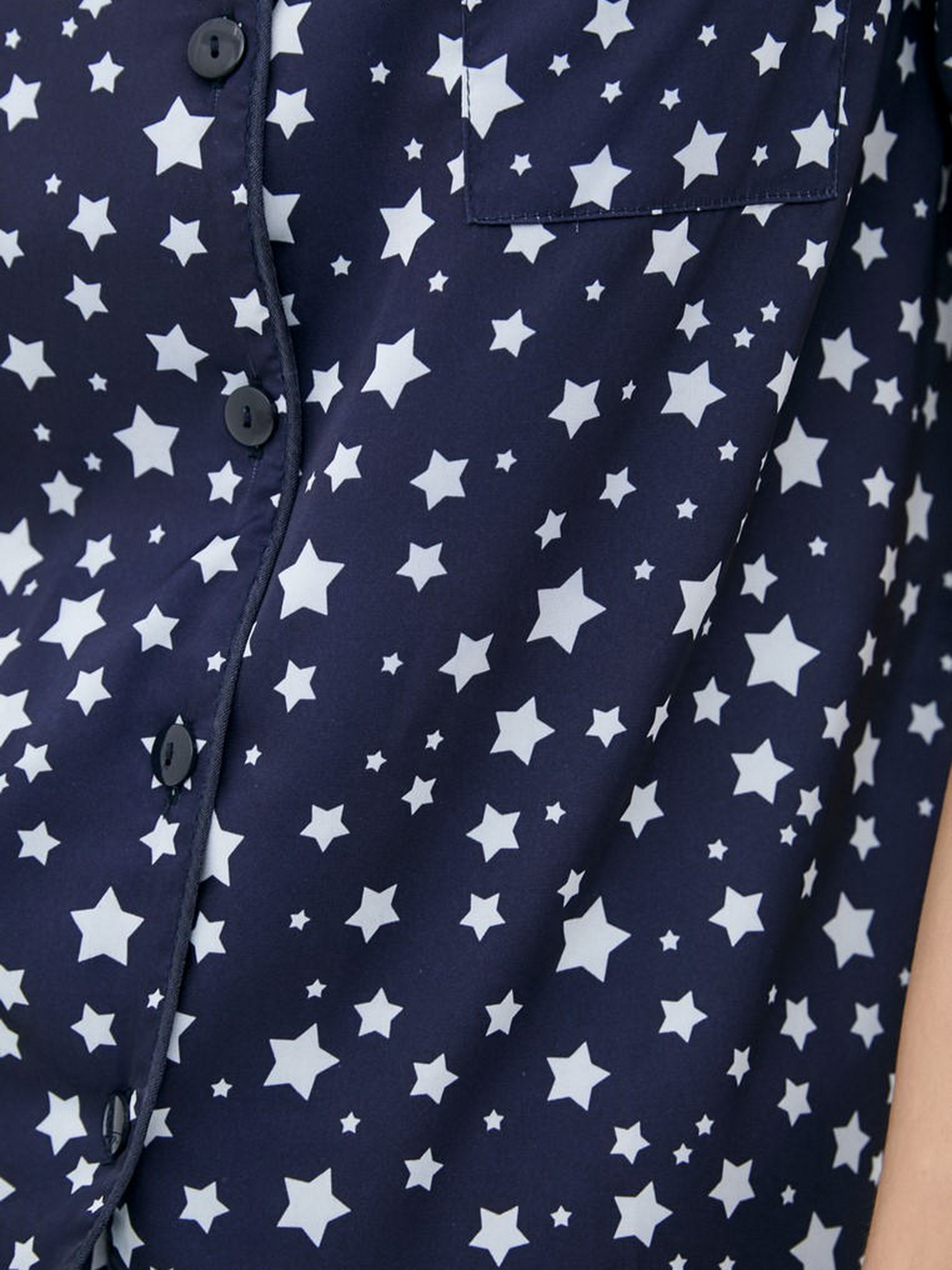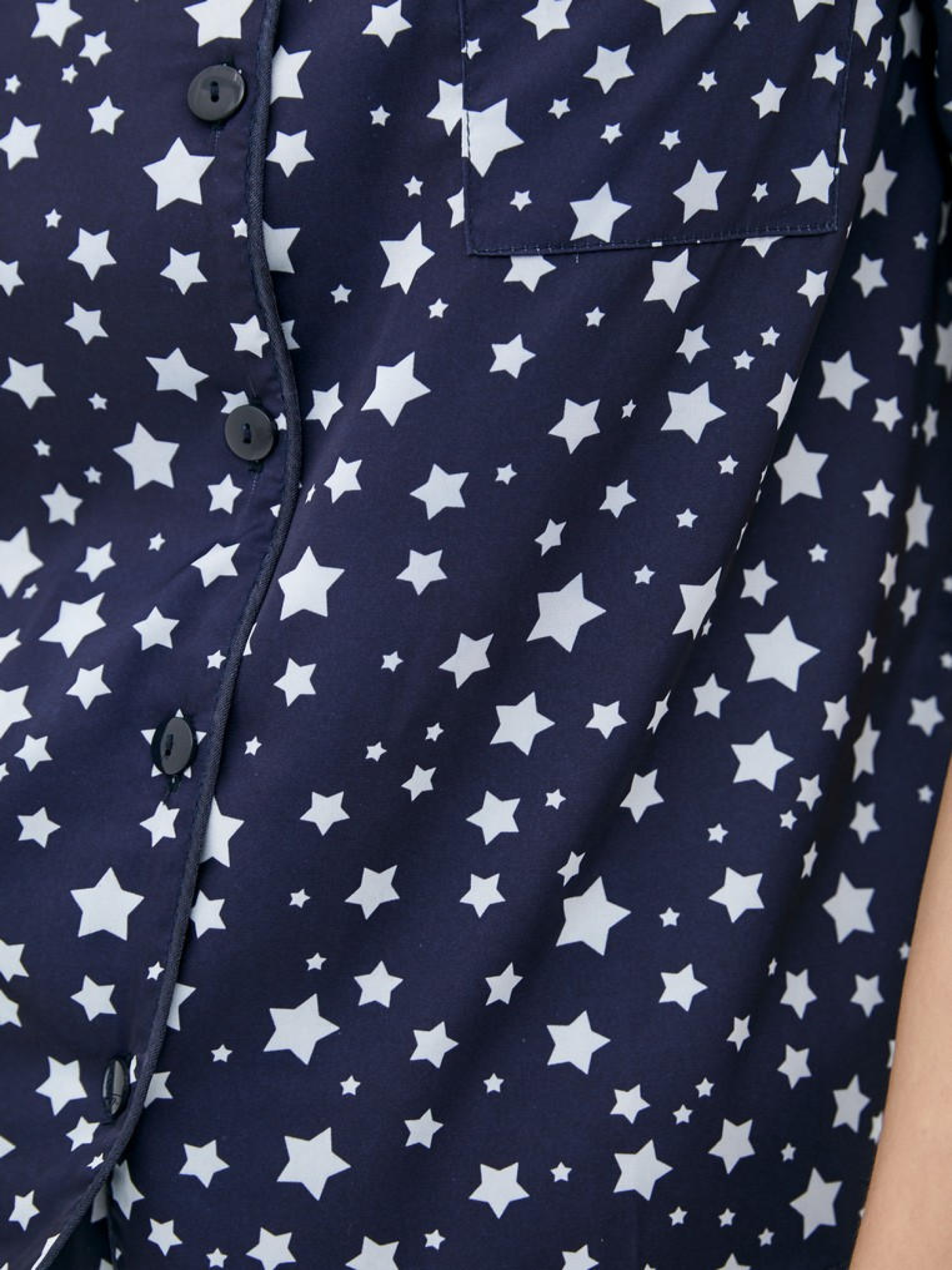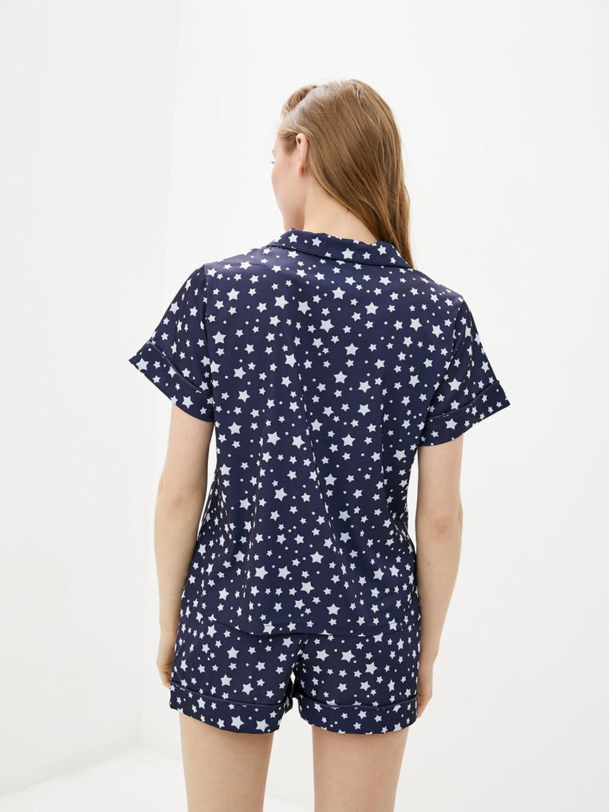 Піжамний костюм в темно-синьому кольорi із зірками з темно-синім краєм. Комплект складається з сорочки з короткими рукавами і шортів. Сорочка з темно-синіми гудзиками, з манжетами на рукавах. Шорти з манжетами, на гумках з зав'язками. Повітряна і зручна, прохолодна і приємна для тіла тканина. Завдяки високій якості матеріалу виріб не стискається, практичний і простий в догляді. ! Особливістю шиття є закриті м'які шви, які не тільки виглядають акуратно і бездоганно, але і забезпечують комфортний дотик тканини до тіла, не дають виробу деформуватися. Склад: 50% шовк, 45% віскоза, 5% еластан. Розміри в складі S, M, L. Розмір обхвату грудей S. : 88 - 94. Стегна: 90 - 96 Розмір обхвату грудей М. 94 - 98. Стегна: 96 - 100 Розмір обхвату грудей L. : 98 - 102. Стегна: 100 - 110 Параметри моделі на фото: Зріст 170 см Обхват грудей 88 см Талія 61 см Обхват стегна 92 см Догляд Примітка: Рекомендується мити в холодна вода вручну. Продукт не повинен бути вибіленим. Висихання без спінів в підвішеному вертикальному положенні (на вішалці) в тіні, подалі від прямих сонячних променів. Він дуже швидко висихає. Праска при середній температурі з виворітного боку. НЕ окропіться водою - можуть залишитися сліди!