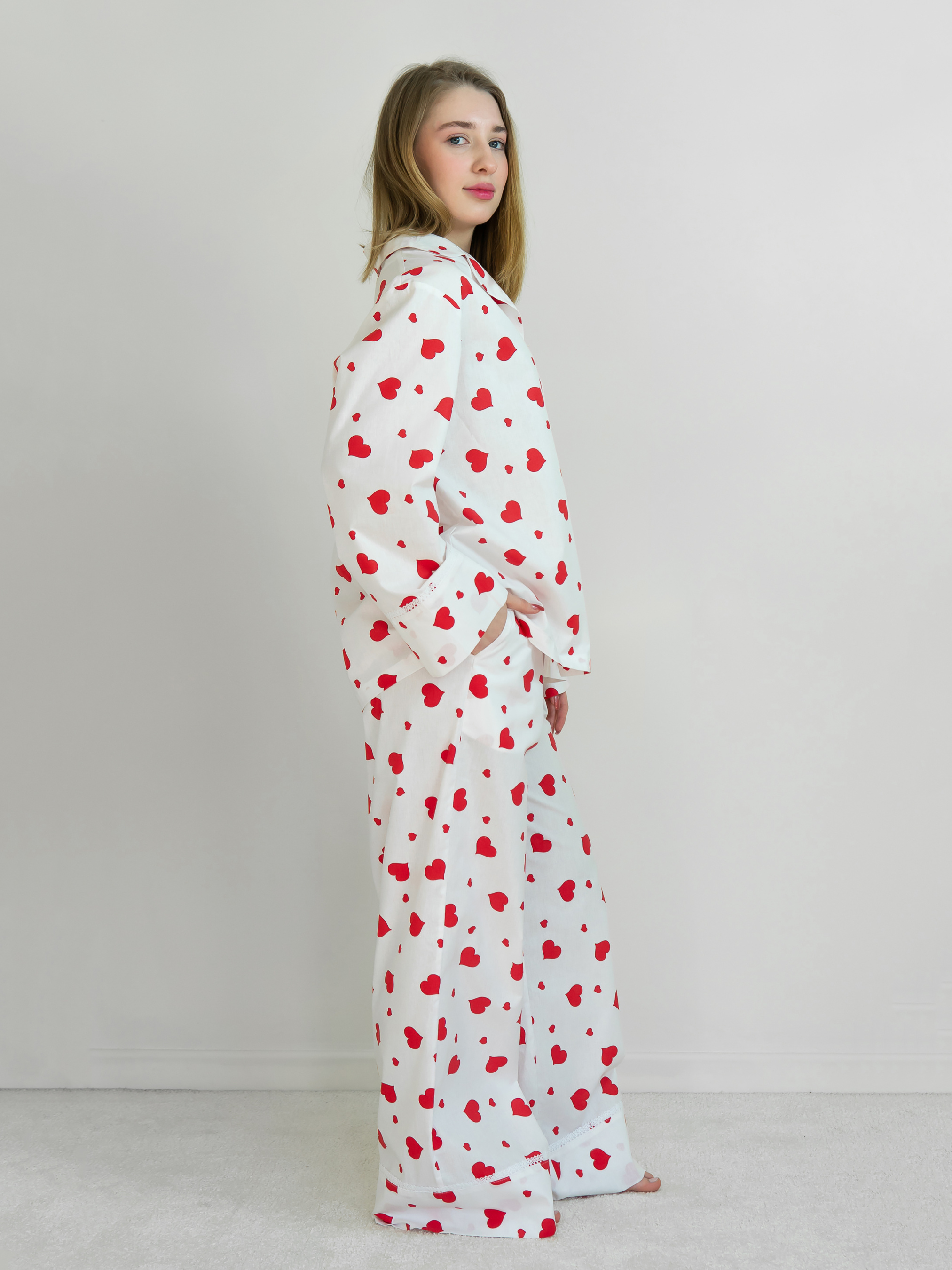 Піжамний костюм з бавовни білого кольору із серцями із бавовняним мереживом. Комплект складається з сорочки з довгими рукавами і прямих брюк. Сорочка вільного крою з відкладним коміром, з кишенею на грудях, на ґудзиках, з манжетами на рукавах. Брюки з високою талією з манжетами, з еластичним поясом на резинці. Завдяки високій якості матеріалу, піжама не дає усадку, практична і дуже проста в догляді. ! Особливість пошиття: закриті м’які шви, які не тільки виглядають акуратно й бездоганно, а й забезпечують комфортний дотик тканини до тіла, не дозволяють виробу деформуватися.. Розмір XS/S. Груди: 88 - 112 см. Талія 68 см. Стегна: 86 - 104 см. Розмір M/L. Груди: 112 - 120 см. Талія 74 см. Стегна: 104 - 114 см. Розмір XL/XXL. Груди: 120 - 130 см. Талія 80 см. Стегна: 114 - 124 см. Довжина рукава 62 - 67 см. Довжина брюк 106 см. Параметри моделі на фото: Зріст 173 см Груди 87 см Талія 65 см Стегна 95 см Примітка стосовно догляду: ручне або машинне прання при температурі води до 30°C при мінімальній швидкості віджиму. Виріб не вибілювати. Не сушити у сушильній машині. Сушити на горизонтальній поверхні в розправленому стані в тіні. Прасувати при помірній температурі зі споду. Не використовувати хімчистку.