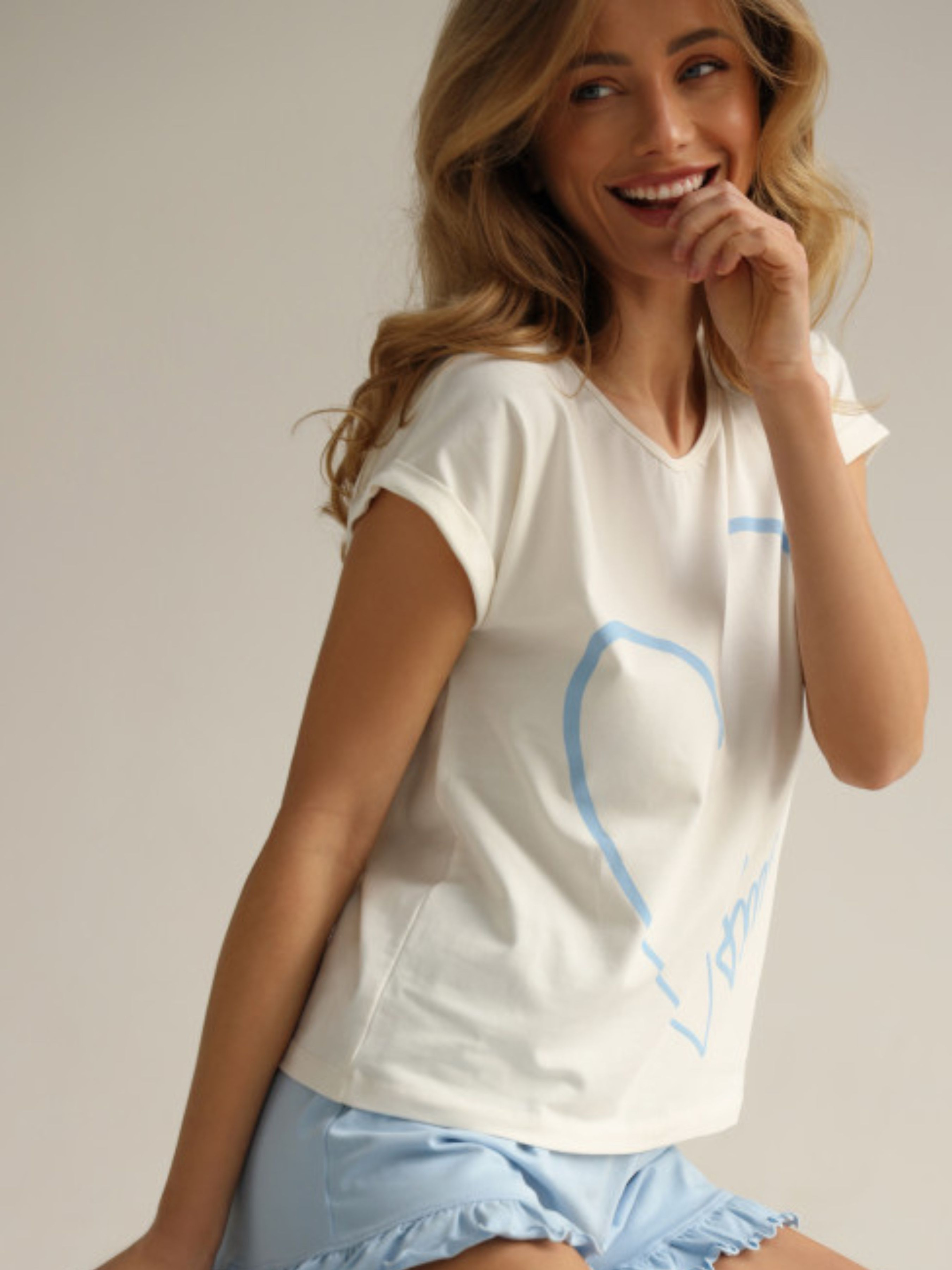 Зануртесь у комфорт і стиль з нашою жіночою піжамою AMOUR. Ця ніжна та затишна піжама складається з м'якої футболки з коротким рукавом та шортів з воланами. Виготовлена з високоякісного матеріалу, вона надасть вам відчуття легкості та свіжості під час сну. Дизайн піжами із надписом "AMOUR" додасть вашому вигляду ніжності та романтики. Дозвольте собі трохи задоволення з нашою чудовою жіночою піжамою AMOUR