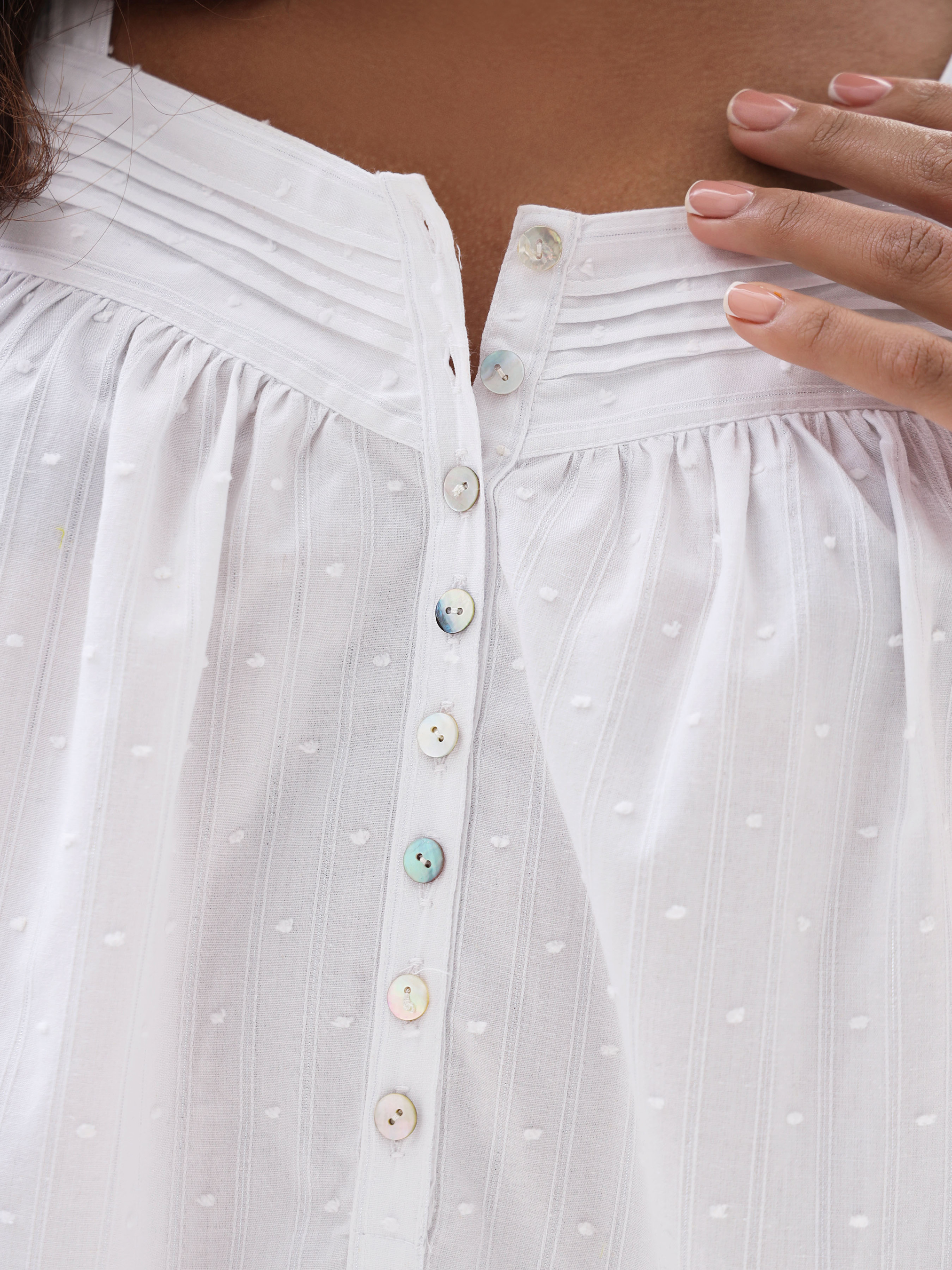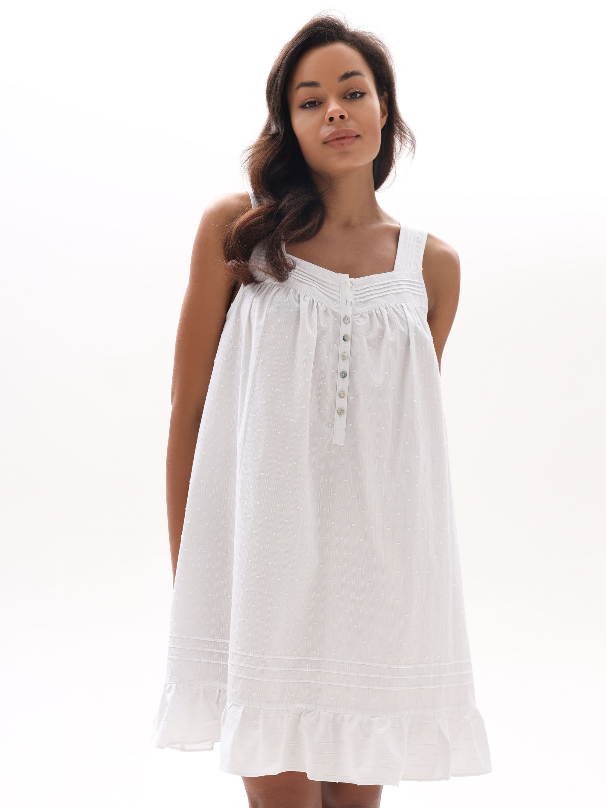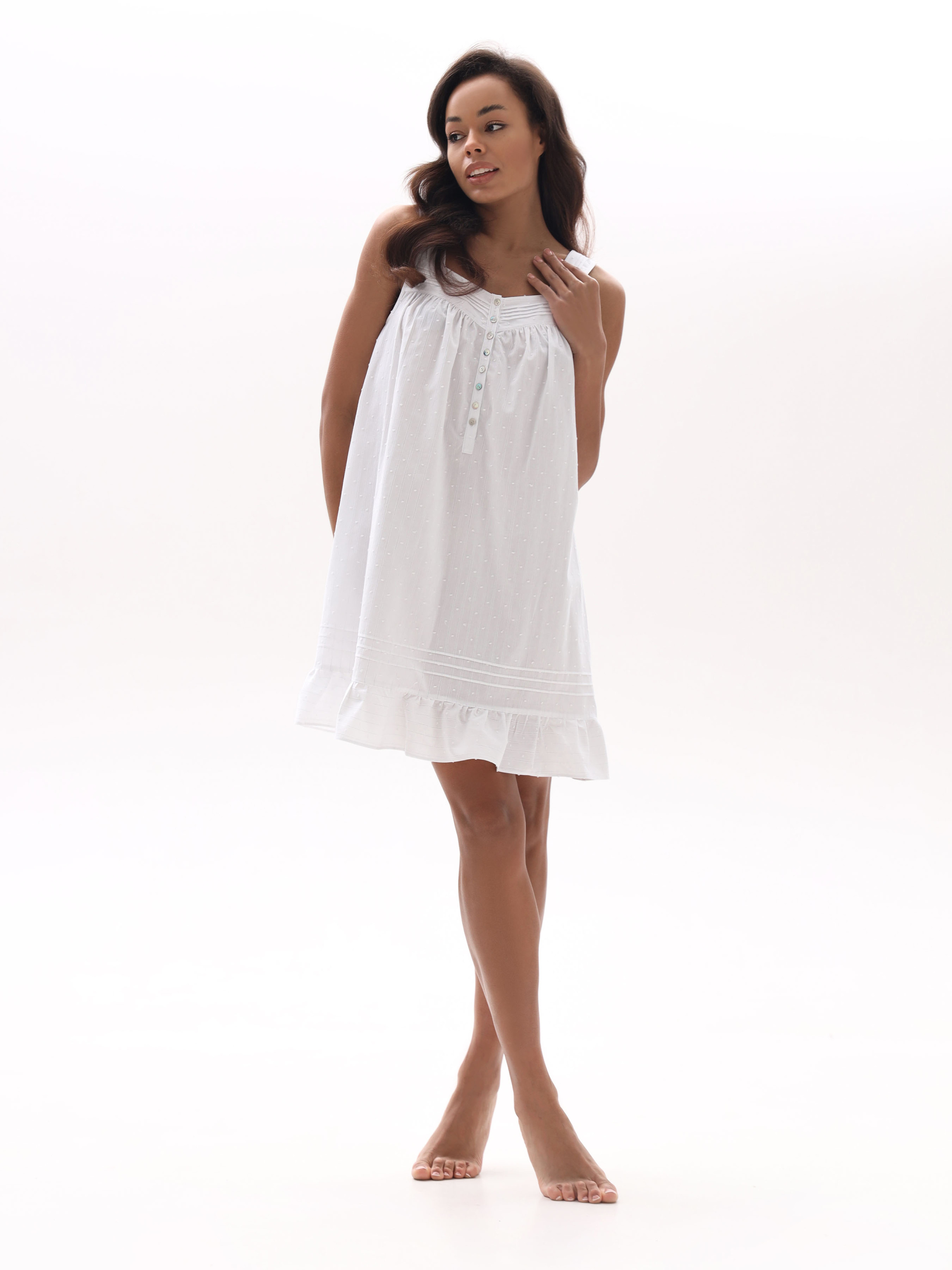 Ніжна жіноча сорочка з батисту, виготовлена зі 100% бавовни. Легка та повітряна тканина прикрашена витонченим візерунком у вигляді мушок, що додає особливого шарму. Сорочка має вільний крій для максимального комфорту та зручні ґудзики, які легко розстібаються, забезпечуючи практичність у використанні. Нижній край декорований акуратним воланом, що додає образу жіночності та легкості. Ідеальний вибір для комфортного сну та затишного домашнього відпочинку