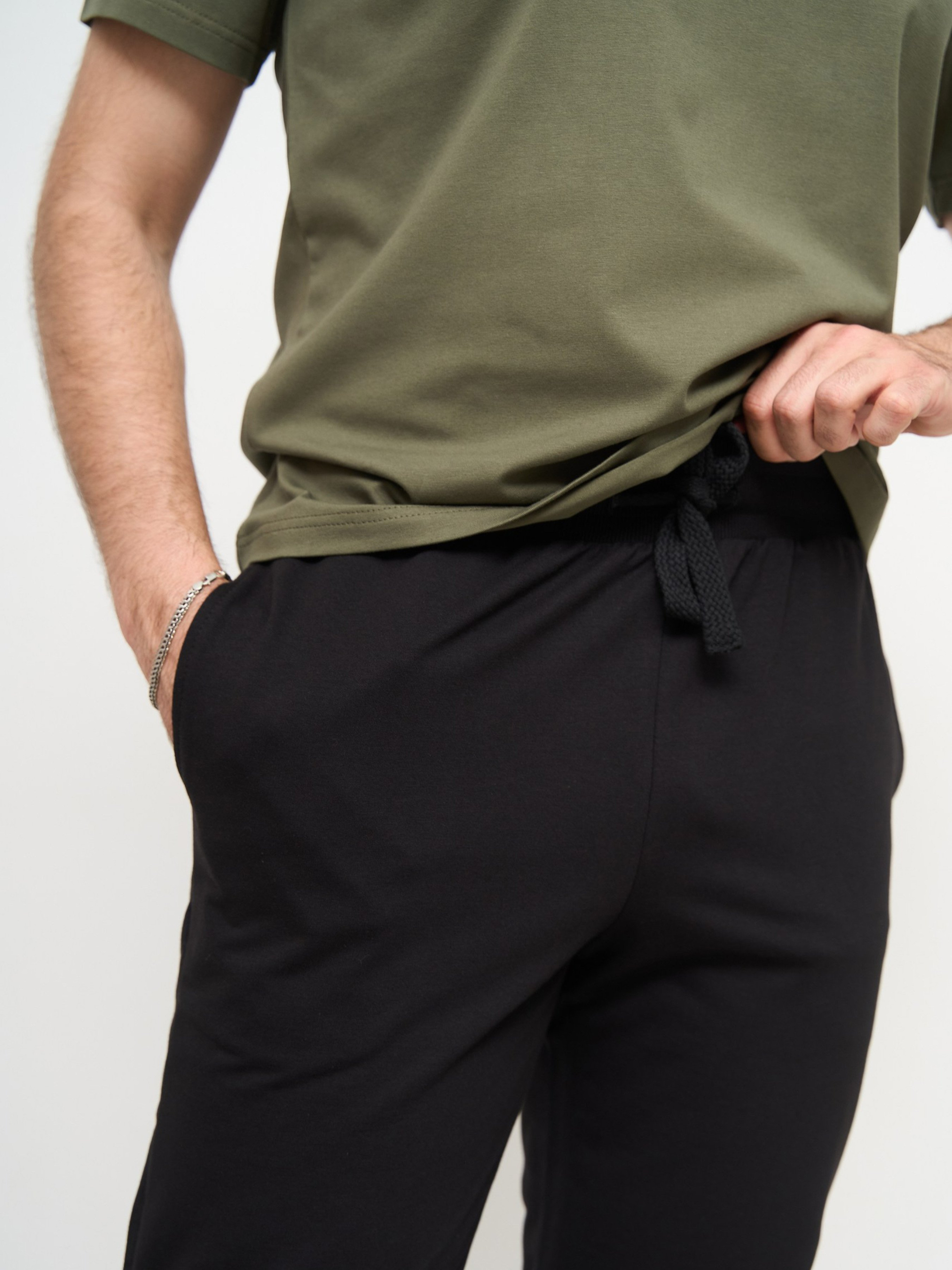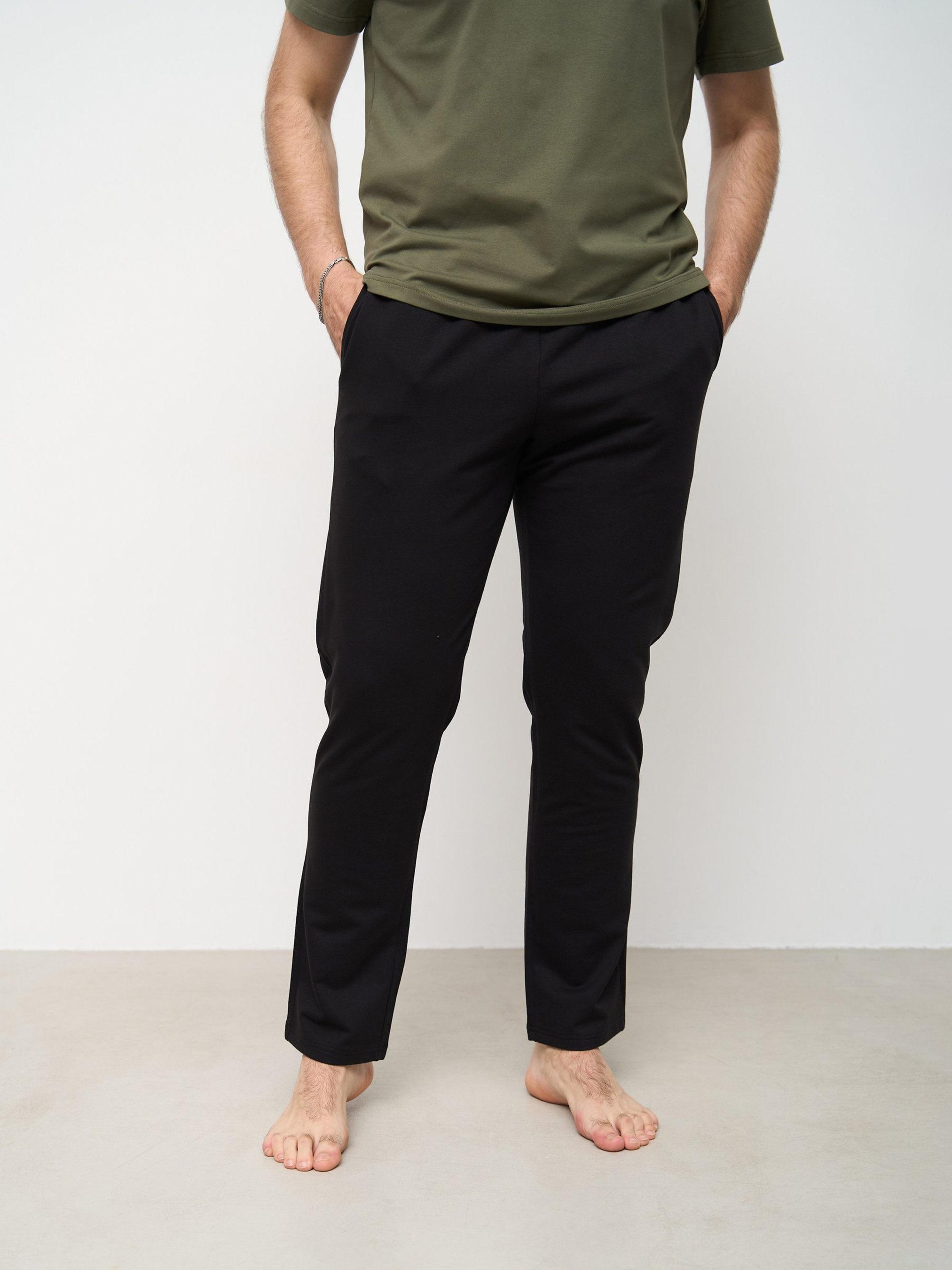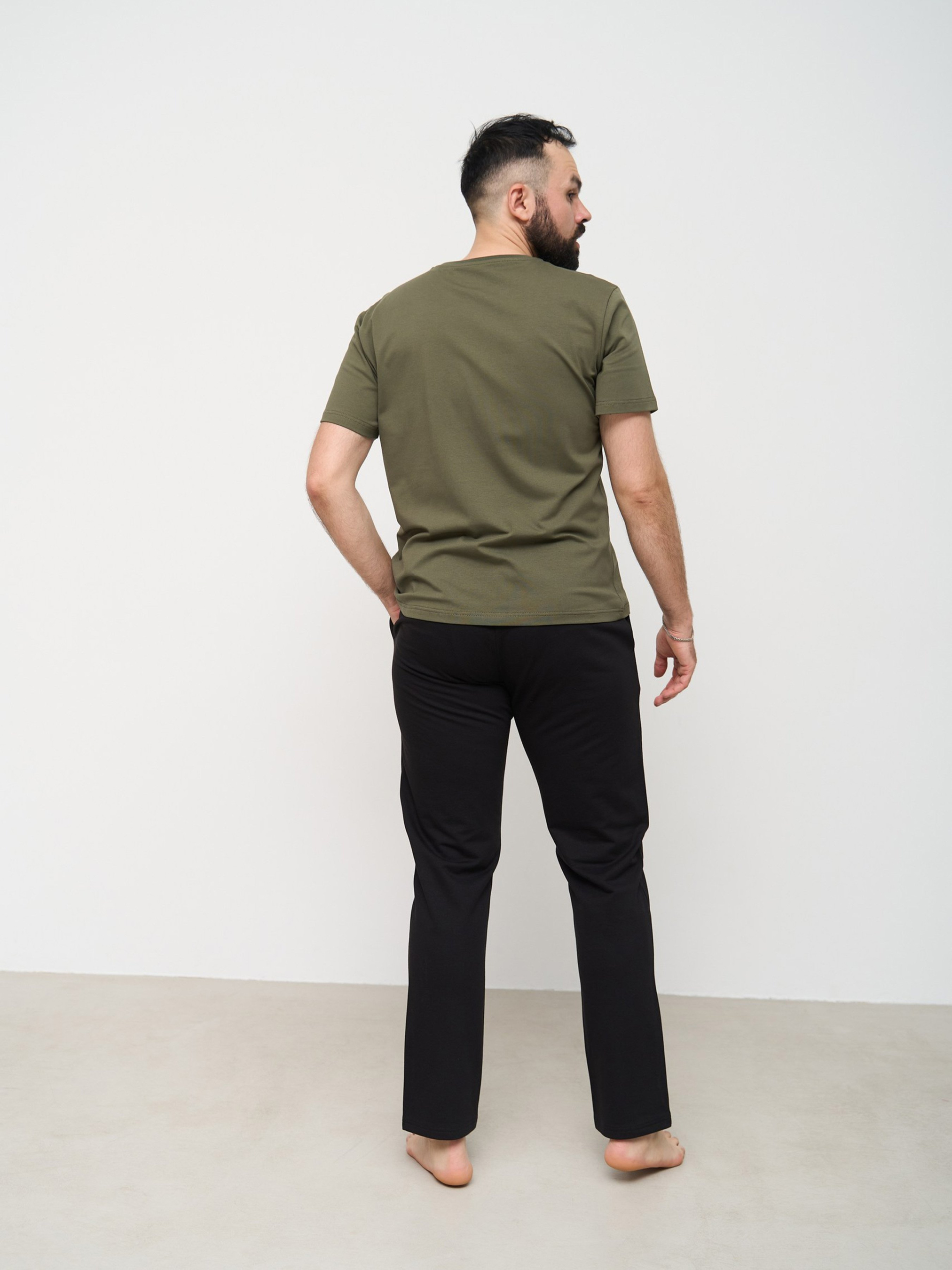 Стильно та стримано - ідеальний варіант домашнього одягу для чоловіків, які люблять мнімалізм. Такий одяг підійде кожному чоловікові: не залежно від типу фігури і не залежно чи любить він піжами, адже цей костюм універсальний. Можна носити вдома, як піжаму, для спорту та відпочинку. Приємний до тіла матеріал, який не кошлатиться - двухнитка та кулір, 95% бавовни. Штани прямі, пояс із зав'язками, вільний крій.