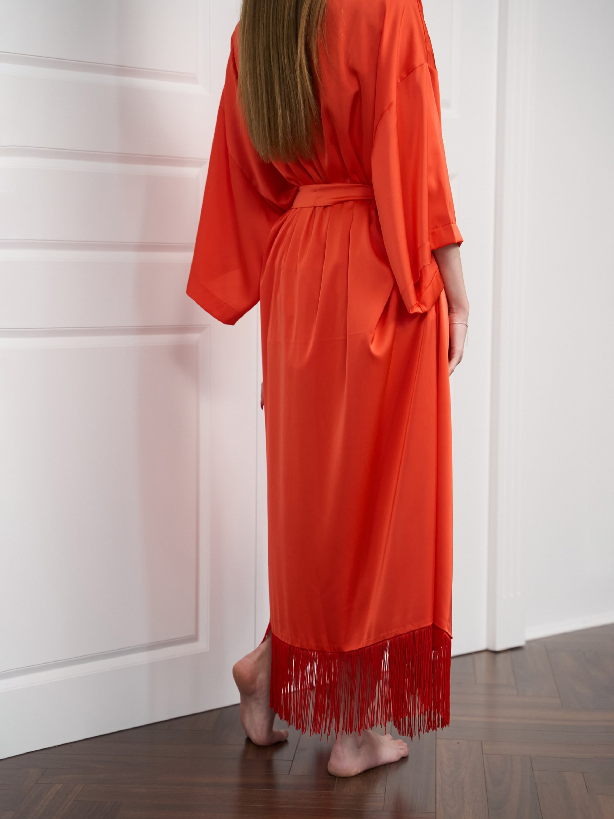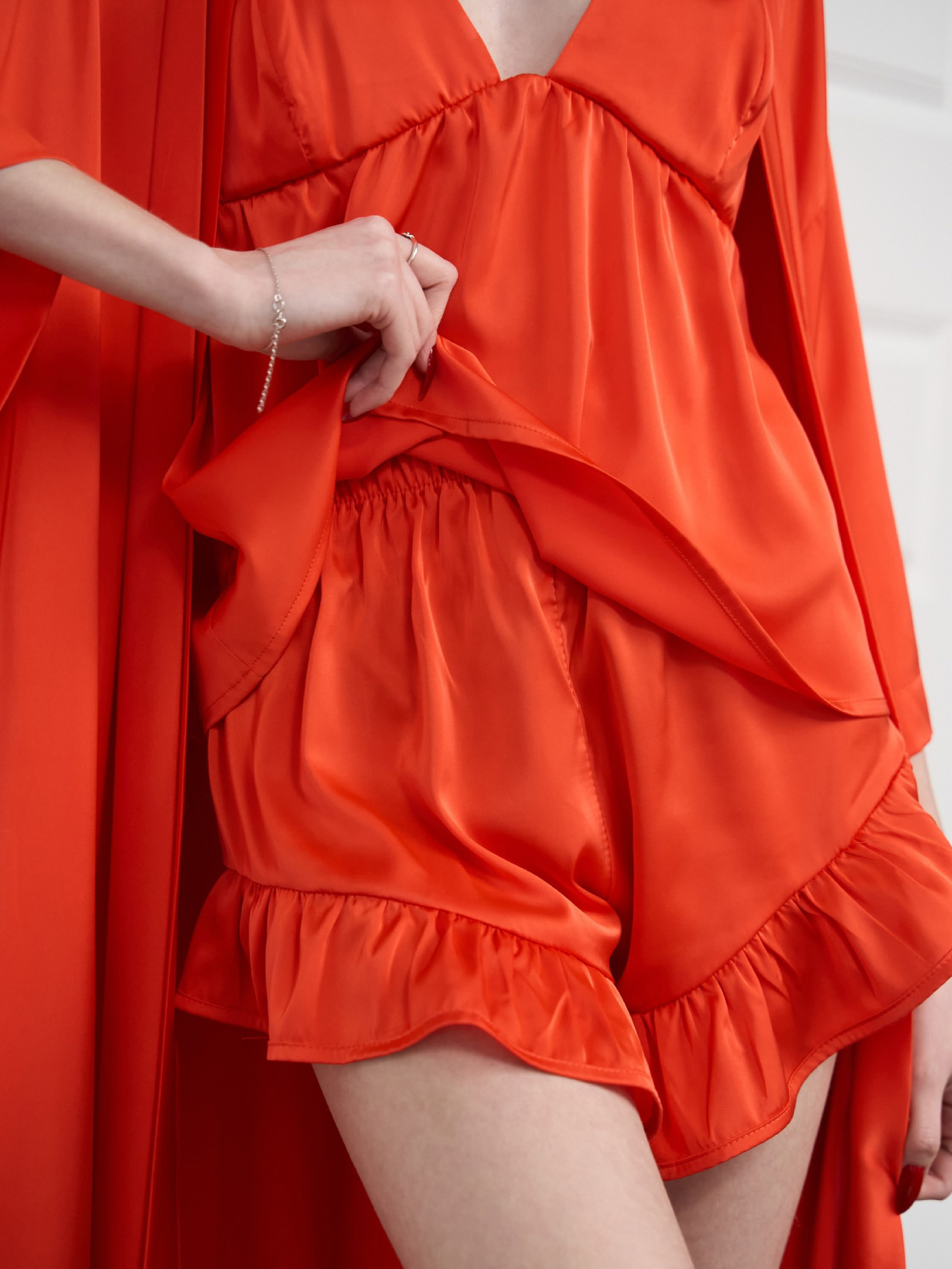 Розкішний шовковий комплект: топ, шорти та халат. Легкий, ніжний матеріал дарує приємні відчуття на шкірі, а продуманий дизайн створює ідеальний баланс між розкішшю та зручністю. Топ: делікатний силует із глибоким вирізом, що підкреслює жіночність. Шорти: грайливий крій із рюшами додає легкості та романтичного настрою. Халат: довгий, із вільним кроєм, поясом на талії та розкішною бахромою для особливого шарму. Ідеально для домашнього затишку, особливих моментів та чарівних вечорів. Будьте спокусливою та впевненою у собі кожного дня! довжина халату без бахроми 120 см; обхват грудей 84-92 см; обхват талії 64-72 см; обхват стегон 90-98 см.