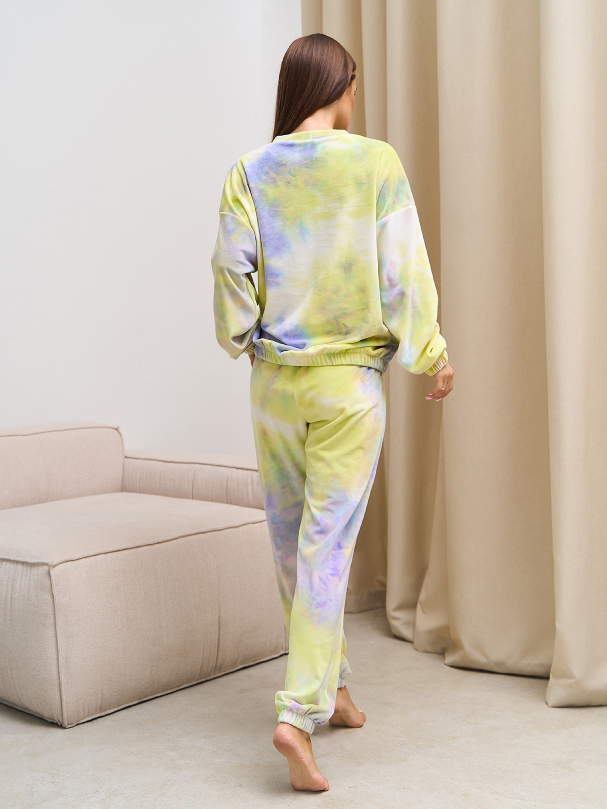 Кольорова велюрова піжама на еластичних манжетах, декорована принтом тай дай. Кофта з довгими рукавами та закритою напівкруглою горловиною. Штани джоггери з високою посадкою на талії та еластичною поясною гумкою. Напівобхват: Кофта: Груди: S (56), M (58), L (60), XL (62), Довжина виробу - 60, Рукав - 56, Штани: Талія: S (30-42), M (32-44), L (34-46), XL (36-48), Стегна: S (50), M (52), L (54), XL (56), Довжина виробу - 98, Довжина по внутрішньому шву.