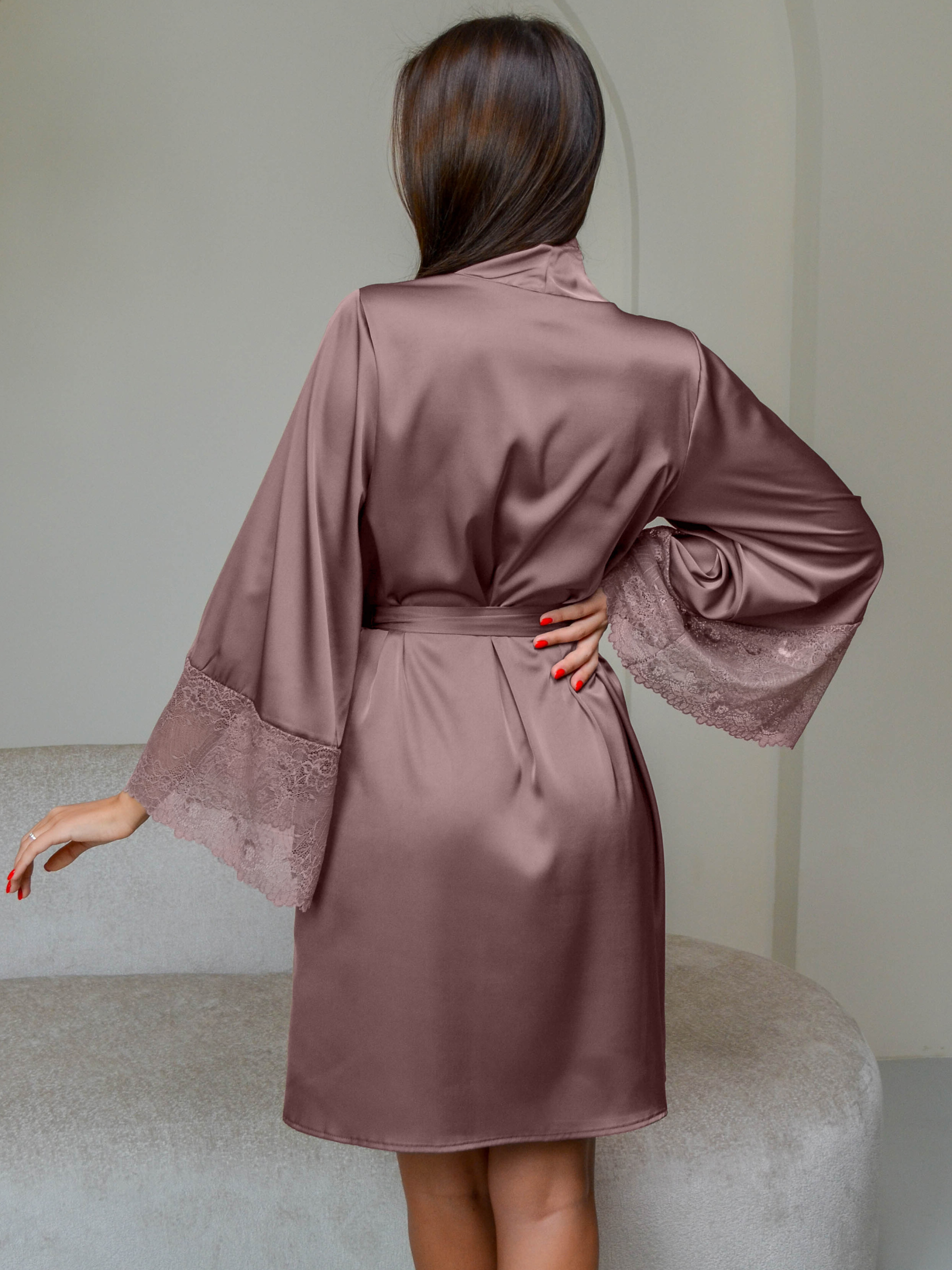 97% polyester, 3% lycra. Домашній халат у кавовому відтінку створений для моментів, коли хочеться м’якості, ніжності й повного комфорту. Легка тканина делікатно торкається шкіри, красиво відблискуючи при світлі та створюючи акуратний, охайний силует. Широкі рукави з мереживною обробкою додають жіночності й прикрашають кожен рух, а пояс дозволяє регулювати посадку так, як тобі зручно. Кавовий колір виглядає глибоко та благородно, легко поєднується з нічною сорочкою або піжамою в тон. Халат ідеально підходить для ранкових ритуалів, вечірнього відпочинку чи неспішних вихідних вдома − він створений, щоб дарувати затишок у будь-який момент дня. Завдяки продуманому крою він не сковує рухів, а м’яка гладка тканина робить кожне торкання приємним. Це стильний домашній одяг для тих, хто обирає красу, природність і сучасний комфорт. Халат можна замовити та купити онлайн у кілька простих кроків − і вже зовсім скоро він стане частиною твого щоденного затишку. Відтінок тканини та мереживна обробка можуть мати легкі відмінності від зображення через особливості фото та передачі кольору на різних пристроях.