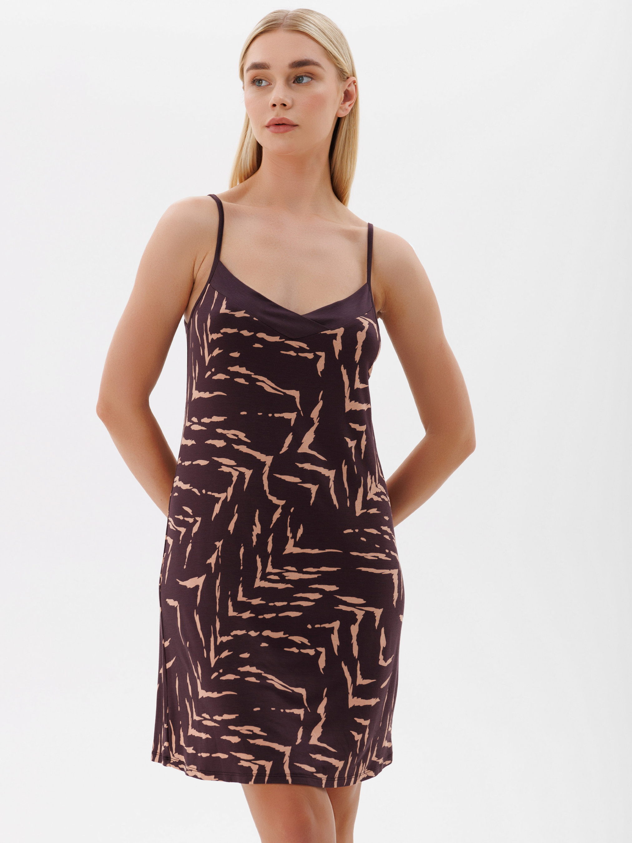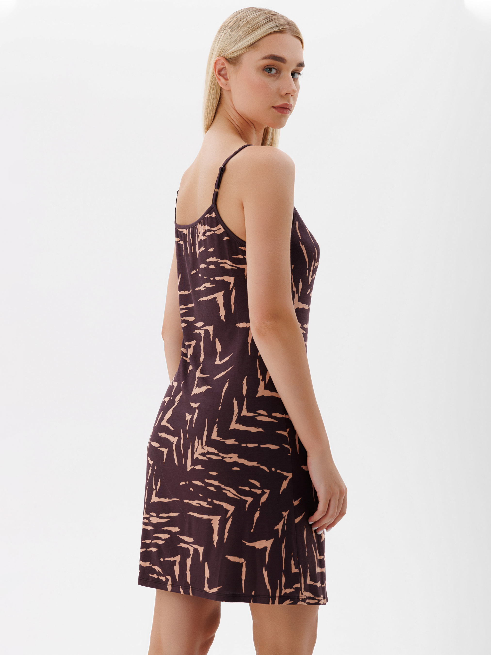 95% viscose, 5% elastane. Елегантна нічна сорочка-сукня з абстрактним принтом. Створена для вашого комфортного відпочинку. Ідеальний вибір жінок, які цінують зручність та стиль кожну мить.