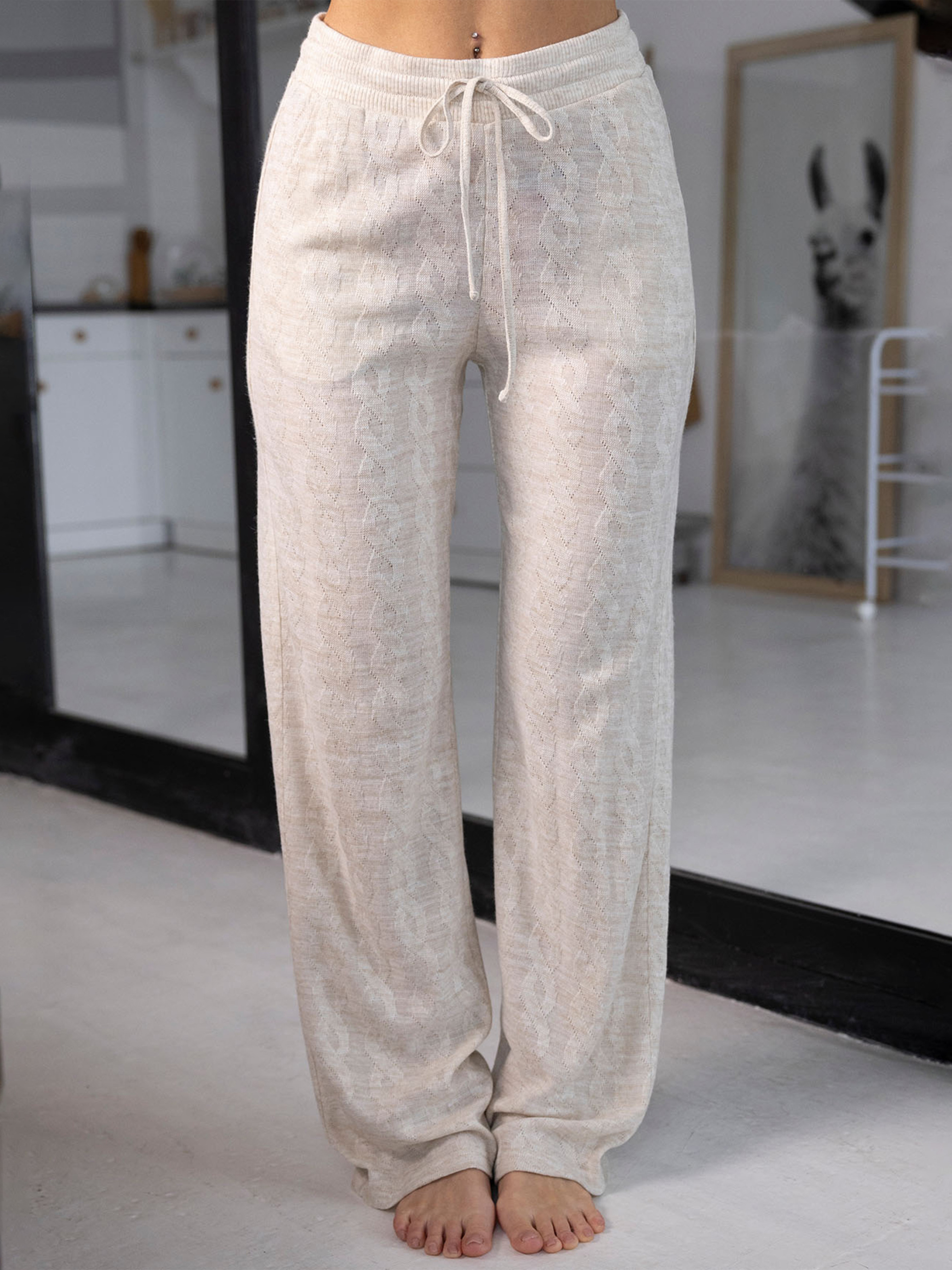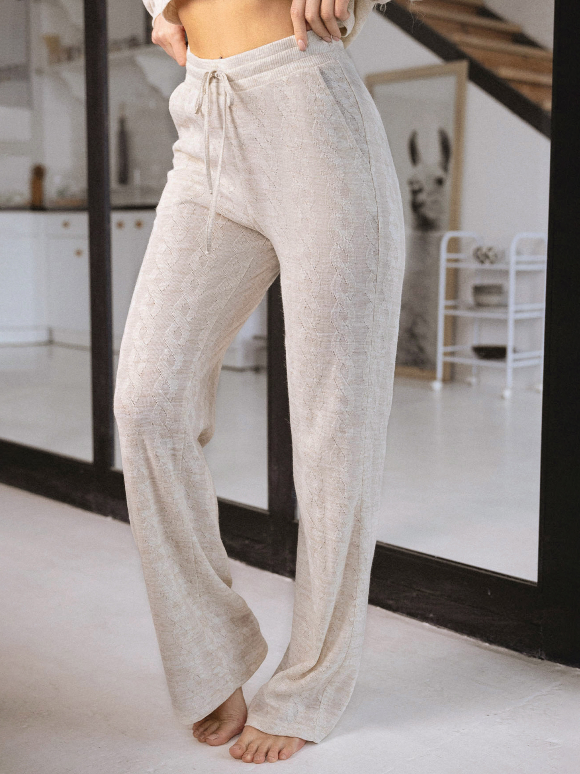 70%acrylic 20%viscose 10%polyamide. Жіночі домашні штани які увібрали у себе найкраще - ніжний колір, дрімливу стильну текстуру тканини, якість виконання та комфортну посадку. Завдяки використанню м'яких матеріалів і бездоганному пошиттю, вони забезпечують вам почуття затишку протягом всього дня. Штани підходять як для використання вдома, так і для модних міксів або активного відпочинку на відкритому повітрі, роблячи їх незамінним елементом вашого гардеробу.