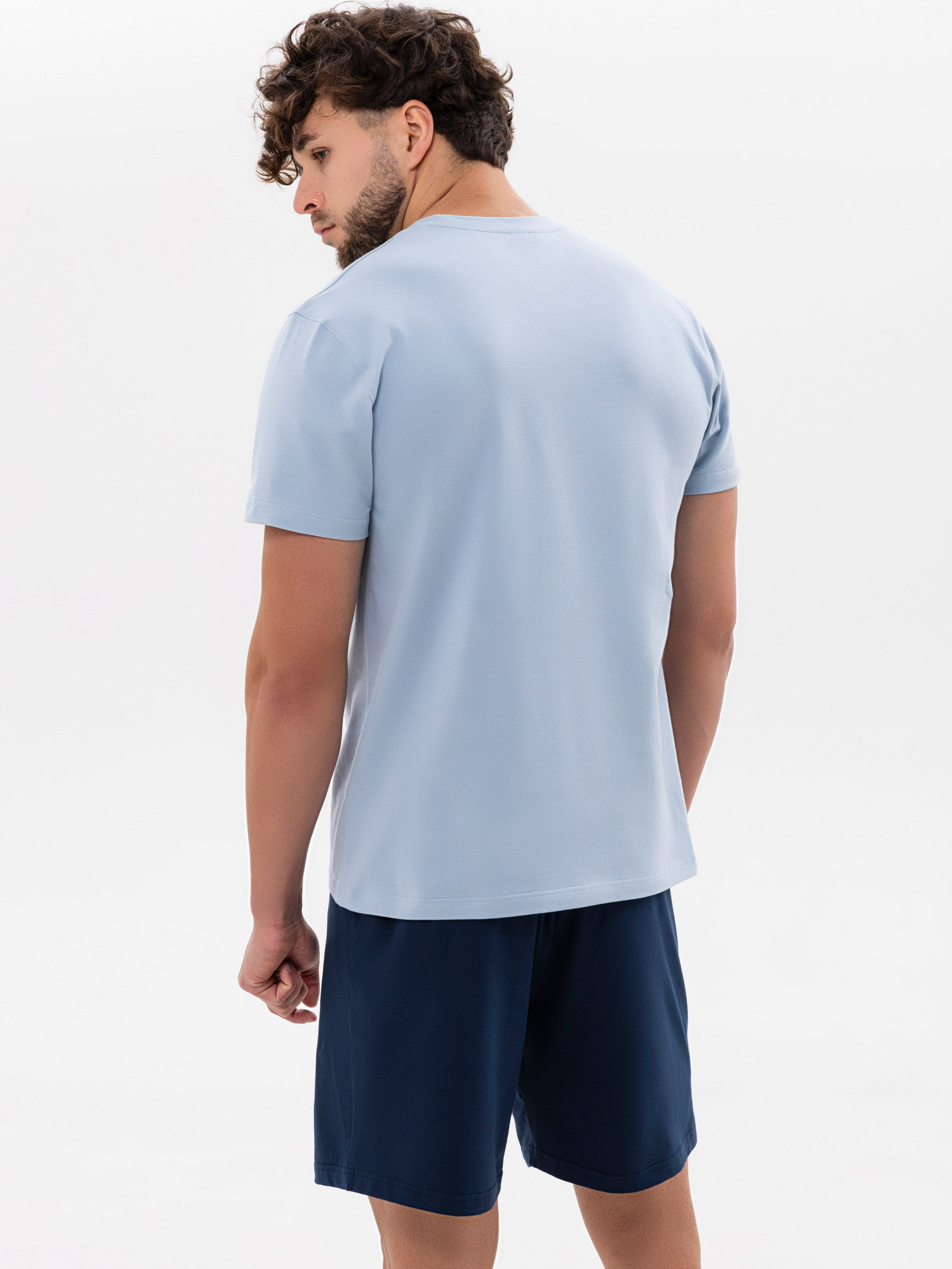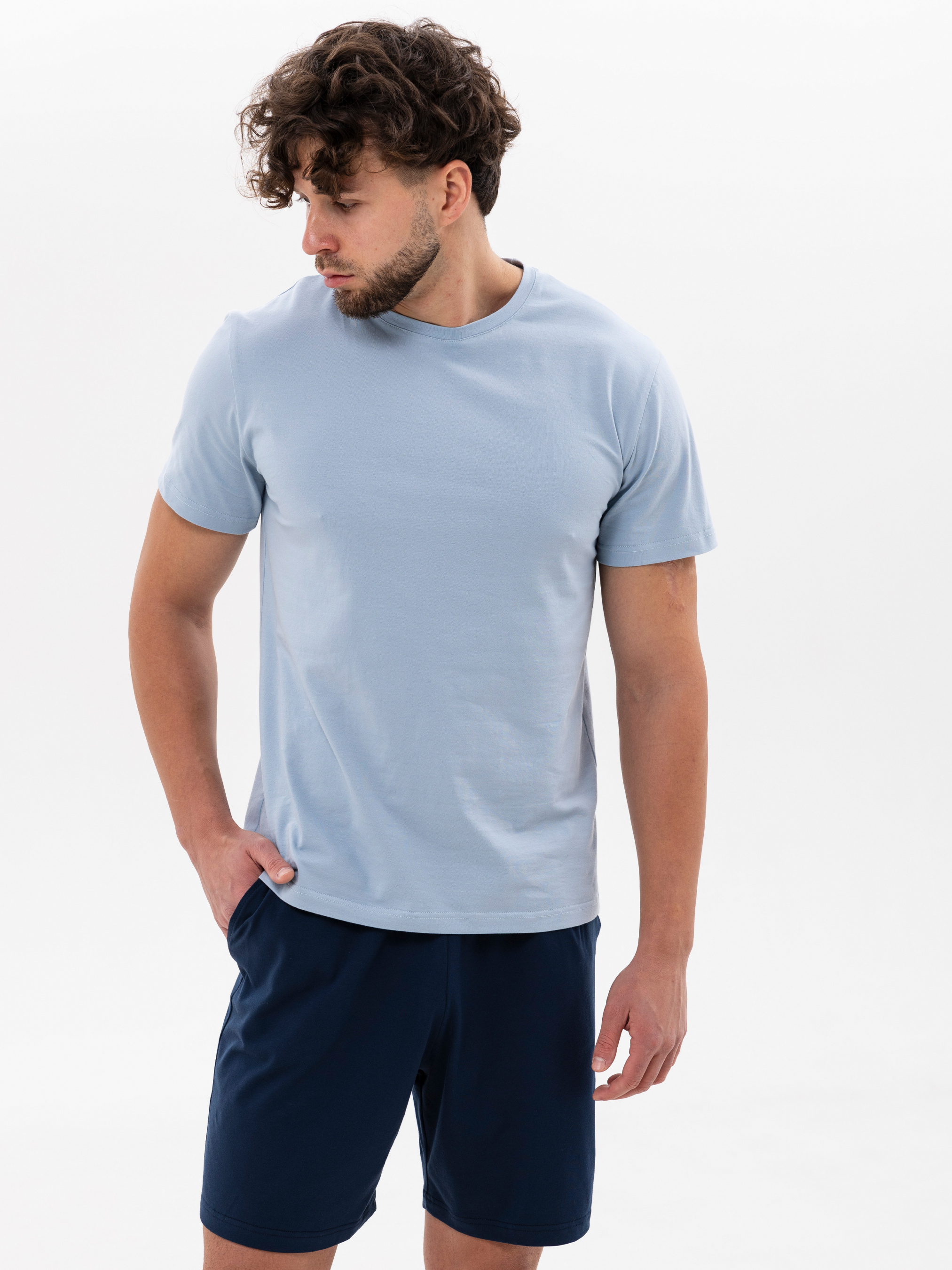 95% cotton, 5% elastane. Легкий, комфортний комплект для справжнього відпочинку. Світло-блакитна футболка має класичний крій, рівний насичений колір і м’яку текстуру, що приємно відчувається на шкірі. Бавовняна тканина з невеликою кількістю еластану добре тягнеться, зберігає форму і дозволяє тілу дихати.