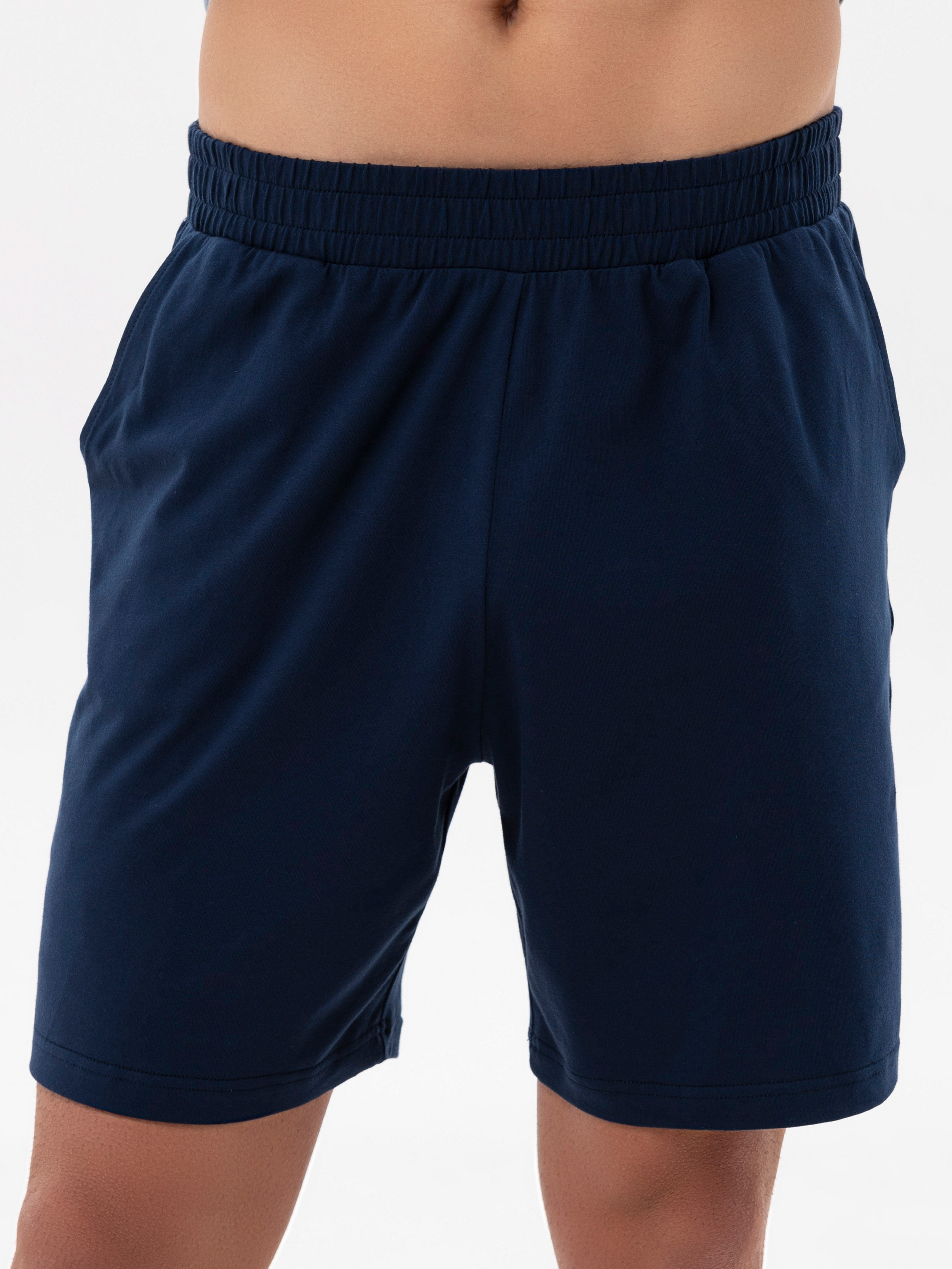 Темно-сині шорти виконані у форматі сімейних, що гарантує максимальну свободу рухів. Еластичний пояс м'яко фіксує посадку, а функціональні кишені додають зручності.