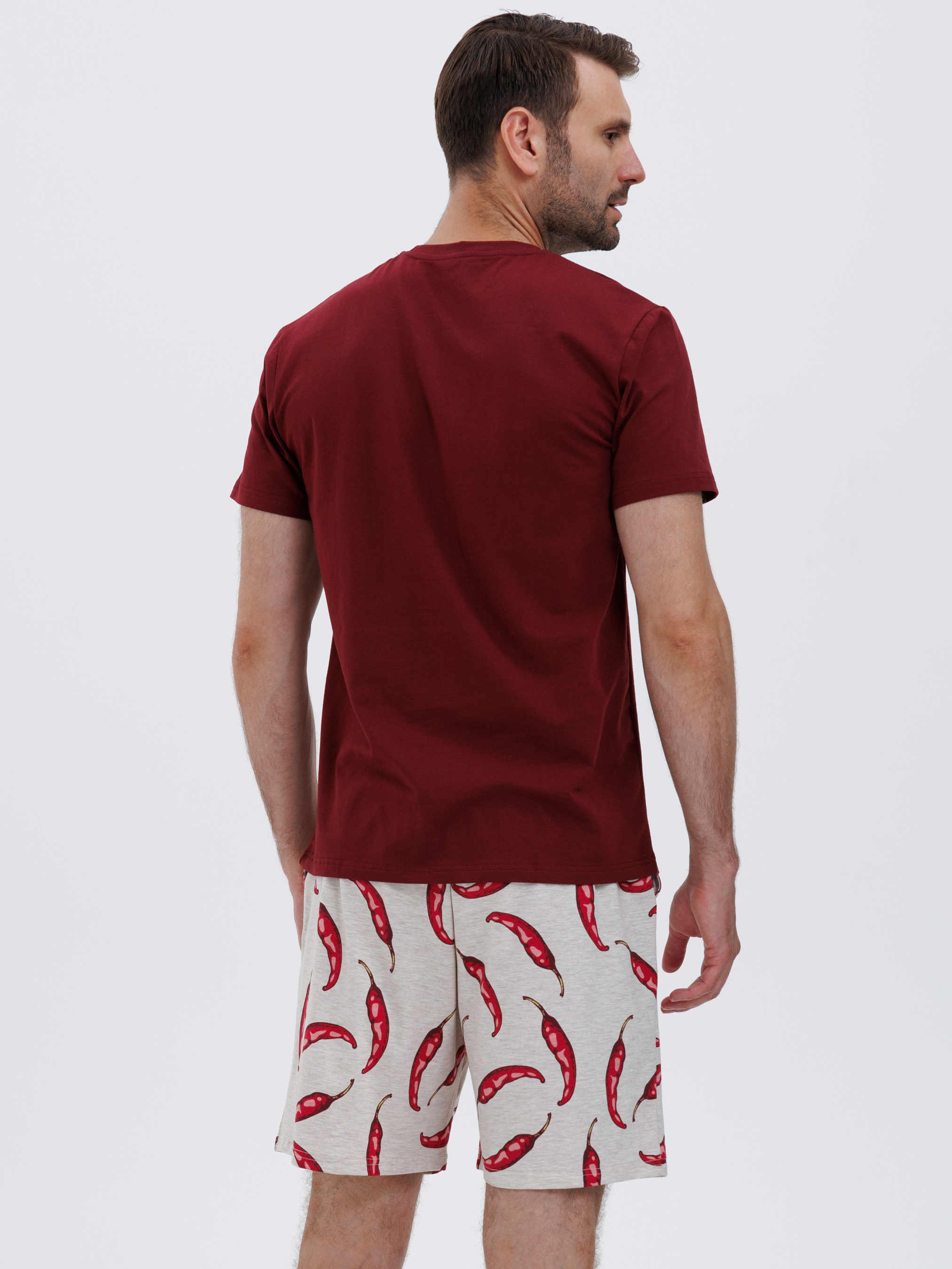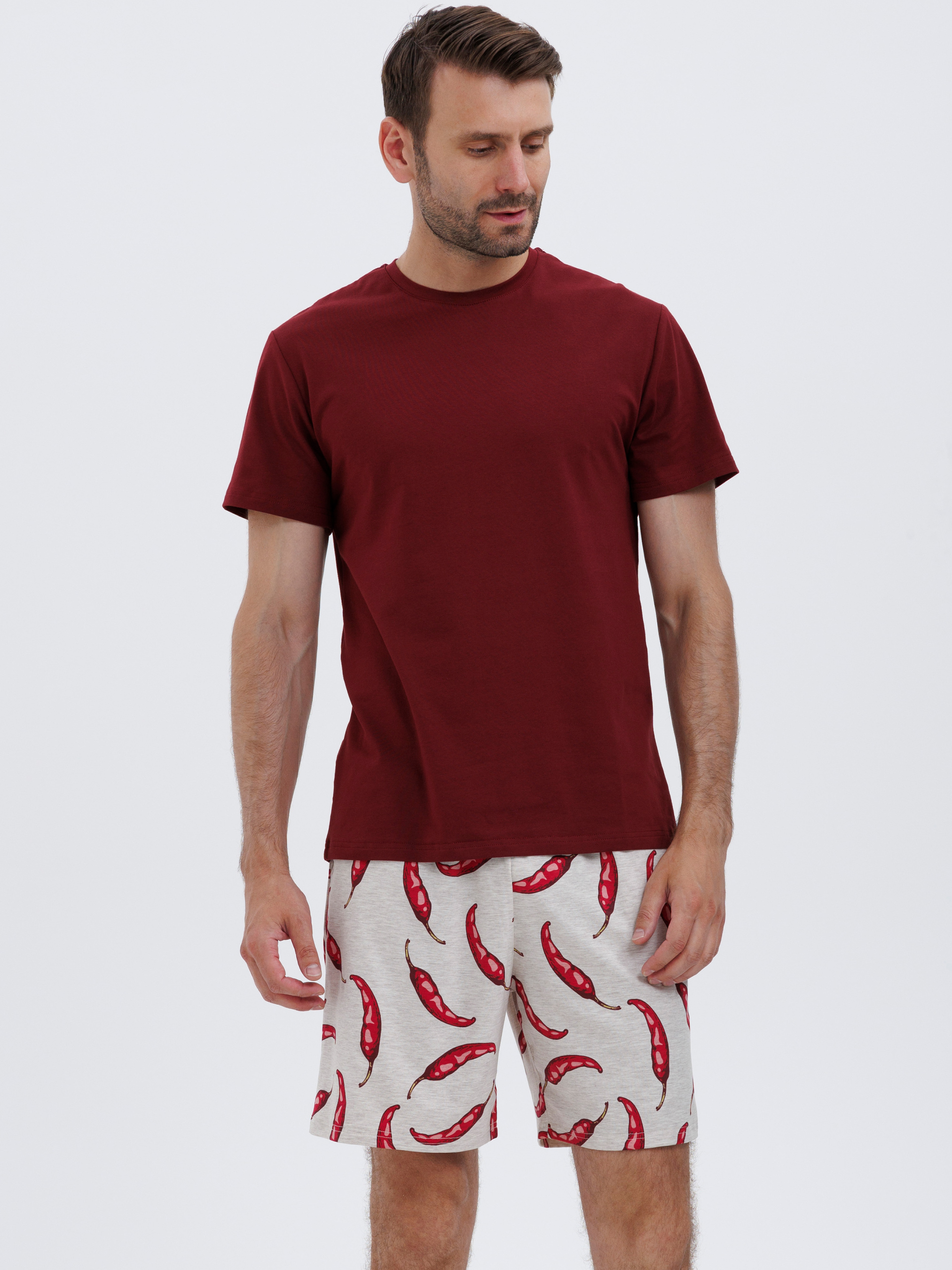 95% cotton, 5% elastaneСправжній унікальній підхід - ця піжама з принтом перцю чілі, яка вражає з першого погляду. У бежево-червоних тонах, вона зацентрує всю увагу на вас. Якісна бавовняна тканина забезпечує дихання всього тіла, вам не буде жарко чи холодно, бавовна зберігає правильний теплообмін. Шорти вільні та гарно сидять по фігурі, резинка поясу не натирає шкіру і не стягує її на талії.