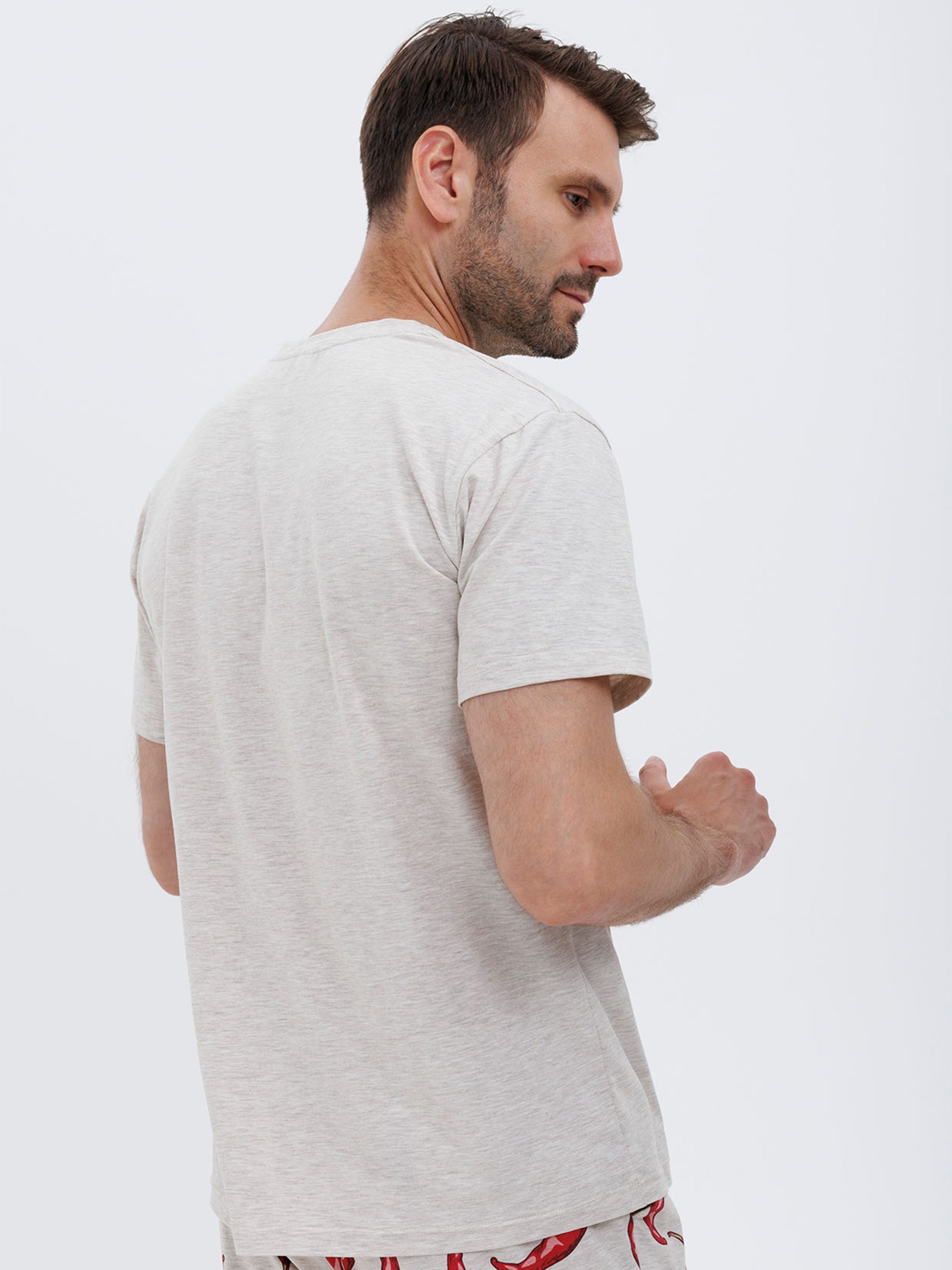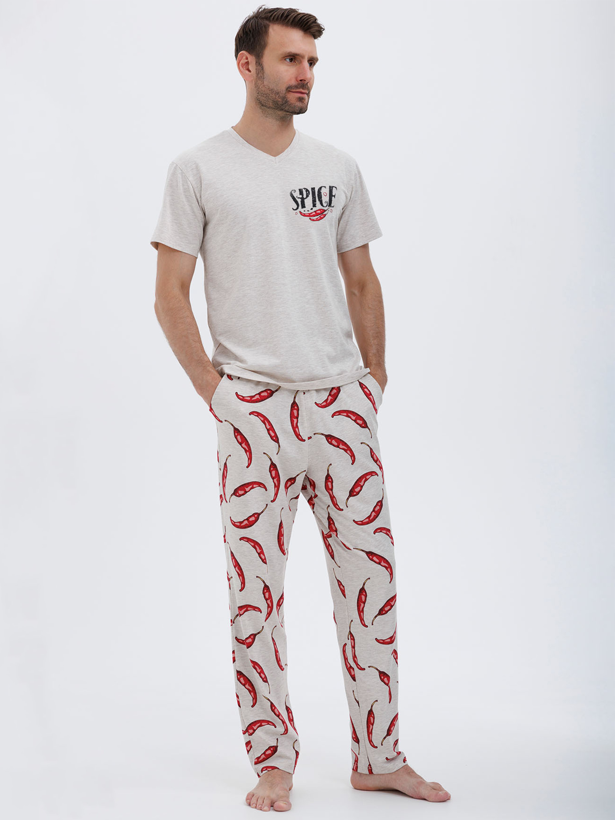 95% cotton, 5% elastaneЦя чоловіча піжама - ідеальний варіант для затишних вечорів вдома. Спокусливий и грайливий принт не залишиться без уваги, оригінальний спосіб здивувати вашу другу половинку. Футболка з прямим рукавом, вона комфортна, достатньо вільна для рухів, а завдяки тонкій дихаючий бавовні вам не буде жарко. Штани прямі і легкі, з двома кишенями по бокам у шві, добре сидять по талії. Увага до деталей гарантує якість пошиву і довговічність. Ця піжама забезпечить вам затишок і комфорт на кожному кроці вашу відпочинку.