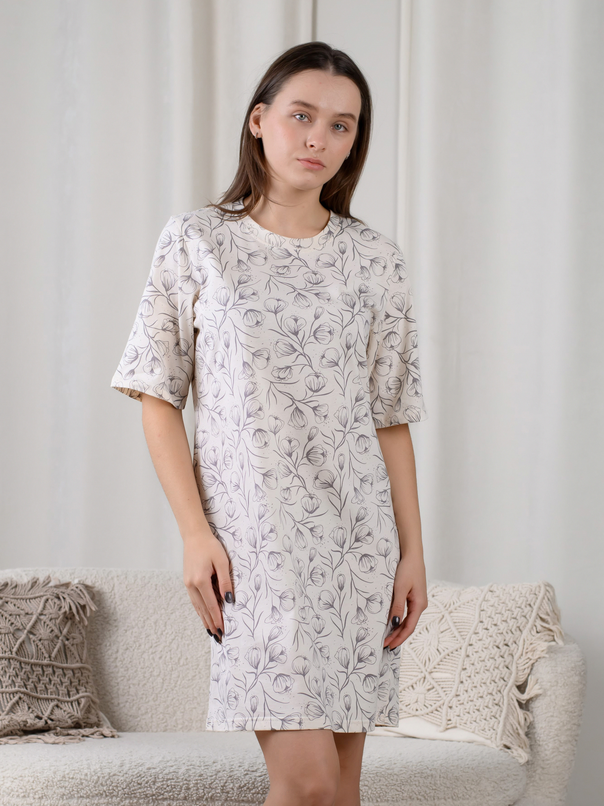 Туніка-футболка вільного крою з натуральної тканини 100% бавовна. Футболку можна використовувати як домашню туніку або ж як подовжену футболку влітку. 1.Прання:ручне або машинне при температурі 30–40°C, використовуйте делікатний режим прання. 2.Рекомендується вивертати речі навиворіт перед пранням 3.М’які миючі засоби, без відбілювачів 4.Уникайте кондиціонерів, якщо є еластан — це продовжить еластичність тканини 5.Краще сушити природним способом, в горизонтальному або вертикальному положенні 6.Не рекомендується сушка в пральній машині — може деформувати тканину 7.При невисокій температурі (до 110°C), краще прасувати через тонку тканину або навиворіт