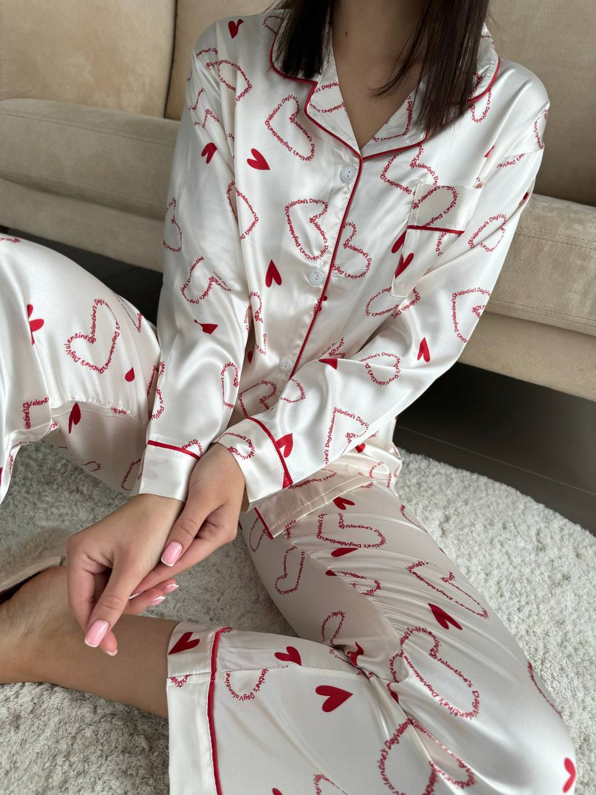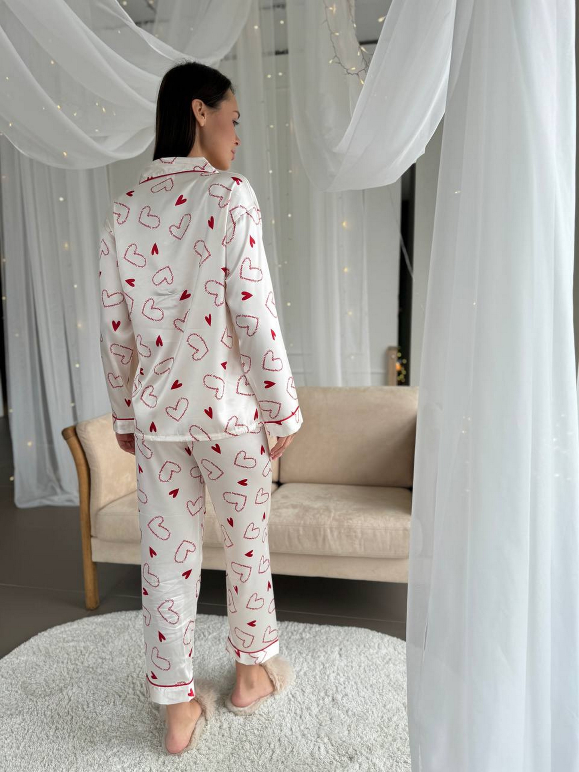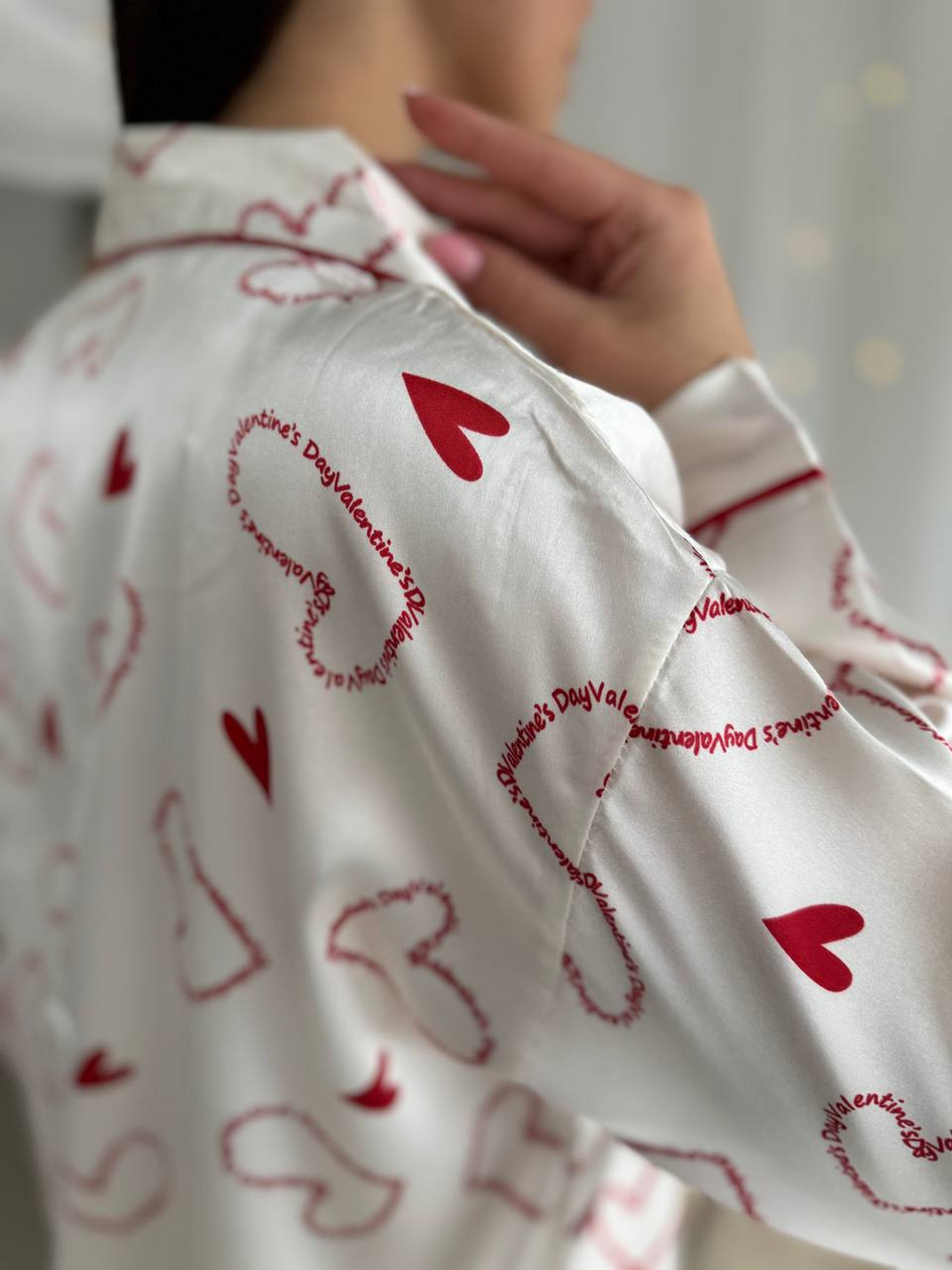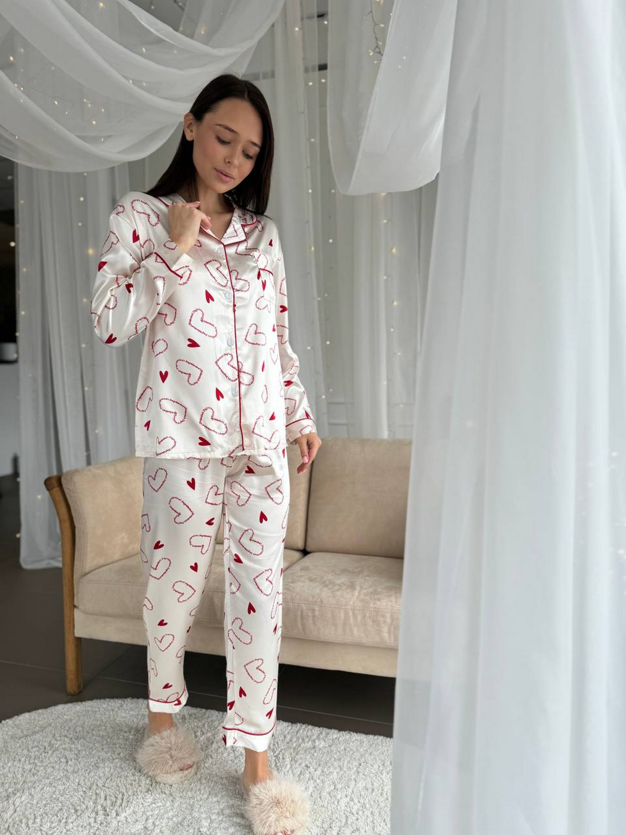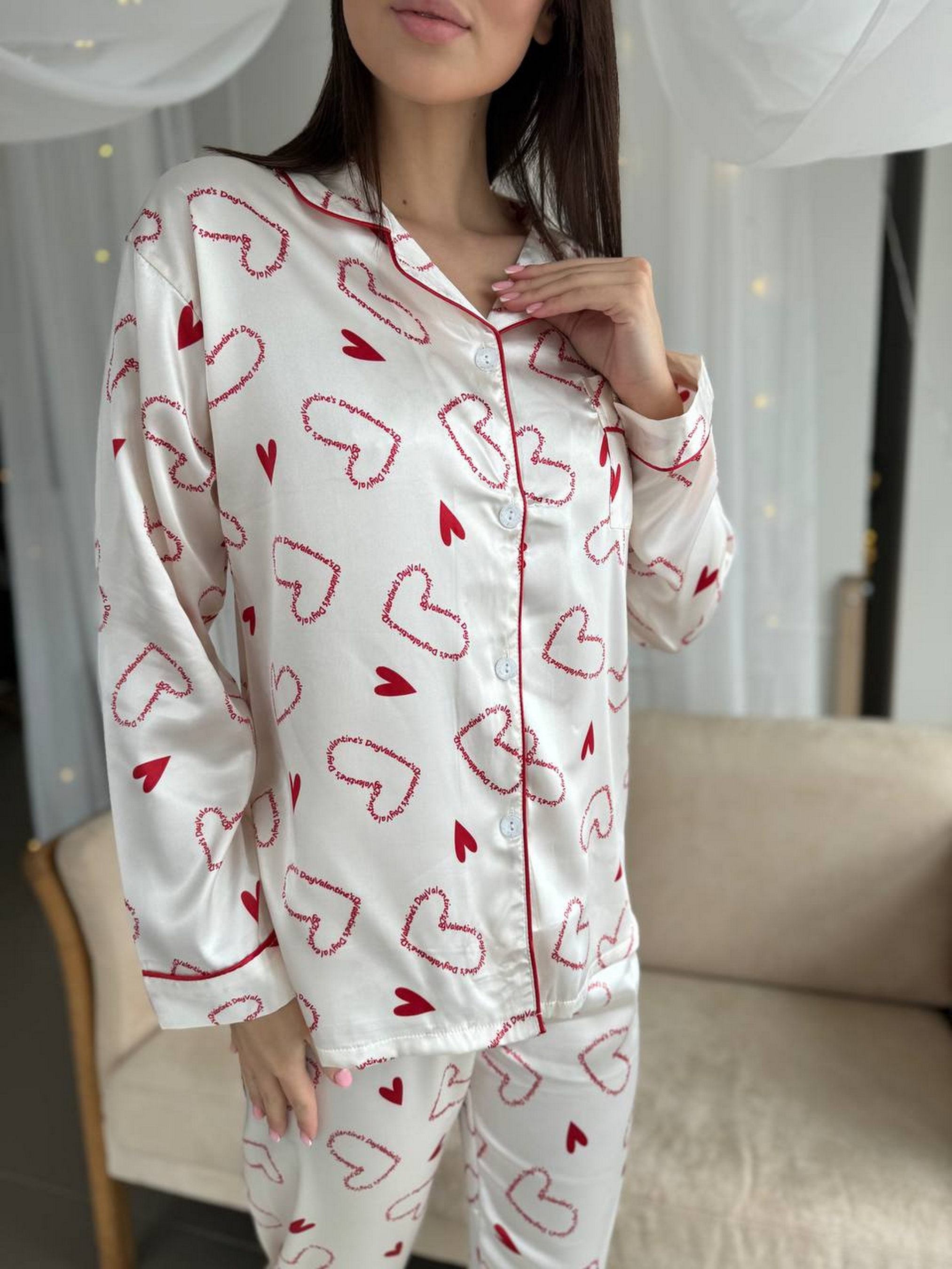 Легка і комфортна піжама з натурального шовку білого кольору з принтом у вигляді сердечок. Комплект складається зі сорочки та штанів на резинці з високою посадкою, що забезпечує зручність і свободу рухів. Матеріал приємний до тіла, дарує відчуття прохолоди і не викликає подразнень. Ідеальний вибір для домашнього відпочинку та сну. Розміри: M: груди 87-92 см, стегна 97-105 см L: груди 93-98 см, стегна 105-113 см XL: груди 98-104 см, стегна 112-120 см 2XL: груди 104-110 см, стегна 119-125 см
