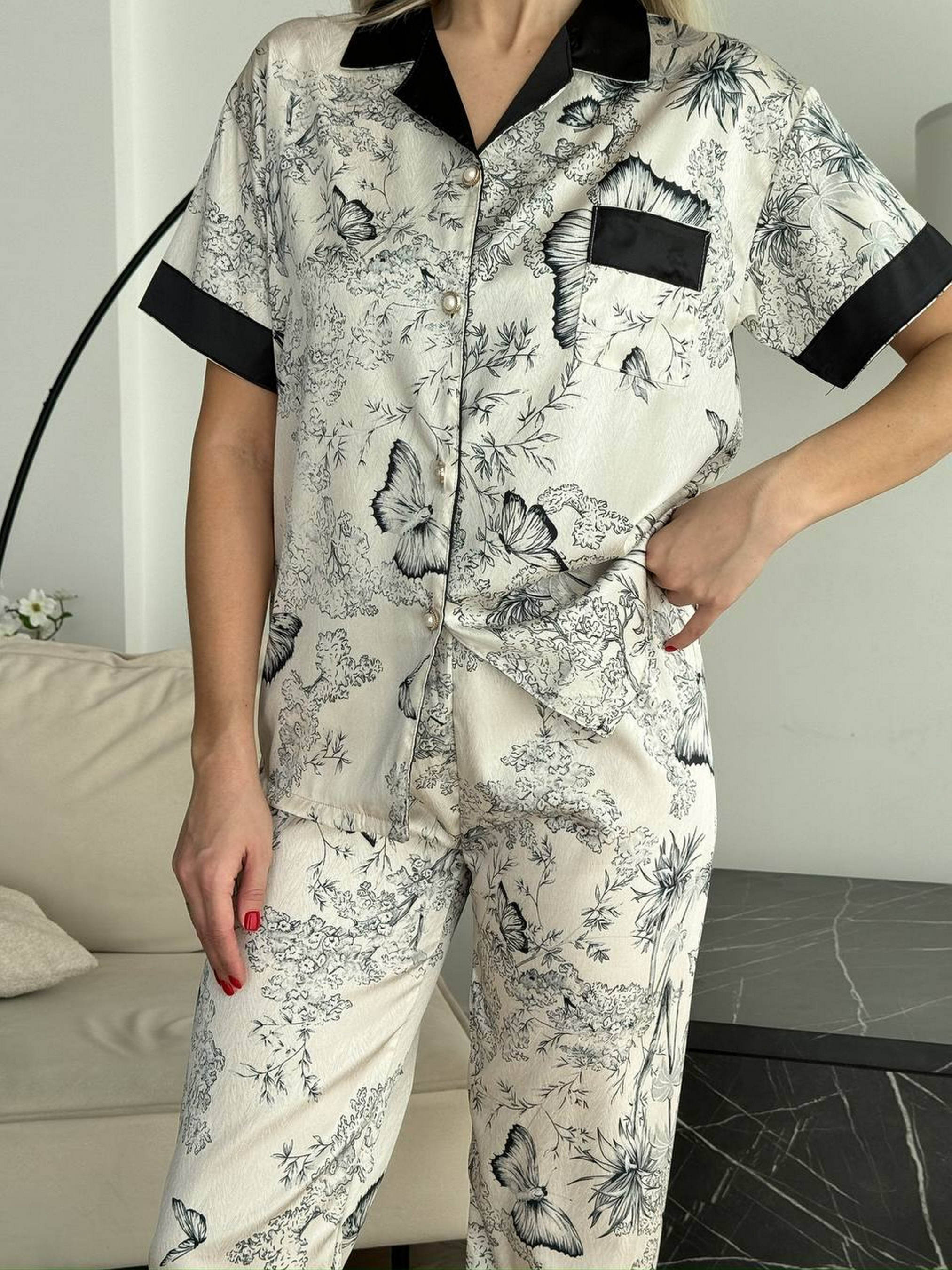 Піжама складається з сорочки та штанів на резинці з високою зручною посадкою. Виконана з натурального шовку. Комплект поєднує в собі комфорт та елегантність, ідеально підходить для домашнього відпочинку та сну. Розміри: М: груди 85-93, стегна 87-94 см L : груди 93-97, стегна 95-100 см XL: груди 97-102, стегна 100-106 см 2XL: груди 102-107, стегна 106-112 см