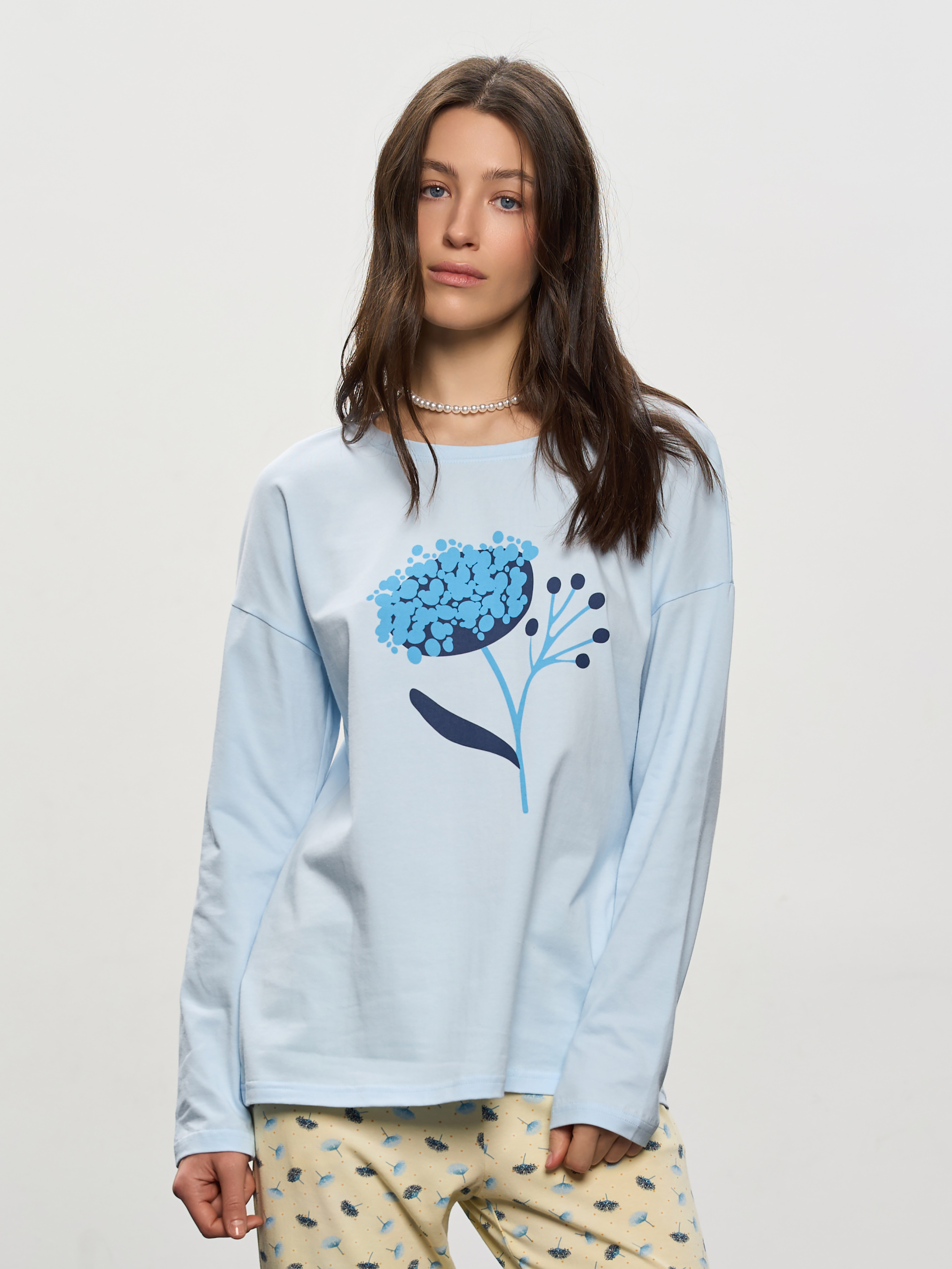 Яскравий лонгслів вільного крою з довгим рукавом. Зручні штани вільного крою, на резинці по талії виготовлені із бавовни з додаванням невеликої кількості лайкри (5%), яка забезпечує їх еластичність та допомагає не деформуватися тканині. Домашній костюм в яскравому кольорі - прекрасний вибір для жінок, адже домашній одяг повинен бути комфортним, екологічним та красивим.