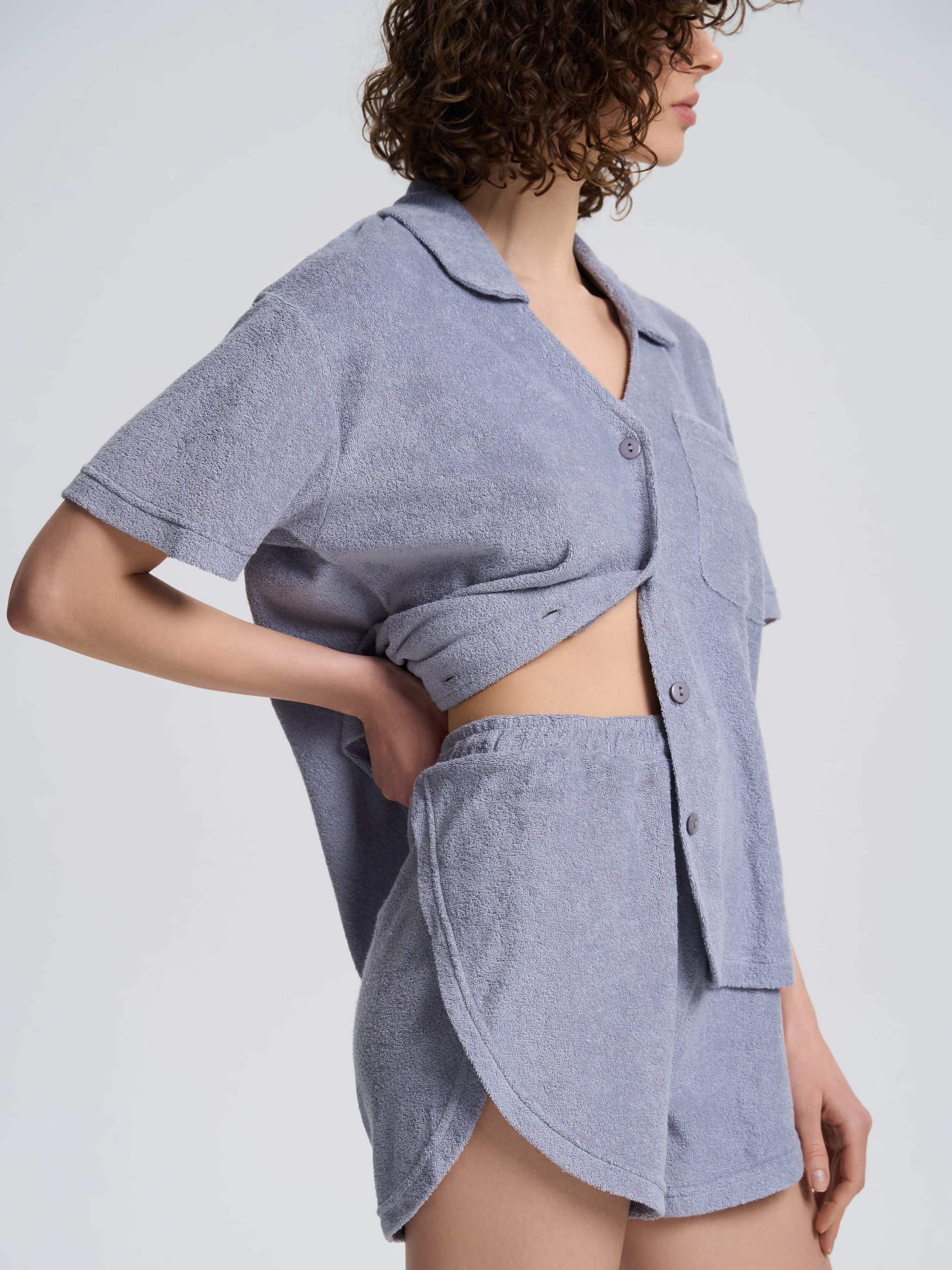 Жіноча піжама з м'якої махрової тканини — ідеальний вибір для комфортного відпочинку та сну. Комплект складається з сорочки вільного крою та шортів на еластичному поясі. Сорочка має класичний відкладний комір, короткі рукави та зручну застібку на ґудзики. Невелика накладна кишеня на грудях підкреслює стильність моделі. Шорти з м’яким поясом та шнурком забезпечують комфортну посадку, а фігурний крій додає легкості та свободи рухів. Завдяки приємній на дотик махровій тканині піжама чудово пропускає повітря, зберігаючи відчуття затишку та тепла. Ідеально підходить для домашнього носіння та комфортного сну. Матеріал махра - це тканина з дрібним ворсом на поверхні, створена на основі високоякісної натуральної бавовни. Вона має щільну структуру, міцна та стійка до зношування, добре зберігає колір після прання. Завдяки бавовні в складі, махрова тканина добре поглинає вологу та пропускає повітря. Високоякісна бавовняна махра гарантує м'якість за рахунок приємного на дотик ворсу. Добре тримає колір та не схильна до деформації. За рахунок текстури та середньої щільності відмінно драпірується. Рекомендації з догляду:рекомендується прати вручну при низькій температурі до 30°C. Уникати сушіння під прямими сонячними променями. Віджимати на обертах не вище 800. Сушити при низькій температурі для збереження м'якості та пухнастості ворсу.