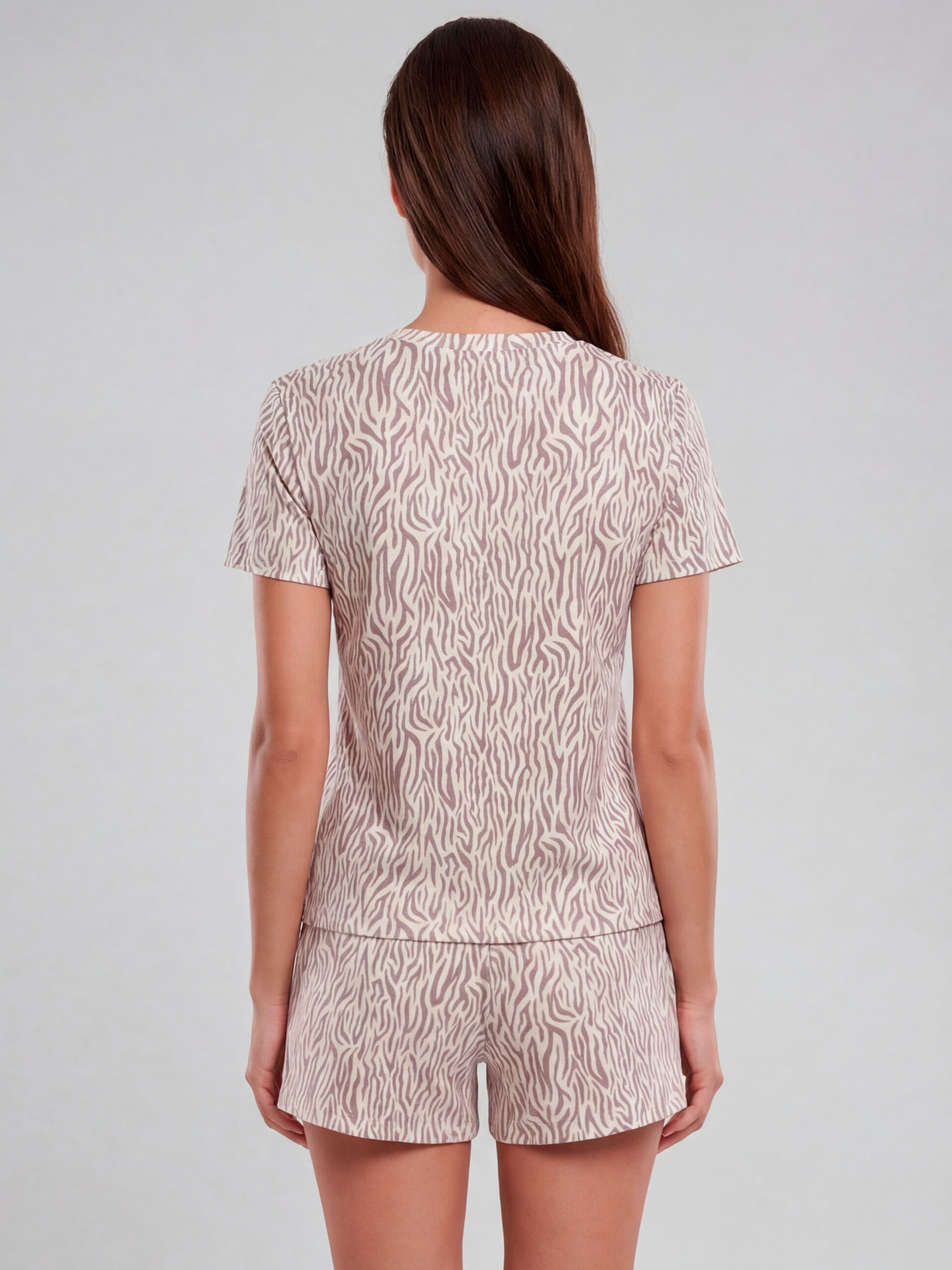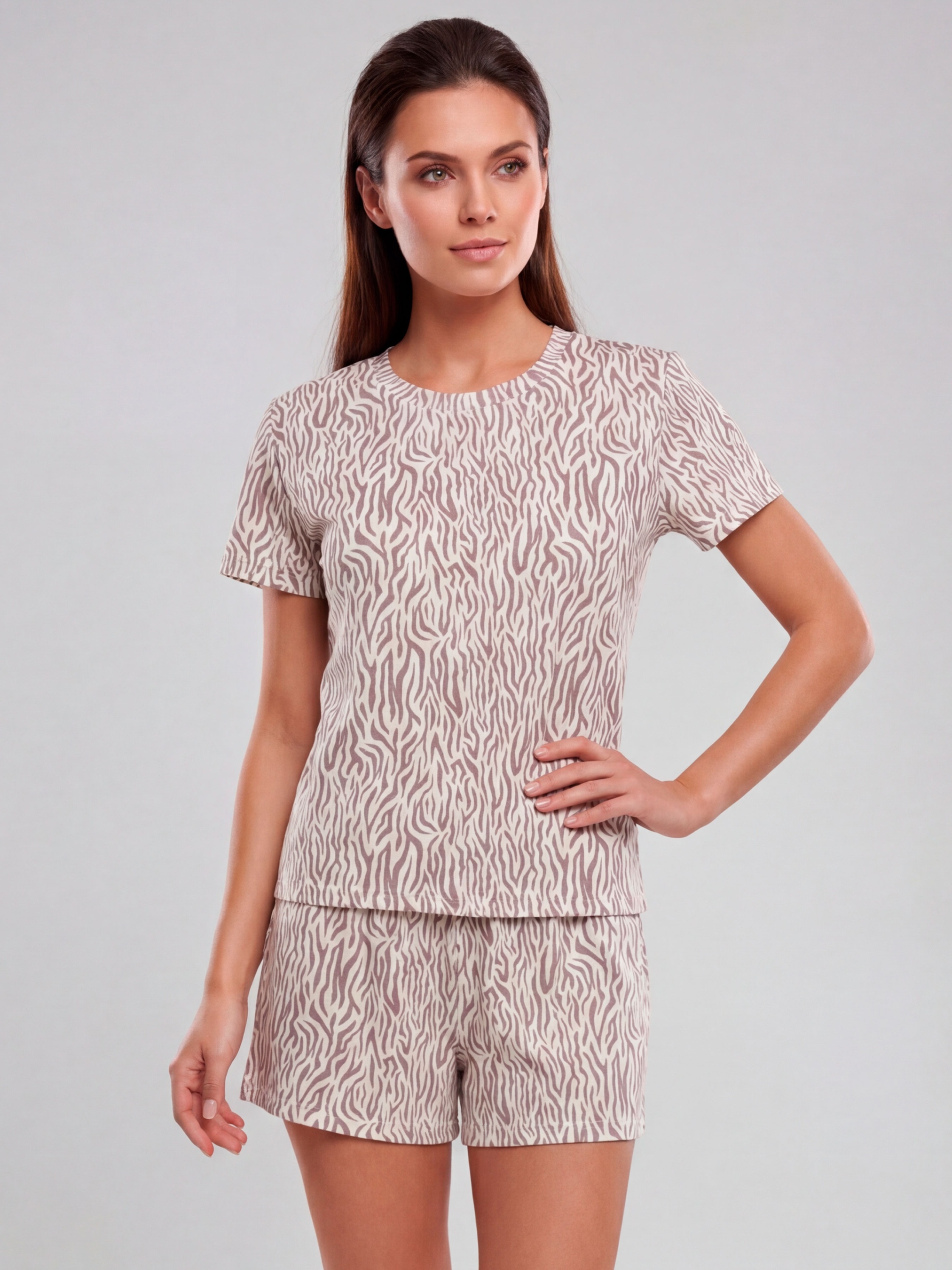 95% cotton, 5% elastane. Домашній комфорт може бути з настроєм — легким, грайливим, але все одно спокійним. Жіноча піжама з анімалістичним принтом кавового кольору — про саме такий баланс: ви в зручному комплекті, який пасує, але не забирає всю увагу. Футболка класика, прямого крою приємно сідає, а шорти мають комфортну посадку для повного розслаблення — від вечірнього відпочинку до ранкових справ. Анімалістика в стриманій палітрі додає образу “родзинку”, не перевантажуючи загальну ніжність колекції. Тут важливо відчути тканину: натуральна бавовна дихає, м’яко торкається шкіри й дарує легкість. У цій піжамі з бавовни зручно спати, спокійно проводити час вдома, зустрічати вихідні — і не думати про дискомфорт. Це справді комфортна піжама, яка підтримує тіло в русі й у відпочинку однаково добре. Легкість, свобода рухів, комфорт протягом дня та простий догляд - переваги, що варто підкреслити. Якщо вам потрібна піжама з шортами як частина сучасного домашнього луку для жінок, і хочеться трохи принтової енергії — цей комплект підходить ідеально, тож варто замовити та купити. Зверніть увагу, що відтінок тканини та принт можуть мати незначні відмінності від зображення на фото через особливості освітлення під час зйомки або індивідуальні налаштування екрана вашого пристрою.