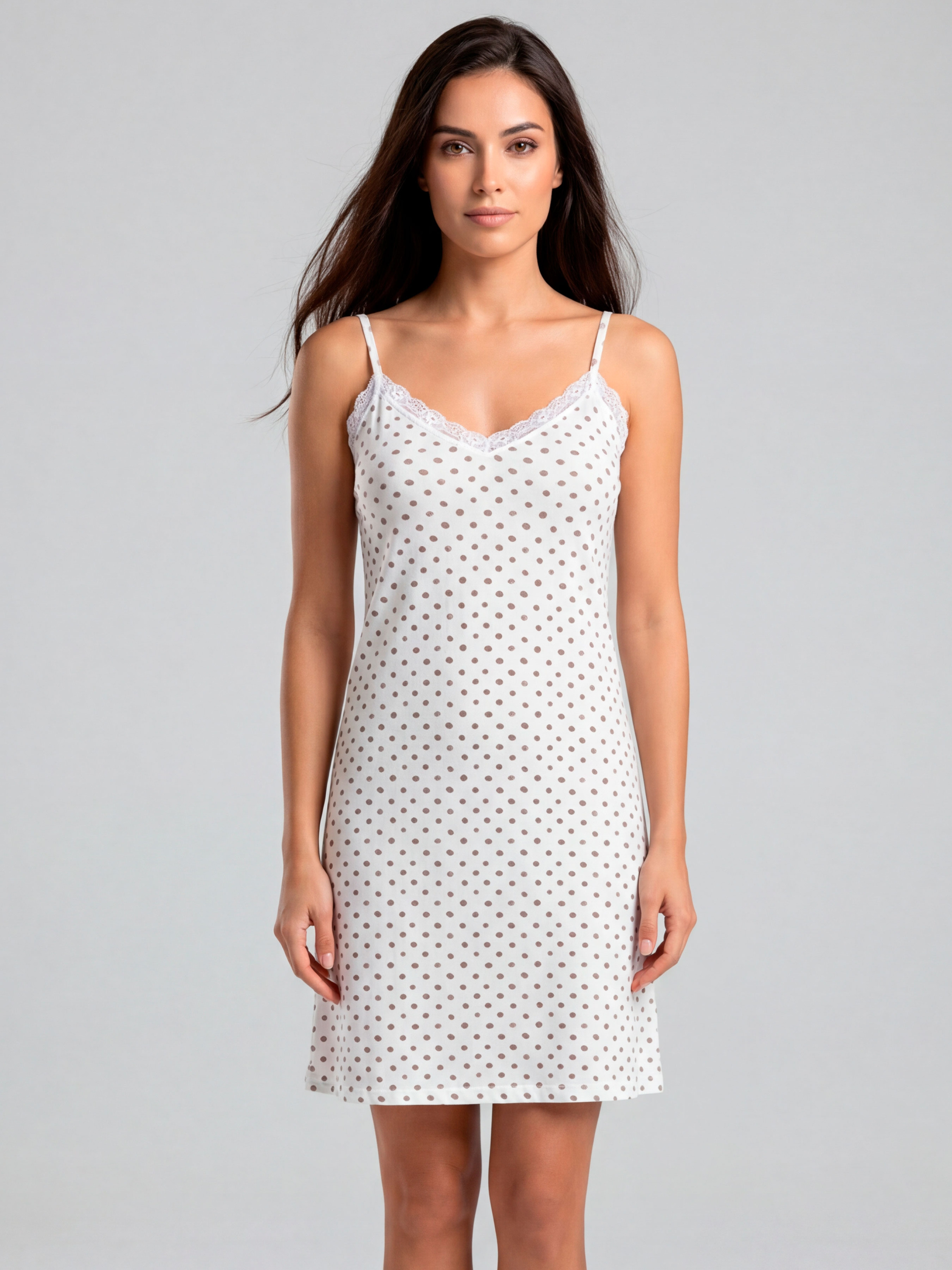 95% cotton, 5% elastane. Ніч починається з відчуття легкості — коли ніжна тканина торкається шкіри, а силует не обмежує жодного вашого руху. Нічна сорочка polka dot — про делікатну жіночність у мінімалізмі: тонкі бретелі підкреслюють лінію плечей, V-подібний виріз акуратно оформлено мереживом, а довжина міді дарує відчуття сукні й приватного затишку. Основа білого кольору з класичним принтом горох виглядає спокійно й дуже “домашньо”, а мереживо додає саме ту маленьку нотку, яка робить річ особливою. Матеріал — натуральна якісна бавовна: м’яка, дихаюча, приємна до тіла. Вона не “парить”, зовсім не подразнює, ідеально підходить для щоденного носіння вдома та для сну. У такій нічній сорочці відчуваєш себе бажаною жінкою кожну хвилину. У ній і легко засинати й так само легко прокидатися — без дискомфорту та чогось, що заважає або псує настрій. Серед переваг є легкість, свобода рухів, комфорт протягом дня (якщо любите ходити вдома в сорочці) та простий догляд. Це ідеальний варіант для вечірнього релаксу, ранкових ритуалів і вихідних у своєму темпі. Якщо ви шукаєте нічну сорочку на тонкій бретелі з акуратним декором, яку хочеться носити знов і знов — цю модель точно варто замовити та купити. Зверніть увагу, що відтінок тканини та принт можуть мати незначні відмінності від зображення на фото через особливості освітлення під час зйомки або індивідуальні налаштування екрана вашого пристрою.