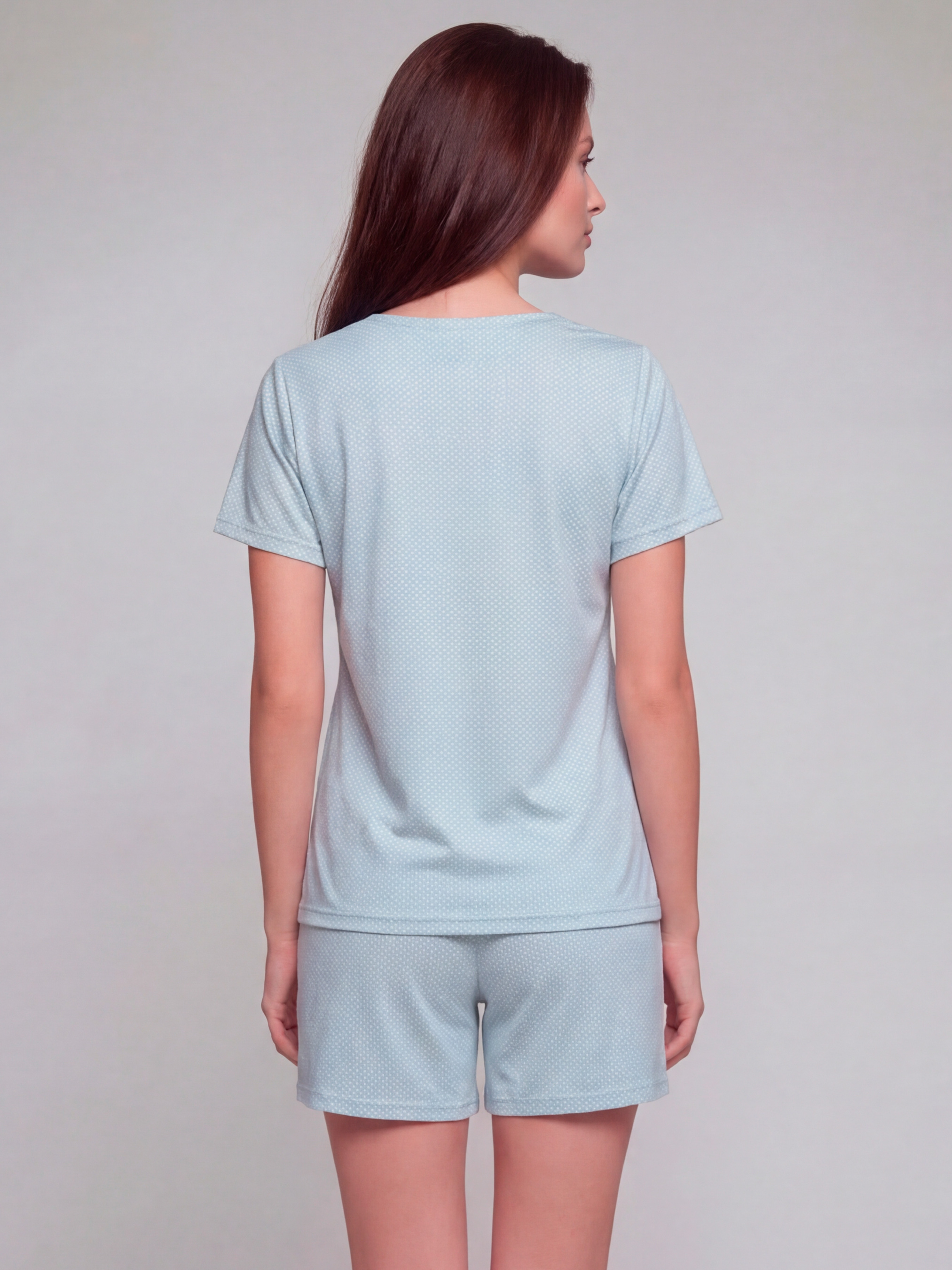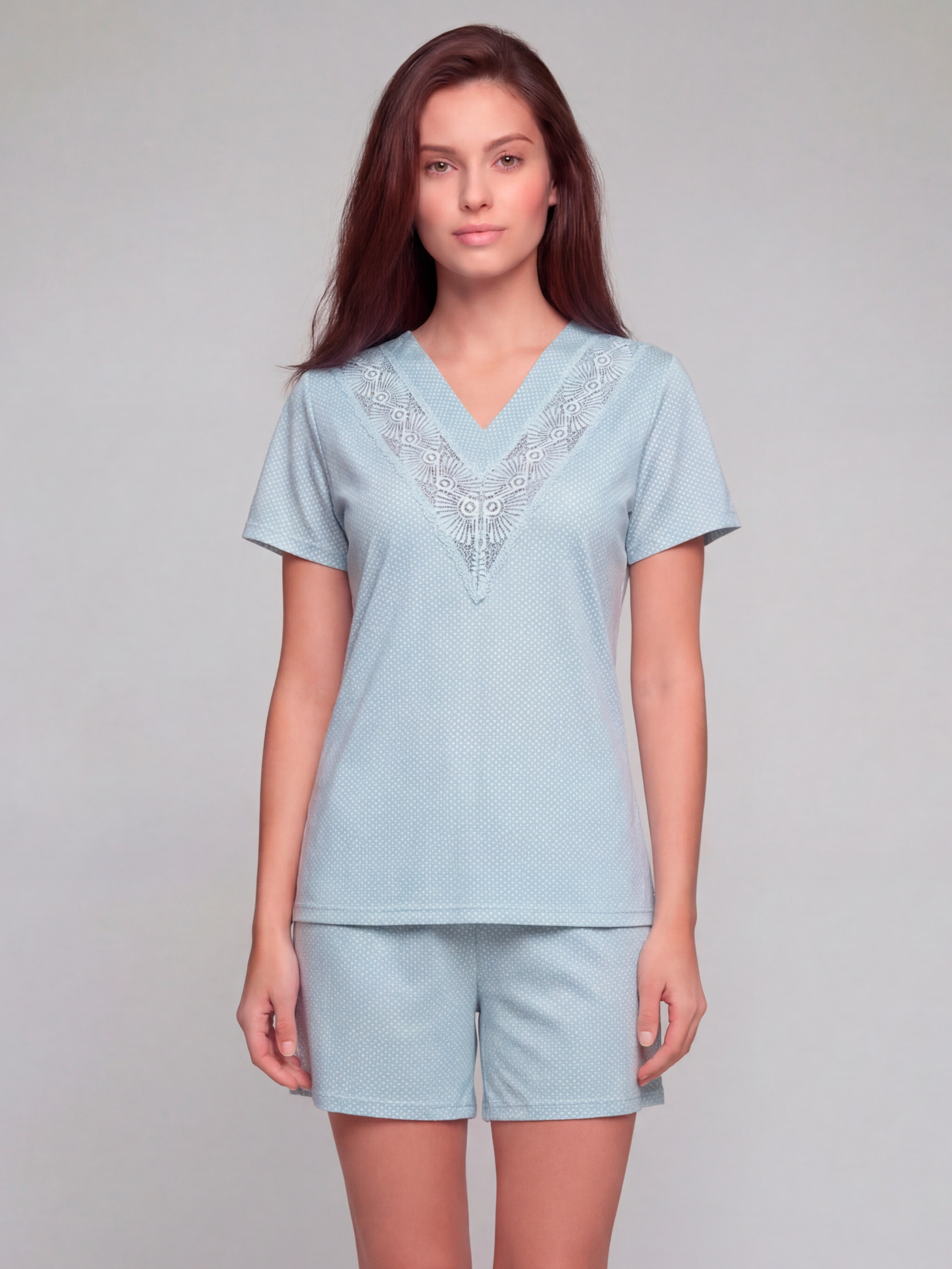 95% cotton, 5% elastane. Для домашнього відпочинку особливо хочеться вибирати речі, у яких легко рухатися, приємно проводити час і комфортно засинати. Піжама з колекції MOLLY створена для жінок, які шукають саме такі відчуття — спокій та затишок. Комплект складається з футболки та шортів, тому виглядає легко й зручно для щоденного носіння вдома. Футболка має прямий необтяжуючий силует, короткий рукав і глибокий V-виріз із широкою мереживною вставкою, яка робить верх виразним і жіночним. Шорти доповнюють цей комплект, зберігаючи відчуття свободи рухів. Ніжний блакитний колір у дрібний горошок додає піжамі свіжості, легкості та м’якого домашнього настрою. Бавовна дарує тілу комфорт, добре дихає й залишається приємною навіть під час тривалого носіння. Така піжама з шортами чудово підходить для сну, ранкової кави вдома, вечірнього відпочинку та затишних вихідних без поспіху. Піжама з бавовни поєднує м’якість, практичність і легкий жіночний характер, тому стане вдалою частиною вашого домашнього гардероба. Це комфортна піжама для тих, хто цінує домашній одяг, який одразу хочеться замовити та купити. Зверніть увагу, що відтінок тканини та принт можуть мати незначні відмінності від зображення на фото через особливості освітлення під час зйомки або індивідуальні налаштування екрана вашого пристрою.