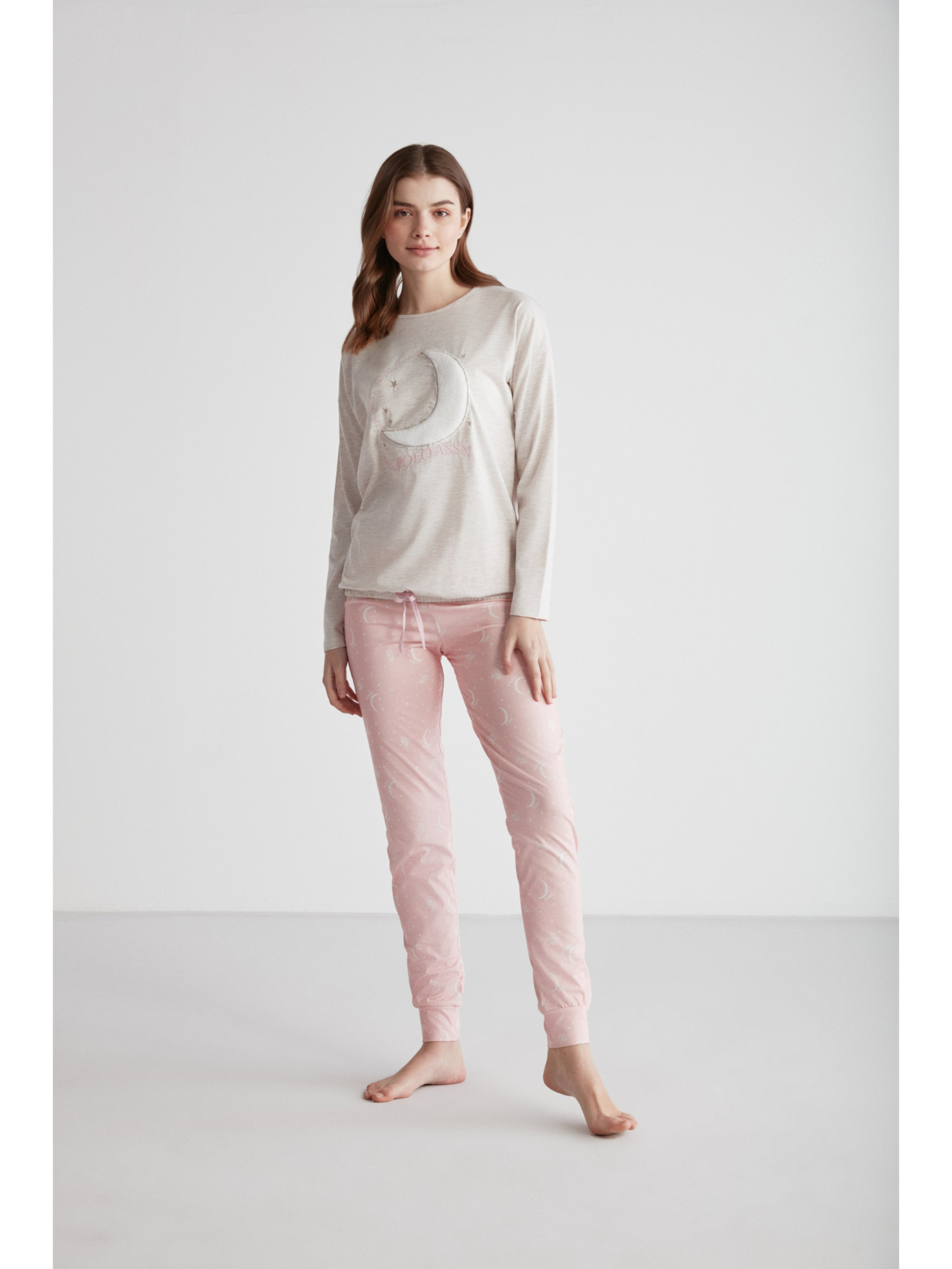 Жіноча піжама ТМ U.S. Polo Assn з індивідуальним дизайном. М'який та зручний комплект для дому чи сну. Складається з двох частин. Кофта на довгий прямий рукав. Круглий виріз горловини. Штани з манжетами внизу. Виготовлено з високоякісних матеріалів з підвищеною стійкістю до утворення ковтунів, комфортна для повсякденного носіння.