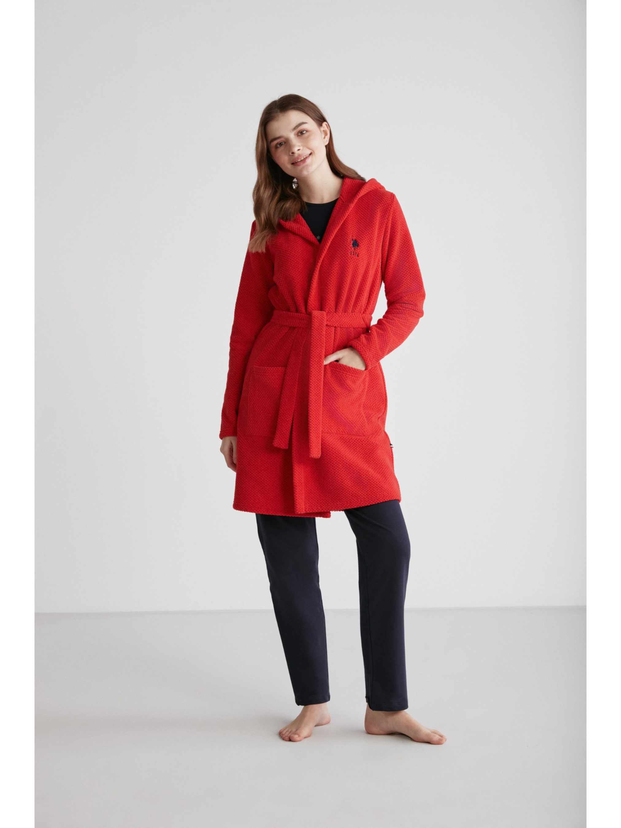 Жіночий теплий халат для дому ТМ U.S.POLO ASSN Модель доповнено просторим капюшоном та великими зручними кишенями спереду. Підв'язується поясом у тон виробу на талії. Дизайн доповнено логотипом бренду. Виріб виготовлено з високоякісних матеріалів, що забезпечить комфорт під час носіння.