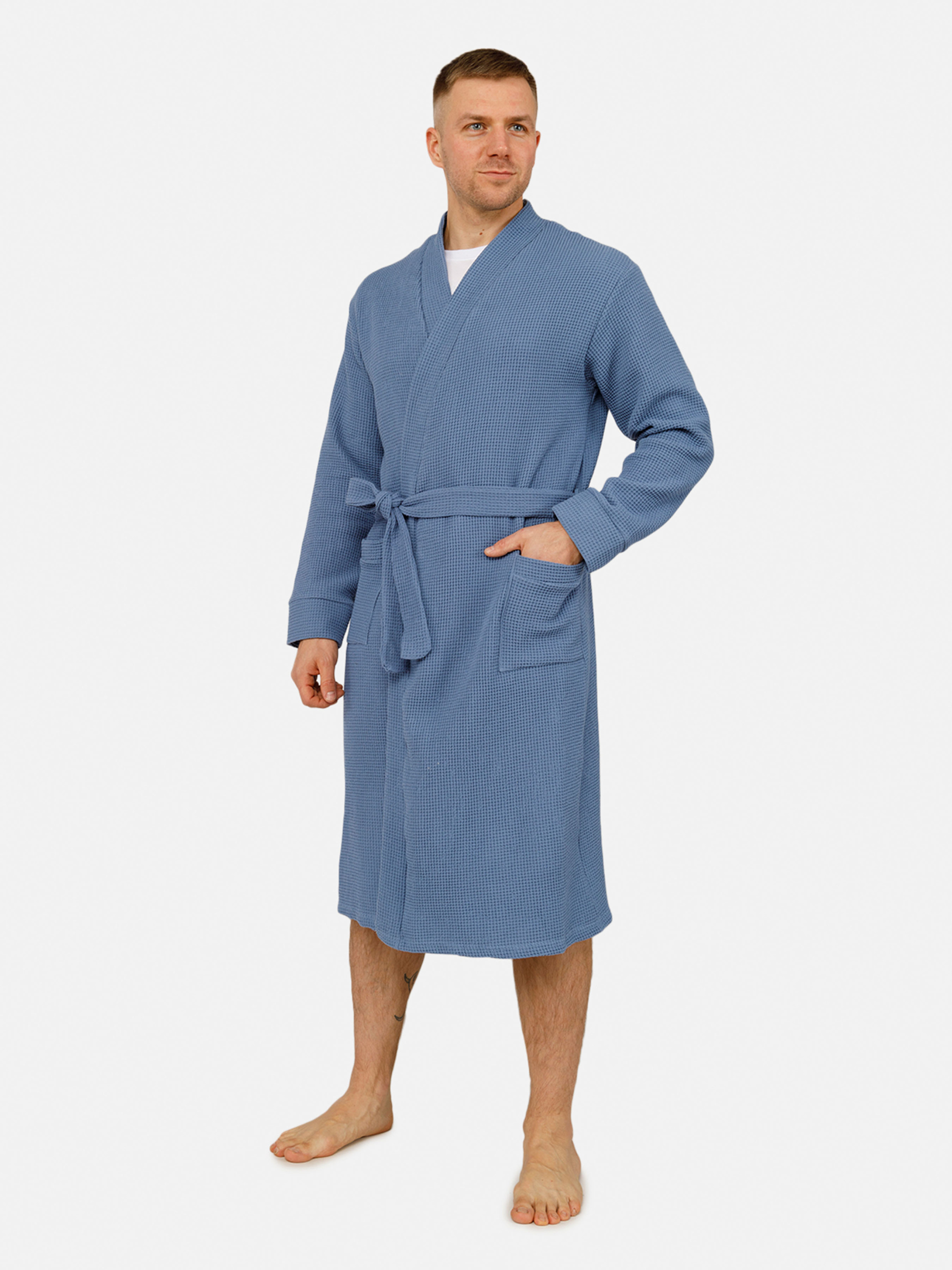 Чоловічий халат - це обов'язковий предмет одягу у гардеробі кожного сучасного чоловіка. Завдяки м'якій тканині, халат надійно зберігатиме тепло та буде надзвичайно комфортним для спокійного відпочинку вдома. Халат стане чудовим вибором для чоловіків, які цінують зручність та практичність без шкоди для стилю. Особливості: Колір халату: синій, однотонний. Матеріал виготовлення: трикотаж. Склад: 100 % бавовна. Халат має кишені. Рукав: довгий. Сезон: демісезон. Параметри моделі: Зріст: 180 сантиметрів. Розмір на моделі: 48. Країна виробник: Україна.