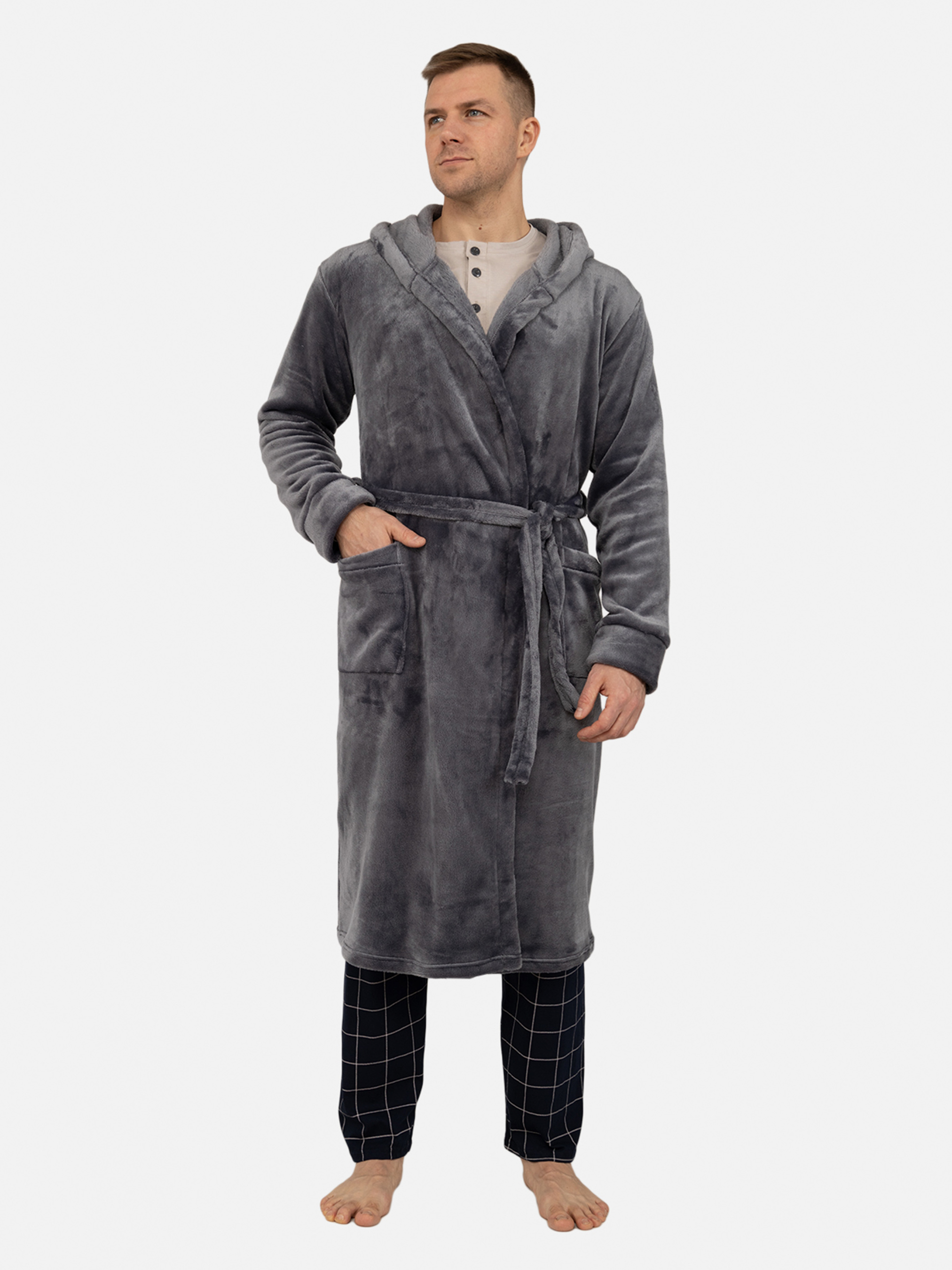 Чоловічий халат — чудовий вибір для комфортного відпочинку вдома. М'який і приємний на дотик матеріал створює відчуття тепла та затишку, забезпечуючи зручність після душу або в ранкові години. Класичний фасон із поясом дозволяє легко підігнати халат під індивідуальний розмір, забезпечуючи надійну посадку та свободу рухів. Практичний дизайн і нейтральний колір роблять його стильним елементом домашнього гардеробу, підходящим для будь-якого сезону. Халат легко доглядати, він зберігає м'якість та форму навіть після численних прань. Це ідеальний варіант для тих, хто цінує комфорт і якість у кожній деталі. Особливості халату: Колір: темно-сірий. Халат має довгий рукав. Матеріал виготовлення: фліс. Склад: 100 % поліестер.. Сезон: зима. Параметри моделі: Зріст: 180 сантиметрів. Розмір на моделі: L / український розмір - 46. Країна виробник: Україна.