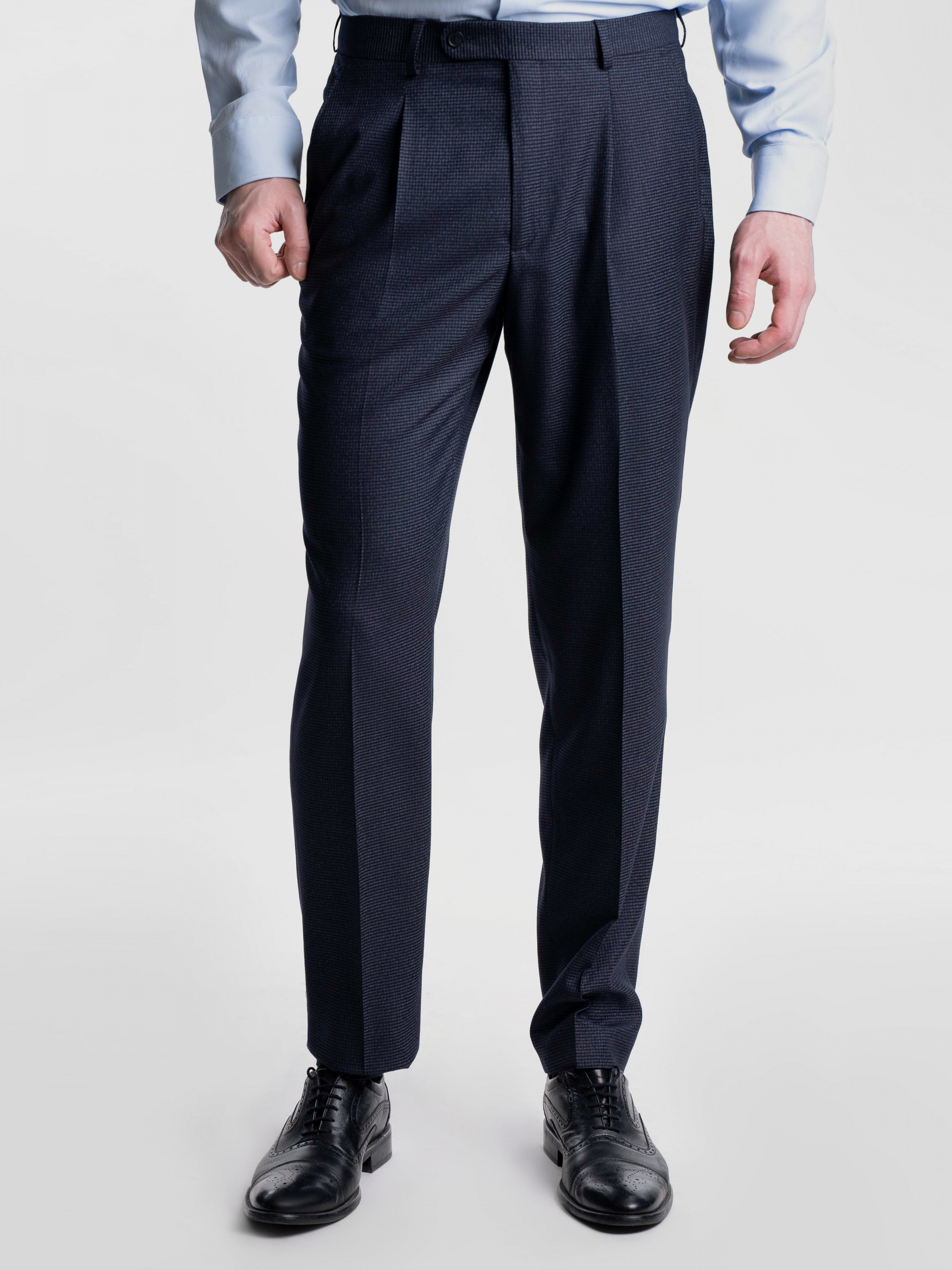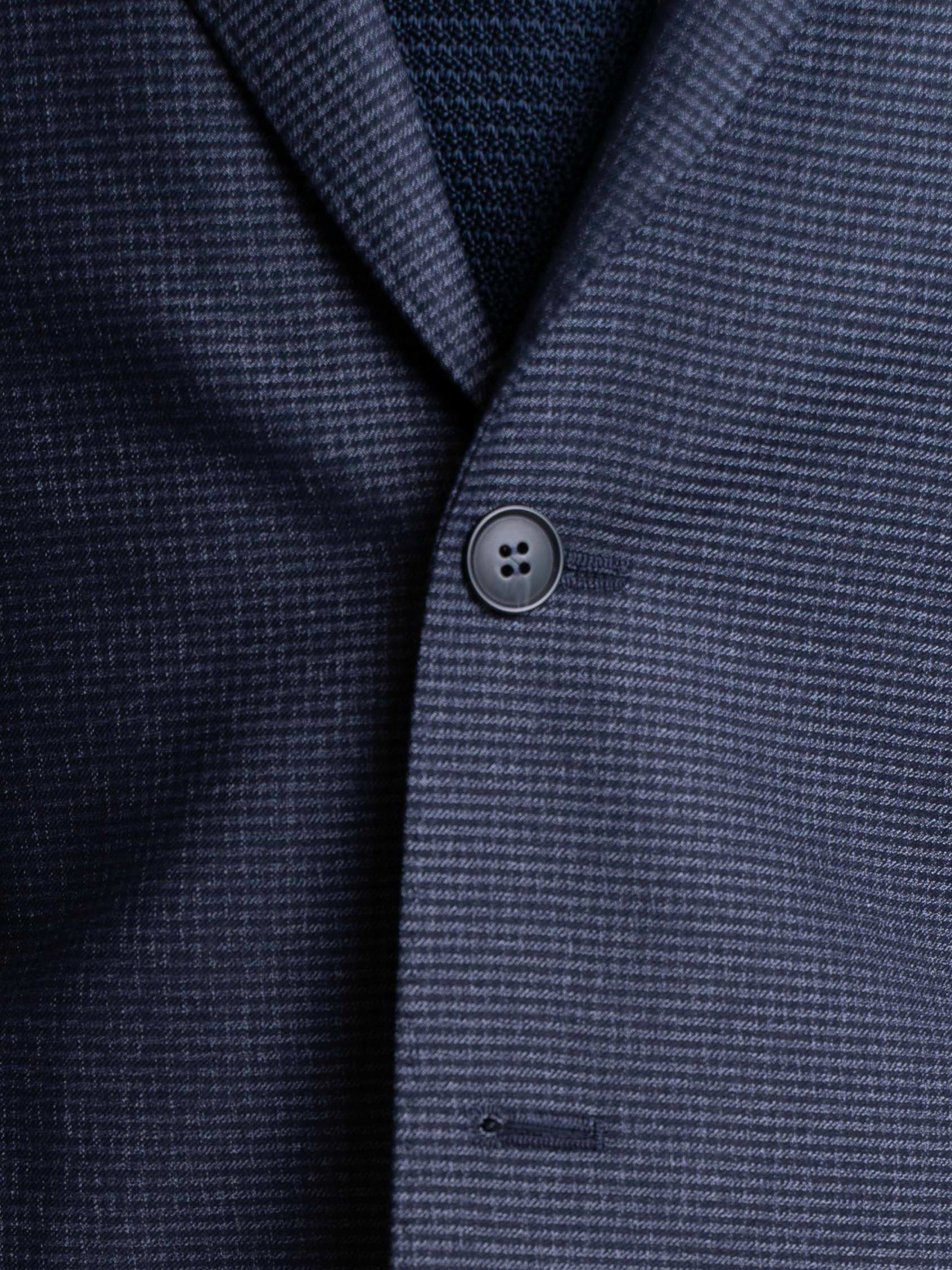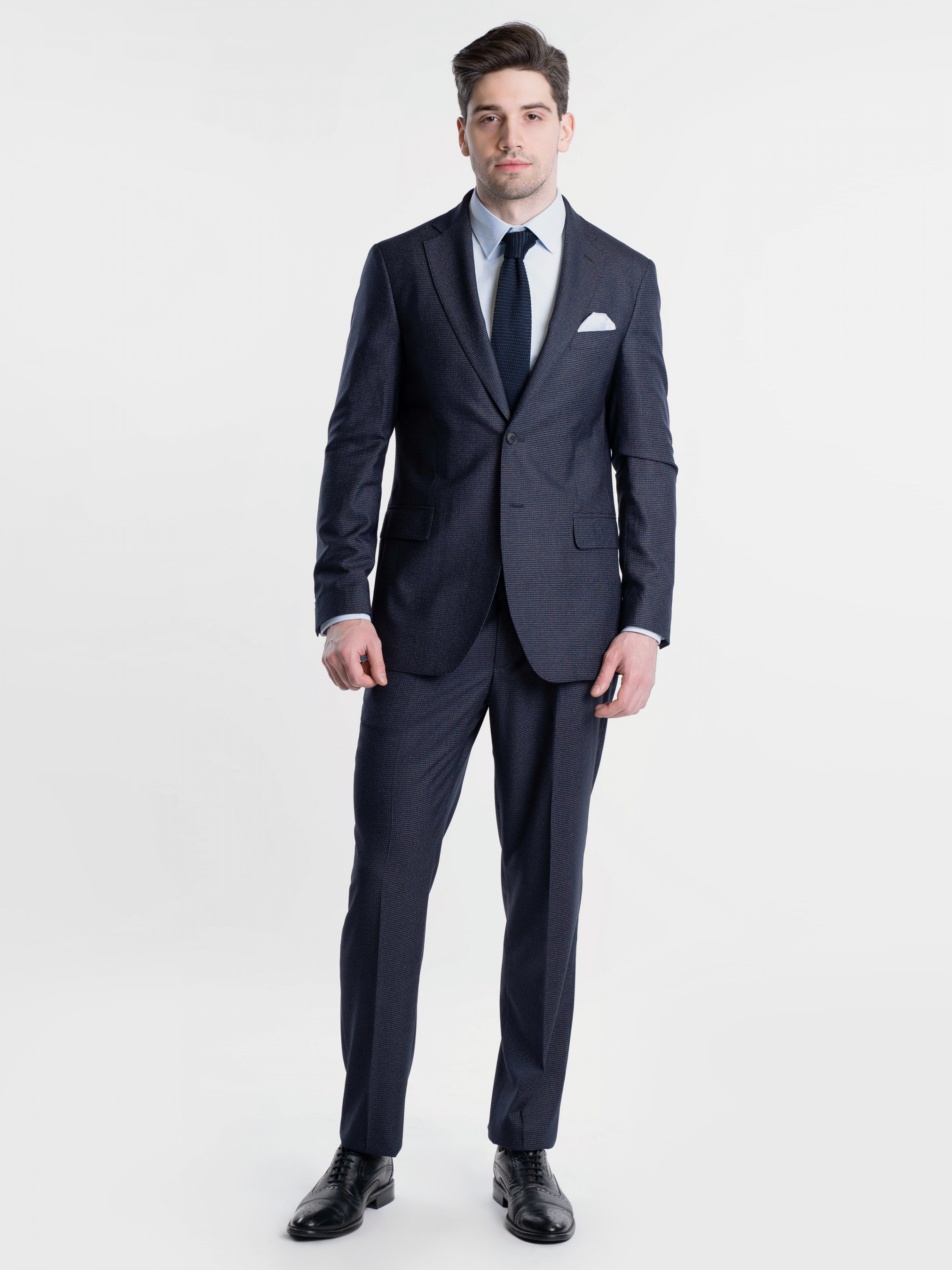 Чоловічий темно-синій костюм Arber, створений з інноваційної еластичної тканини на основі шовковистої віскози з еластаном, яка дозволяє відчувати себе комфортно, не мнеться, стійка до зносу. Модель піджака напівприлеглого силуету, однобортний на 2 ґудзики, з двома кишенями з клапаном та двома шліцами. Штани високої посадки, комфортні, завужені до низу, з одним защипом, із стрілками, з двома похилими кишенями з боків і двома задніми прорізними, із застібкою на блискавку та гудзик. Можна доповнити костюм жилетом з такої ж тканини M20.05.12.312. Комбінуючи костюм з різними сорочками, краватками або трикотажем ви отримаєте безліч варіантів елегантних та модних образів.