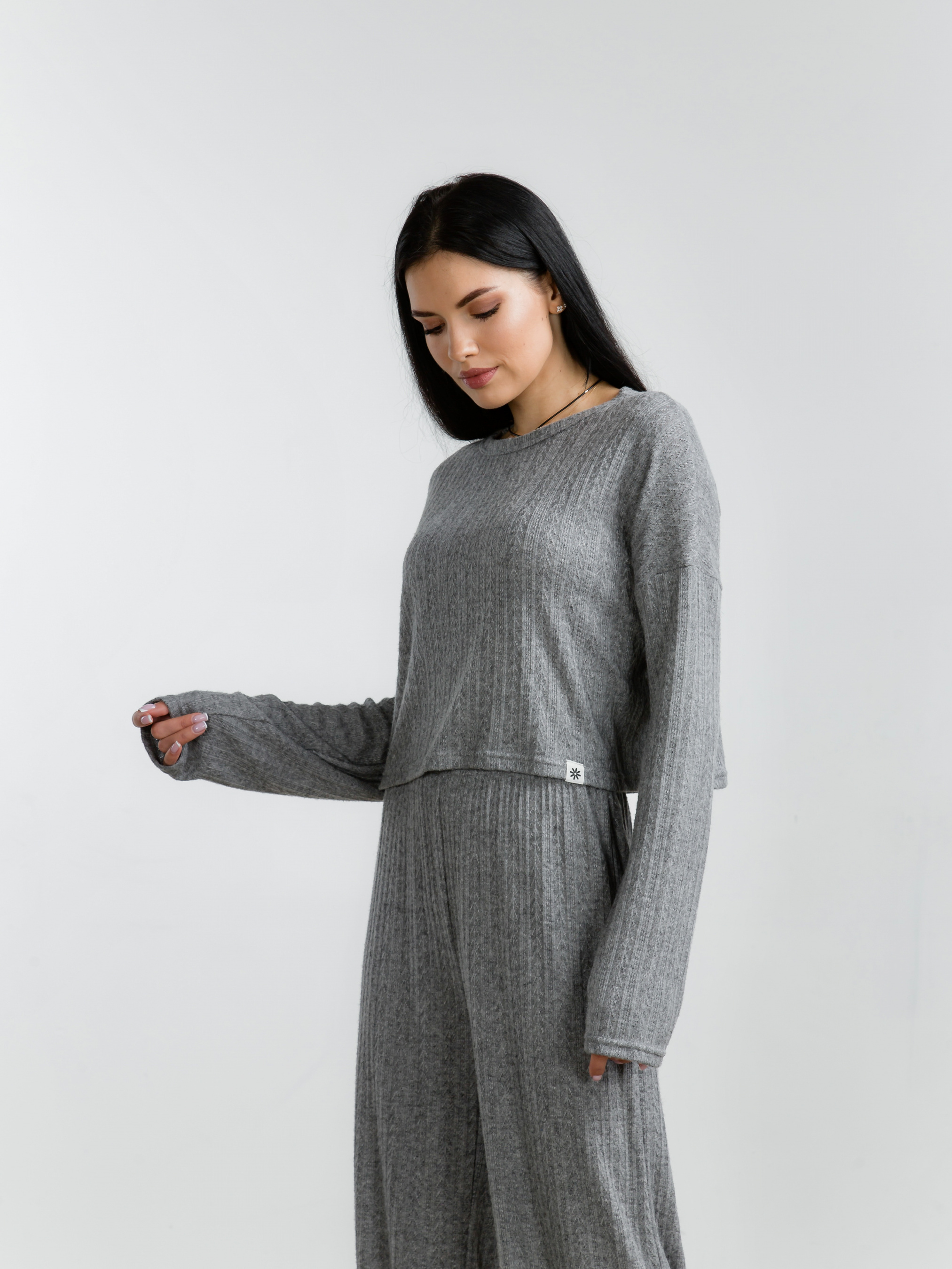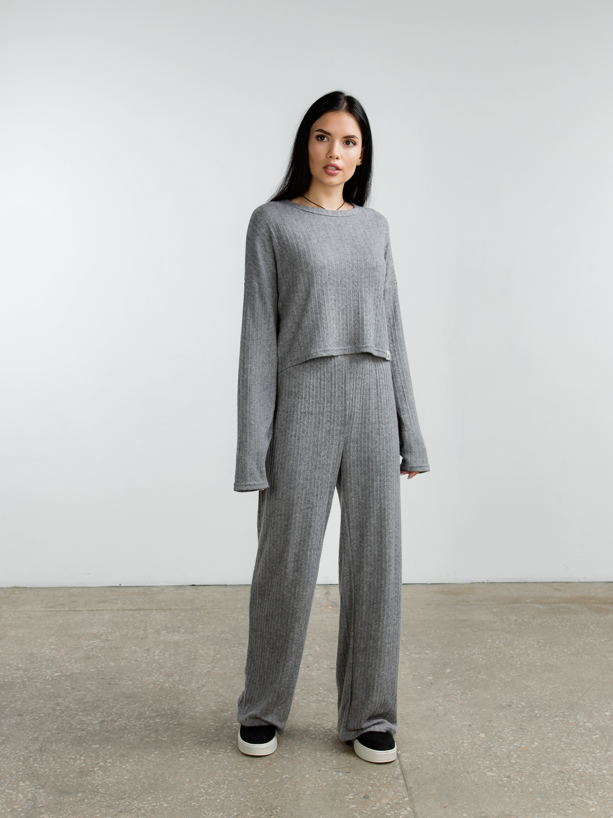 Комфортний трикотажний комплект, що складається з укороченої кофти та вільних штанів. Матеріал має фактурний малюнок, приємний до тіла. S-M : Довжина по внутрішньому шву : 73 см Довжина по зовнішньому шву : 104 см Довжина по спині : 41 см Довжина рукава : від спущеного шва 48 см Напівобхват грудей : 61 см Напівобхват стегон : 51 см Плечі : 61 см Посадка : 35 см Напівобхват талії : 33 см резинка M-L : Довжина по внутрішньому шву : 77 см Довжина по зовнішньому шву : 110 см Довжина по спині : 46 см Довжина рукава : від спущеного шва 54 см Напівобхват грудей : 63 см Напівобхват стегон : 53 см Плечі : 64 см Посадка : 36 см Напівобхват талії : 35 см резинка