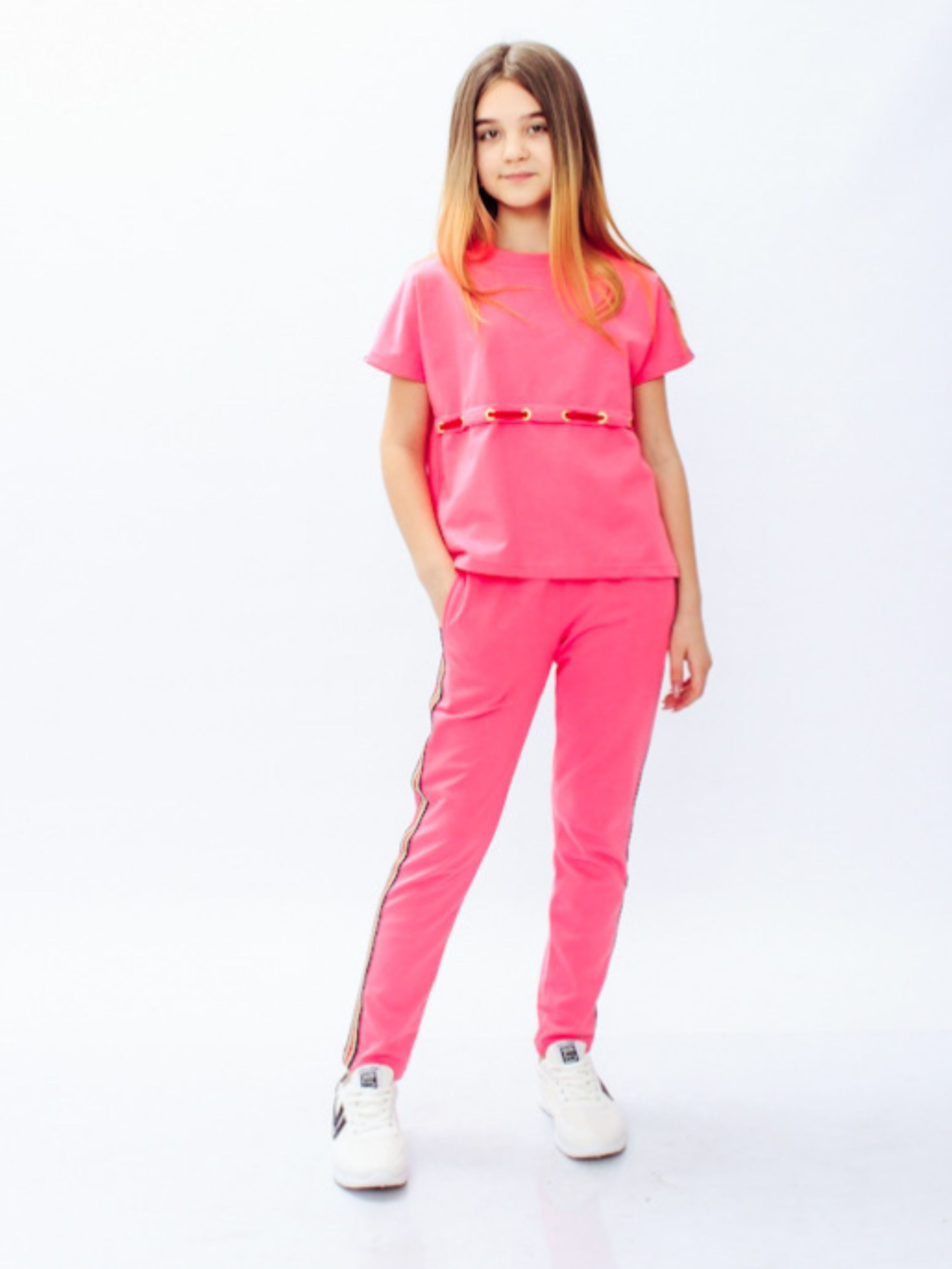 Полотно: двонитка однотонна Склад полотна: 80% бавовна 20% поліестр Зріст: 116-146 Відмінним варіантом для дівчинки стане красивий спортивний костюм що складається зі штанів і кофти. Спортивний костюм для дівчинки виконаний з однотонної двохнитки. Трикотажний одяг з двохнитки має високий теплозахист не схильний до розтягування мало мнеться відрізняється своїм повітрообміном і вологопоглинанням. Штани на комфортній гумці доповнені кишенями і прикрашені яскравою стрічкою з боків. Кофта з коротким рукавом прикрашена яскравою бейкою на рукавах і доповнена мотузкою на талії що є родзинкою даної моделі.