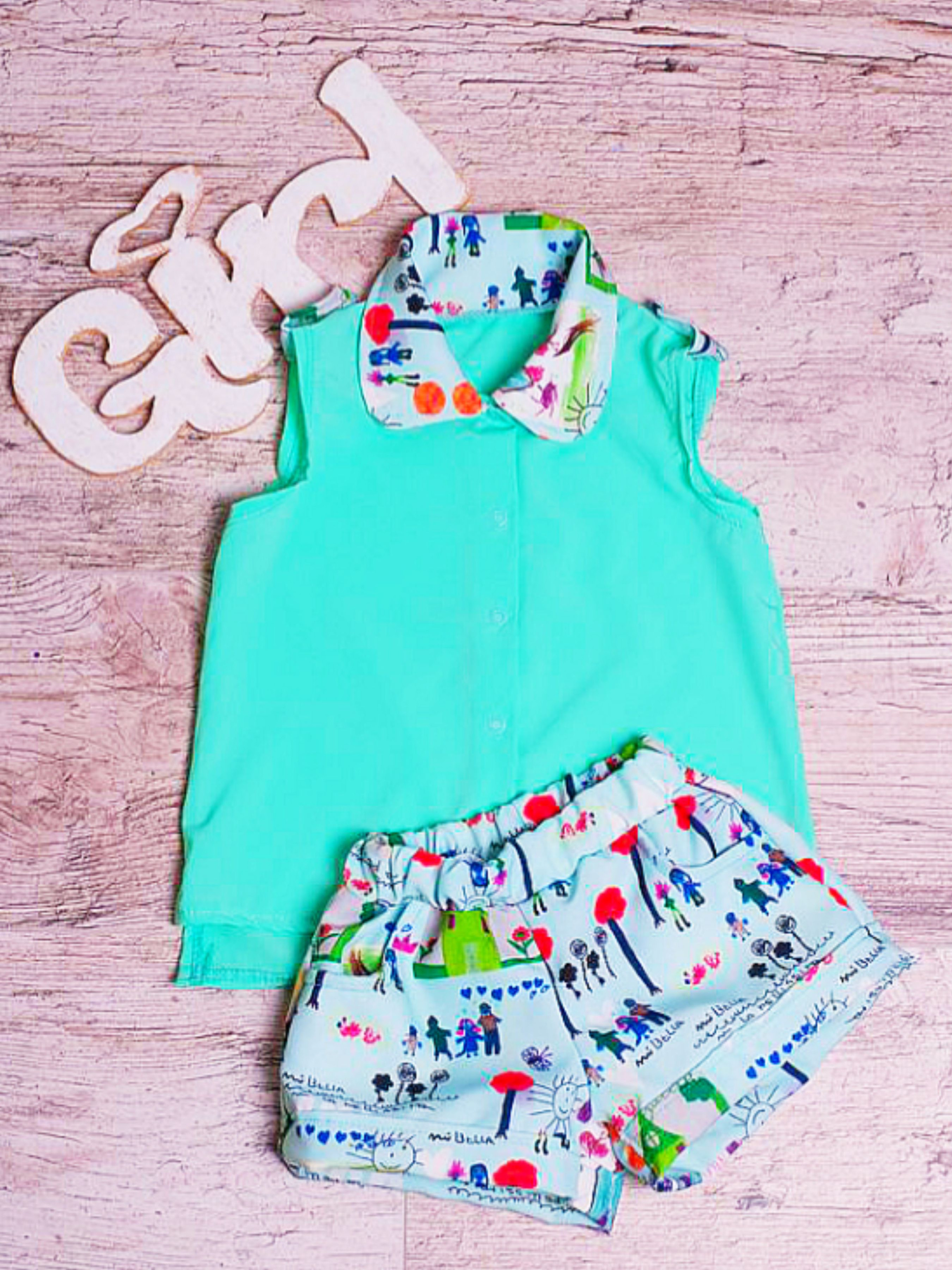 Полотно: софт набивний Склад полотна: 20% бавовни 80% поліестр Зріст: 98 Для маленьких модниць пропонується цікава модель - "двоєчка". Тонка стрейчева тканина додасть комфортність при носінні. Комплект складається з кофтинки на застібці з кнопками виконаний з однотонної тканини. Обробкою є закруглений комір із злегка поглибленим вирізом і нагону з кнопкою. Тут тканина кольорова строката як і на шортах. Низ кофтинки не рівний перед коротше від спинки на 5-7 см. в бічному шві маленькі розрізи. Шорти з такої ж кольорової тканини як обробка на кофті. Вони вільного крою короткі з кишенями по бічному шву. Низ шорт закінчується манжетом пояс притачний на резинці. Шорти і кофточка чудово гармонують в поєднанні.