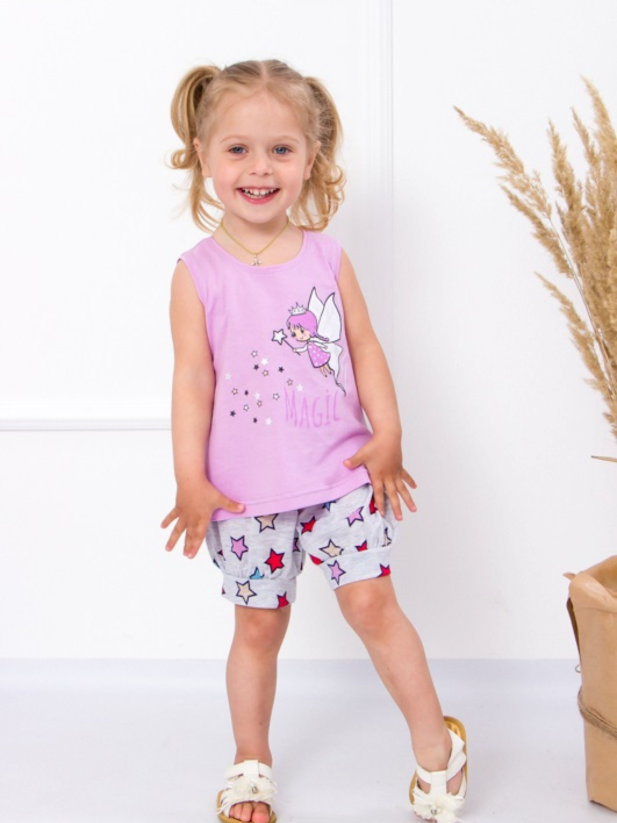 Полотно: кулір набивний кулір однотонний Склад полотна: 100% бавовна Зріст: 68-86 Комплект для дівчинки від торгової марки Носи Своє задовольняє найсуворіші вимоги батьків. У набір входить ошатна бузкова вкорочена сукня без рукавів і милі шортики "паж". Легкість образу додає принт дівчинки-ельфа. Шортики на еластичній резинці що добре сидять не перетискаючи ніжки. Комплект - відмінний варіант для походу в гості або прогулянки літнім днем в парку. Природні волокна не парять в жаркий день вбирають вологу і не викликають алергічних реакцій що важливо для ніжної шкіри новонародженого. Малятку комфортно в трикотажному вбранні і її рухи не скуті так як тканина тягнеться і м'яка на дотик. Комплект слід прати вручну або на делікатному режимі з м"якими засобами. В результаті міцності і зносостійкості натуральних ниток модель збереже свій колір і форму на довго.